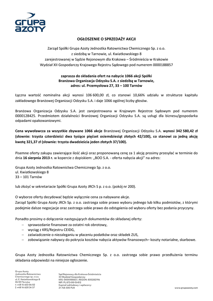 OGŁOSZENIE O SPRZEDAŻY AKCJI Zarząd Spółki Grupa Azoty Jednostka Ratownictwa Chemicznego Sp. z o.o. z siedzibą w Tarnowie, ul. Kwiatkowskiego 8 zarejestrowanej w Sądzie Rejonowym dla Krakowa – Śródmieścia w Krakowie Wydział XII Gospodarczy Krajowego Rejestru Sądowego pod numerem 0000188857 zaprasza do składania ofert na nabycie 1066 akcji Spółki Branżowa Organizacja Odzysku S.A. z siedzibą w Tarnowie, adres: ul. Przemysłowa 27, 33 – 100 Tarnów Łączna wartość nominalna akcji wynosi 106 600,00 zł, co stanowi 10,66% udziału w strukturze kapitału zakładowego Branżowej Organizacji Odzysku S.A. i daje 1066 ogólnej liczby głosów. Branżowa Organizacja Odzysku S.A. jest zarejestrowana w Krajowym Rejestrze Sądowym pod numerem 0000128425. Przedmiotem działalności Branżowej Organizacji Odzysku S.A. są usługi dla biznesu/gospodarka odpadami opakowaniowymi. Cena wywoławcza za wszystkie zbywane 1066 akcje Branżowej Organizacji Odzysku S.A. wynosi 342 580,42 zł (słownie: trzysta czterdzieści dwa tysiące pięćset osiemdziesiąt złotych 42/100), co stanowi za jedną akcję kwotę 321,37 zł (słownie: trzysta dwadzieścia jeden złotych 37/100). Pisemne oferty zakupu zawierające ilość akcji oraz proponowaną cenę za 1 akcję prosimy przesyłać w terminie do dnia 16 sierpnia 2013 r. w kopercie z dopiskiem: „BOO S.A. - oferta nabycia akcji” na adres: Grupa Azoty Jednostka Ratownictwa Chemicznego Sp. z o.o. ul. Kwiatkowskiego 8 33 – 101 Tarnów lub złożyć w sekretariacie Spółki Grupa Azoty JRCh S p. z o.o. (pokój nr 200). O wyborze oferty decydować będzie wyłącznie cena za nabywane akcje. Zarząd Spółki Grupa Azoty JRCh Sp. z o.o. zastrzega sobie prawo wyboru jednego lub kilku podmiotów, z którymi podejmie dalsze negocjacje oraz zastrzega sobie prawo do odstąpienia od wyboru oferty bez podania przyczyny. Ponadto prosimy o dołączenie następujących dokumentów do składanej oferty: sprawozdanie finansowe za ostatni rok obrotowy, wyciąg z KRS/Rejestru CEIDG, zaświadczenie o niezaleganiu w płaceniu podatków oraz składek ZUS, zobowiązanie nabywcy do pokrycia kosztów nabycia aktywów finansowych– koszty notarialne, skarbowe. Grupa Azoty Jednostka Ratownictwa Chemicznego Sp. z o.o. zastrzega sobie prawo przedłużenia terminu składania odpowiedzi na niniejsze ogłoszenie.