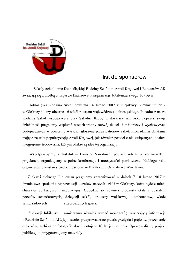 list do sponsorów Szkoły-członkowie Dolnośląskiej Rodziny Szkół im Armii Krajowej i Bohaterów AK zwracają się z prośbą o wsparcie finansowe w organizacji Jubileuszu swego 10 - lecia . Dolnośląska Rodzina Szkół powstała 14 lutego 2007 z inicjatywy Gimnazjum nr 2 w Oleśnicy i liczy obecnie 16 szkół z terenu województwa dolnośląskiego. Ponadto z naszą Rodziną Szkół współpracują dwa Szkolne Kluby Historyczne im. AK. Poprzez swoją działalność pragniemy wspierać wszechstronny rozwój dzieci i młodzieży i wychowywać podopiecznych w oparciu o wartości głoszone przez patronów szkół. Prowadzimy działania mające na celu popularyzację Armii Krajowej, jak również postaci z nią związanych, a także integrujemy środowiska, którym bliskie są idee tej organizacji. Współpracujemy z Instytutem Pamięci Narodowej poprzez udział w konkursach i projektach, organizujemy wspólne konferencje i uroczystości patriotyczne. Każdego roku organizujemy wystawy okolicznościowe w Kuratorium Oświaty we Wrocławiu. Z okazji pięknego Jubileuszu pragniemy zorganizować w dniach 7 i 8 lutego 2017 r. dwudniowe spotkanie reprezentacji uczniów naszych szkół w Oleśnicy, które będzie miało charakter edukacyjny i integracyjny. Odbędzie się również uroczysta Gala z udziałem pocztów sztandarowych, delegacji szkół, orkiestry wojskowej, kombatantów, władz samorządowych Z okazji Jubileuszu i zaproszonych gości. zamierzamy również wydać monografię zawierającą informacje o Rodzinie Szkół im. AK, jej historię, przeprowadzone przedsięwzięcia i projekty, prezentację członków, archiwalne fotografie dokumentujące 10 lat jej istnienia. Opracowaliśmy projekt publikacji i przygotowujemy materiały . Niestety jako szkoły nie jesteśmy w stanie udźwignąć kosztów wspomnianej imprezy i publikacji. Wierzymy w to, że nasze jubileuszowe plany tak jak patriotyczna działalność w ramach Rodziny Szkól im. AK i w środowisku lokalnym spotkają się z uznaniem i aprobatą władz samorządowych, instytucji a nawet osób prywatnych , które udzielą nam finansowego wsparcia niezbędnego do przygotowania Jubileuszu. Wszyscy sponsorzy zostaną uhonorowani wpisem w wydanej monografii. Pieniądze prosimy przesłać na konto Rada Rodziców w Gimnazjum nr 2 im. Armii Krajowej w Oleśnicy BANK SPÓŁDZIELCZY W OLEŚNICY, UL. WROCŁAWSKA 36, 56-400 OLEŚNICA NR RACHUNKU: 05958400082001001299320001 z dopiskiem Rodzina Szkół im. AK Z poważaniem Dorota Rasała – Świtoń – Dyrektor Gimnazjum nr 2 im. Armii Krajowej w Oleśnicy Grażyna Kantecka- Dyrektor Szkoły Podstawowej nr 2 im. Gen Leopolda Okulickiego Niedźwiadka w Trzebnicy Marta Przyślewicz – Chruszcz- Dyrektor Szkoły Podstawowej nr 30 im. Armii Krajowej w Wałbrzychu Anna Krupowicz- Dyrektor Gimnazjum nr 18 im. Armii Krajowej we Wrocławiu Barbara Dąbrowska – Bugaj- Dyrektor Szkoły Podstawowej nr 3 im. Armii Krajowej w Bolesławcu Aldona Olechno - Szkoła Podstawowa nr 28 Gen. Leopolda Okulickiego we Wrocławiu Katarzyna Ziajka- Dyrektor Publicznego Gimnazjum im. Armii Krajowej w Lubiążu Andrzej Skorecki- Dyrektor Zespołu Szkół w Niechlowie Zuzanna Hauza- Dyrektor Gimnazjum im. Armii Krajowej w Żórawinie Jacek Matusiewicz-Dyrektor Zespołu Szkół Publicznych w Prusach Lucyna Cempel- Dyrektor Szkoły Podstawowej nr 23 gen. Stefana „Grota” Roweckiego we Wrocławiu Dorota Pisklewicz-Dyrektor Gimnazjum nr 39 im. Rotmistrza Witolda Pileckiego we Wrocławiu Iwona Lewandowska- Maćkowiak- Dyrektor I Liceum Ogólnokształcącego im. Armii Krajowej w Miliczu Grażyna Ziółkowska-Dyrektor Gimnazjum nr 1 z Oddziałami Dwujęzycznymi im. Armii Krajowej w Strzelinie Anna Klimkowska – Dyrektor Gimnazjum Gminy Oleśnica im. Szarych Szeregów w Oleśnicy Leszek Duszyński- Dyrektor Liceum Ogólnokształcące nr VII im. Krzysztofa Kamila Baczyńskiego we Wrocławiu Jolanta Sawicka – Dyrektor Szkoły Podstawowej nr 93 im. Tradycji Orła Białego we Wrocławiu Renata Fluder – Dyrektor Gimnazjum nr 3 im. Mistrzów Olimpijskich we Wrocławiu