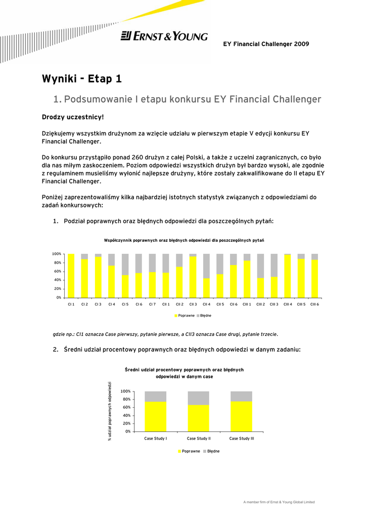 EY Financial Challenger 2009 Wyniki - Etap 1 1. Podsumowanie I etapu konkursu EY Financial Challenger Drodzy uczestnicy! Dziękujemy wszystkim drużynom za wzięcie udziału w pierwszym etapie V edycji konkursu EY Financial Challenger. Do konkursu przystąpiło ponad 260 drużyn z całej Polski, a także z uczelni zagranicznych, co było dla nas miłym zaskoczeniem. Poziom odpowiedzi wszystkich drużyn był bardzo wysoki, ale zgodnie z regulaminem musieliśmy wyłonić najlepsze drużyny, które zostały zakwalifikowane do II etapu EY Financial Challenger. Poniżej zaprezentowaliśmy kilka najbardziej istotnych statystyk związanych z odpowiedziami do zadań konkursowych: 1. Podział poprawnych oraz błędnych odpowiedzi dla poszczególnych pytań: Współczynnik poprawnych oraz błędnych odpowiedzi dla poszczególnych pytań 100% 80% 60% 40% 20% 0% CI 1 CI 2 CI 3 CI 4 CI 5 CI 6 CI 7 CII 1 CII 2 CII 3 Poprawne CII 4 CII 5 CII 6 CIII 1 CIII 2 CIII 3 CIII 4 CIII 5 CIII 6 Błędne gdzie np.: CI1 oznacza Case pierwszy, pytanie pierwsze, a CII3 oznacza Case drugi, pytanie trzecie. 2. Średni udział procentowy poprawnych oraz błędnych odpowiedzi w danym zadaniu: % udział poprawnych odpowiedzi Średni udział procentowy poprawnych oraz błędnych odpowiedzi w danym case 100% 80% 60% 40% 20% 0% Case Study I Case Study II Poprawne Case Study III Błędne A member firm of Ernst & Young Global Limited EY Financial Challenger 2009 3. Wykres przedstawiający ilość drużyn, które uzyskały daną liczbę punktów, spośród wszystkich drużyn biorących udział w konkursie: 30 Ilość drużyn z daną punktacją 25 20 15 10 5 0 1 2 3 4 5 6 7 8 9 10 11 12 13 14 15 16 17 18 19 Liczba uzyskanych punktów Zgodnie z zaprezentowanymi statystykami (1) można zauważyć, że najtrudniejszymi pytaniami okazały się: CII4, CII5, CIII2 oraz CIII3. W ostatniej części niniejszego dokumentu znajdziecie poprawne odpowiedzi na te pytania wraz z wyjaśnieniami. 2. Zespoły zakwalifikowane do II etapu EY Financial Challenger Poniżej prezentujemy nazwy zespołów, które zakwalifikowały się do II etapu EY Financial Challenger (nazwy zespołów przedstawione zostały w porządku alfabetycznym): @nalytics 3P+B A.K.K. team AE K&K AE Poznań AeDVISORS AEP Amigos Aureus Taurus Bad boys Barbarians at the Gate Big Trio BLOCKHOLDERS Blueprint Bonito Bracia Boba Brothers in case Brothers of Cash Caerdydd Wales CBA Crossfire Czerwone szelki DARK ORANGE Dealbreakers Dealers Doughnuts Ekonomiczne centusie elite_crew ELO Team 2008 Execon FC PARTNERS First Team Fred Finance GBiPŚ Grupa Trzymająca Władzę Gumisie A member firm of Ernst & Young Global Limited EY Financial Challenger 2009 INIEMAMOCNI Innerlook Interesting mix JMS Kindisch&Old KLM KMKM Challenger KNEPO Kreatywni Ladies Lcrew Los Armadillos lucky river M17 MAPA Masa Upadłościowa MATA MDAP Meritum MKWS MLG Advisors MMAT TEAM MMKS MTM Partners Nightmares Oko audytora Omnia sunt interpretanda Pakerzy Perfect Pierniczki Podstępne Bambusy Przyjaciele Alicji z krainy prohibicji S.M.S. SIME Specjaliści Sprawcy Kryzysu Spryciarze Stare Pierniki Szczecin Tułacze Tytani Pracy UEK Zadruga UEP V Kolumna VAT VECCHIA ROMAGNA VersaCo VIRGINS Winners WLAD You can MA ZaDyMa Gratulujemy wszystkim zespołom, które zakwalifikowały się do II etapu EY Financial Challenger i życzymy powodzenia w kolejnych etapach. Wszelkie informacje związane z uczestnictwem w II etapie zostaną przekazane do zakwalifikowanych drużyn drogą elektroniczną. Dodatkowe upominki od firmy Ernst & Young związane z przysłaniem poprawnych odpowiedzi (pozwalających na zakwalifikowanie się do II etapu) jako jeden z pierwszych 20 zespołów otrzymują: M17 Fred Finance Sprawcy Kryzysu VAT MAPA AE Poznań VECCHIA ROMAGNA BLOCKHOLDERS KMKM Challenger First Team AE K&K MATA Interesting mix A.K.K. team CBA INIEMAMOCNI Oko audytora Los Armadillos Brothers in case Masa Upadłościowa EY Financial Challenger 2009 3. Przykładowe rozwiązania najtrudniejszych zadań Poniżej zaprezentowane zostały rozwiązania dotyczące najtrudniejszych pytań konkursu, wraz z wyjaśnieniami: A. CII4 Niniejsze zadanie, pomimo wydawało się pozornie łatwe, sprawiło uczestnikom konkursu sporo trudności. Analiza wybranych wskaźników dla ABC i porównanie ich wartości do informacji zawartych w Tabeli 3 wskazywałaby, że właściwym ratingiem dla spółki ABC byłby BBB. Fine Investments posiada zatem obligacje spółki, dla której fundamentalne wskaźniki są bliskie wskaźnikom dla obligacji BBB, dla których spread rynkowy wynosiłby 1,71%. Bieżący spread dla obligacji ABC wynosi jednak 1,42% - a zatem fundusz zarabia potencjalnie mniej niż hipotetycznie powinien z obligacji o jakości porównywalnej do obligacji ABC, a więc należy te instrumenty sprzedać. Prawidłową odpowiedzią jest zatem odpowiedź D: „sprzedać obligacje ABC ponieważ wskaźniki finansowe dla ABC odpowiadają obligacjom o ratingu BBB”. B. CII5 Odpowiedź A była nieprawidłowa, gdyż wartość akcji ABC oszacowana na podstawie mnożnika P/E wyniosłaby 19,7 PLN (P/E = 24x; EPS=0,82 PLN). Mnożnik P/E jest bardzo często wykorzystywany w analizie, natomiast nie jest on bezwzględnie najlepszym mnożnikiem przy każdej wycenie. Wady mnożnika P/E związane są między innymi z wadami zysku netto jako wartości czysto księgowej, nie związanej z rzeczywistymi cash flows spółki, oraz na którą wpływ mają zdarzenia jednorazowe. Mnożnik P/E jest mnożnikiem opartym o 1) kapitalizację rynkową (P), która odzwierciedla wartość rynkową kapitałów własnych spółki oraz 2) zysk netto (E), czyli wynik spółki po kosztach odsetkowych (czyli po wynagrodzeniu dawców kapitału obcego). Obie te wielkości (P i E) są dostępne tylko dla dawców kapitału własnego. Prawidłową odpowiedzią jest zatem odpowiedź D: „mnożnik P/E charakteryzuje się spójnością licznika i mianownika (tj. zarówno licznik i mianownik dotycz