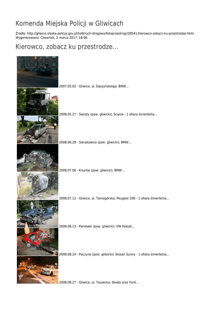 Komenda Miejska Policji w Gliwicach Źródło: http://gliwice.slaska.policja.gov.pl/ka9/ruch-drogowy/fotoprzestrogi/28541,Kierowco-zobacz-ku-przestrodze.html Wygenerowano: Czwartek, 2 marca 2017, 18:06 Kierowco, zobacz ku przestrodze... 2007.05.02 - Gliwice, ul. Daszyńskiego; BMW... 2008.05.27 - Sieroty (pow. gliwicki); Scania - 1 ofiara śmiertelna... 2008.06.29 - Sierakowice (pow. gliwicki); BMW... 2008.07.06 - Knurów (pow. gliwicki); BMW... 2008.07.12 - Gliwice, ul. Tarnogórska; Peugeot 206 - 1 ofiara śmiertelna... 2008.08.13 - Paniówki (pow. gliwicki); VW Passat... 2008.08.24 - Paczyna (pow. gliwicki); Nissan Sunny - 1 ofiara śmiertelna... 2008.08.27 - Gliwice, ul. Toszecka; Skoda oraz Ford... 2008.09.21 - Wilcza (pow. Gliwicki); Skoda Superb... 2008.09.25 - Knurów (pow. gliwicki); motocykl Honda... 2008.10.14 - Smolnica (pow. gliwicki); Skoda Favorit... 2008.10.16 - Gliwice, ul. Wyczółkowskiego; Scania z naczepą, motorower King Way - 1 ofiara śmiertelna... 2008.10.21 - Gliwice, DK-88; Fiat Cinquecento... 2008.11.05 - Tworóg Mały, rejon przejazdu kolejowego; Ford Escort po zderzeniu z lokomotywą TEM 2 pociągu towarowego... 2008.11.05 - Tworóg Mały, przejazd kolejowy; Ford Escort po zderzeniu z pociągiem... 2008.11.16 - Gliwice, DK-88; BMW 318 i Peugeot 406... 2008.11.21 - Gliwice, A-4; Audi 80, Audi A4 i Ford Mondeo... 2008.11.27 - Gliwice, Strzelców Bytomskich-Czołgowa; Autobus Solbus po zderzeniu z ciężarówką Iveco... 2008.11.27 - Gliwice, Strzelców Bytomskich-Czołgowa; Ciężarówka Iveco... 2008.12.22 - Gliwice, Zabrska; Rozbity Nissan Sunny i Opel Omega - efekt ucieczki sprawcy przestępstwa, kierował Nissanem... 2008.12.22 - Gliwice, Królewskiej Tamy-Baildona; VW Passat... 2008.12.28 - Knurów, Niepodległości; Ford Fiesta - 1 ofiara śmiertelna... 2008.12.28 - Knurów, Niepodległości; Mercedes C180... 2008.12.30 - Gliwice, Bardowskiego; Honda... 2009.01.02 - Gliwice, DK-88; Opel Corsa... 2009.01.07 - Łany Małe, A-4; Hyundai Atos... 2009-01-08 - Pyskowice, ul. Gliwicka; Ciężarówka DAF po pożarze i wybuchu butli gazowej... 2009.01.18 - Gliwice, Daszyńskiego; Autobus marki SOR... 2009.01.18 - Gliwice, Daszyńskiego; Mercedes B180... Ocena: 4/5 (6) Tweetnij