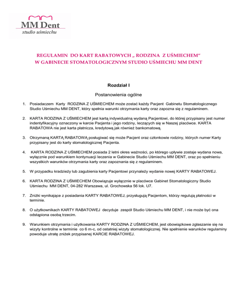 REGULAMIN DO KART RABATOWYCH „ RODZINA Z UŚMIECHEM” W GABINECIE STOMATOLOGICZNYM STUDIO UŚMIECHU MM DENT Rozdział I Postanowienia ogólne 1. Posiadaczem Karty RODZINA Z UŚMIECHEM może zostać każdy Pacjent Gabinetu Stomatologicznego Studio Uśmiechu MM DENT, który spełnia warunki otrzymania karty oraz zapozna się z regulaminem. 2. KARTA RODZINA Z UŚMIECHEM jest kartą indywidualną wydaną Pacjentowi, do której przypisany jest numer indentyfikacyjny oznaczony w karcie Pacjenta i jego rodziny, leczących się w Naszej placówce. KARTA RABATOWA nie jest karta płatnicza, kredytową jak również bankomatową. 3. Otrzymaną KARTĄ RABATOWĄ posługiwać się może Pacjent oraz członkowie rodziny, których numer Karty przypisany jest do karty stomatologicznej Pacjenta. 4. KARTA RODZINA Z UŚMIECHEM posiada 2 letni okres ważności, po którego upływie zostaje wydana nowa, wyłącznie pod warunkiem kontynuacji leczenia w Gabinecie Studio Uśmiechu MM DENT, oraz po spełnieniu wszystkich warunków otrzymania karty oraz zapoznania się z regulaminem. 5. W przypadku kradzieży lub zagubienia karty Pacjentowi przynależy wydanie nowej KARTY RABATOWEJ. 6. KARTA RODZINA Z UŚMIECHEM Obowiązuje wyłącznie w placówce Gabinet Stomatologiczny Studio Uśmiechu MM DENT, 04-282 Warszawa, ul. Grochowska 56 lok. U7. 7. Zniżki wynikające z posiadania KARTY RABATOWEJ, przysługują Pacjentom, którzy regulują płatności w terminie. 8. O użytkownikach KARTY RABATOWEJ decyduje zespół Studio Uśmiechu MM DENT, i nie może być ona odstąpiona osobą trzecim. 9. Warunkiem otrzymania i użytkowania KARTY RODZINA Z UŚMIECHEM, jest obowiązkowe zgłaszanie się na wizyty kontrolne w terminie co 6 m-c, od ostatniej wizyty stomatologicznej. Nie spełnienie warunków regulaminy powoduje utratę zniżek przypisanej KARCIE RABATOWEJ. Rozdział II Zasady Promocji Użytkownik ważnej KARTY RODZINA Z UŚMIECHEM, ma prawo do skorzystania z rabatu przypisanego Posiadaczom KARTY RABATOWEJ. Wysokość rabatu określona jest w Regulaminie dostępnym w rejestracji oraz na stronie gabinetu www.mmdent.waw.pl 1. Rabat KARTY RODZINA Z USMIECHEM dotyczy wszystkich usług stomatologicznych. 2. Rabatem nazywamy procentowa wartość upustu naliczonego od wartości usługi określonej w obowiązującym cenniku Gabinetu Stomatologicznego Studio Uśmiechu MM DENT 3. Wartość rabatów przysługująca z posiadania KARTY RABATOWEJ, przypisana jest Pacjentowi, którego najbliższa rodzina w rozumienia małżonkowie, dzieci, rodzice pozostający w wspólnym gospodarstwie domowym ( co najmniej 2 osoby), korzystają z usług Naszego gabinetu. Na leczenie stomatologiczne z wyłączeniem protetyki oraz implantologii przysługuje 10% rabat. Na leczenie protetyczne oraz implantologiczne Pancjentom przypisana jest 5 % zniżka rabatowa. 4. Gabinet Stomatologiczny Studio Uśmiechu MM DENT, może tworzyć dla posiadaczy KARTY RODZINA Z UŚMIECHEM, nadprogramowe promocje, o których będzie informować za pośrednictwem: naszej strony internetowej www.mmdent.waw.pl naszej strony na Facebooku: (https://www.facebook.com/STUDIOUSMIECHUMMDENT) 5. KARTA RODZINA Z UŚMIECHEM nie łączy się z innymi rabatami. Rozdział III Zmiany Regulaminu Programu Gabinet Stomatologiczny Studio Uśmiechu MM DENT zastrzega sobie prawo do zmiany warunków regulaminu w dowolnym momencie , z zobowiązaniem o poinformowaniu o zmianach na stronie internetowej www.mmdent.waw.pl. Rozdział IV Postanowienia Końcowe 1. Warunkiem świadczenia usług stomatologicznych W Gabinecie Stomatologicznym Studio Uśmiechu MM DENT, na rzecz posiadacza KARTY RODZINA Z UŚMIECHEM jest wyrażenie przez Pacjenta zgody na przetwarzanie jego danych osobowych podczas aktywacji KARTY. 2. Wyłącznym administratorem danych Posiadacza KARTY RABATOWEJ jest Gabinet Stomatologiczny Studio Uśmiechu MM DENT. 3. Warunkiem otrzymania KARTY RODZINA Z UŚMIECHEM jest zapoznanie się i zaakceptowanie warunków Regulaminu. 4. Wszelkie zapisy zawarte w Regulaminie stanowią wartość nadrzędną w mocy regulowania.