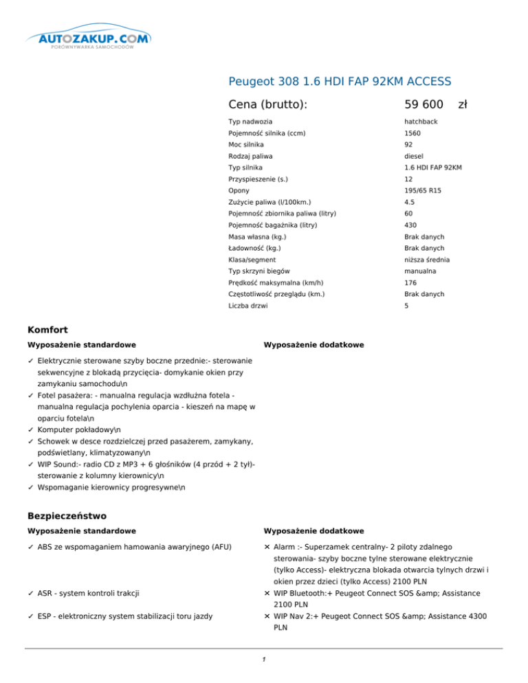 Peugeot 308 1.6 HDI FAP 92KM ACCESS Cena (brutto): 59 600 zł Typ nadwozia hatchback Pojemność silnika (ccm) 1560 Moc silnika 92 Rodzaj paliwa diesel Typ silnika 1.6 HDI FAP 92KM Przyspieszenie (s.) 12 Opony 195/65 R15 Zużycie paliwa (l/100km.) 4.5 Pojemność zbiornika paliwa (litry) 60 Pojemność bagażnika (litry) 430 Masa własna (kg.) Brak danych Ładowność (kg.) Brak danych Klasa/segment niższa średnia Typ skrzyni biegów manualna Prędkość maksymalna (km/h) 176 Częstotliwość przeglądu (km.) Brak danych Liczba drzwi 5 Komfort Wyposażenie standardowe Wyposażenie dodatkowe ✓ Elektrycznie sterowane szyby boczne przednie:- sterowanie sekwencyjne z blokadą przycięcia- domykanie okien przy zamykaniu samochodu\n ✓ Fotel pasażera: - manualna regulacja wzdłużna fotela manualna regulacja pochylenia oparcia - kieszeń na mapę w oparciu fotela\n ✓ Komputer pokładowy\n ✓ Schowek w desce rozdzielczej przed pasażerem, zamykany, podświetlany, klimatyzowany\n ✓ WIP Sound:- radio CD z MP3 + 6 głośników (4 przód + 2 tył)sterowanie z kolumny kierownicy\n ✓ Wspomaganie kierownicy progresywne\n Bezpieczeństwo Wyposażenie standardowe Wyposażenie dodatkowe ✓ ABS ze wspomaganiem hamowania awaryjnego (AFU) ✕ Alarm :- Superzamek centralny- 2 piloty zdalnego sterowania- szyby boczne tylne sterowane elektrycznie (tylko Access)- elektryczna blokada otwarcia tylnych drzwi i okien przez dzieci (tylko Access) 2100 PLN ✓ ASR - system kontroli trakcji ✕ WIP Bluetooth:+ Peugeot Connect SOS & Assistance ✓ ESP - elektroniczny system stabilizacji toru jazdy ✕ WIP Nav 2:+ Peugeot Connect SOS & Assistance 4300 2100 PLN PLN 1 ✓ Kontrolki niezapiętych pasów z przodu z funkcją ostrzegania o wypięciu pasów\n ✓ Mechaniczna blokada otwarcia tylnych drzwi przez dzieci\n ✓ Mocowania fotelika dziecięcego Isofix (x2, dla SW x3) w drugim rzędzie siedzeń\n ✓ Pasy bezpieczeństwa w drugim rzędzie 3-punktowe (ograniczniki napięcia na miejscach skrajnych)\n ✓ Poduszki boczne w pierwszym rzędzie foteli\n ✓ Poduszki czołowe dla kierowcy i pasażera (pasażera z możliwością dezaktywacji)\n ✓ Poduszki kurtynowe dla pierwszego i drugiego rzędu foteli\n ✓ Przednie pasy bezpieczeństwa z regulacją wysokości położenia + napinacze i ograniczniki siły napięcia\n ✓ Przednie światła LED do jazdy dziennej\n ✓ REF - elektroniczny rozdzielacz siły hamowania oś przednia/tylna\n ✓ Reflektory przednie halogenowe\n ✓ Regulator i ogranicznik prędkości ze sterowaniem z kolumny kierownicy\n ✓ System tylnego oświetlenia z funkcją ostrzegania innych użytkowników drogi przy nagłym hamowaniu pojazdu\n Dodatki Wyposażenie standardowe Wyposażenie dodatkowe ✓ Automatyczne włączanie świateł do jazdy dziennej ✕ Felgi aluminiowe 16" Santiaguito 2 i opony 205/55 R16Koło zapasowe pełnowymiarowe stalowe 16" 2300 PLN ✓ Boczne listwy ochronne w kolorze nadwozia ✕ Klimatyzacja automatyczna dwustrefowa + filtr ✓ Centralny zamek sterowany pilotem:- jeden pilot zdalnego ✕ Lakier metalizowany 1950 PLN przeciwpyłkowy z węglem aktywnym 1500 PLN sterowania- blokowanie drzwi podczas ruszania ✓ Chromowana listwa ochraniająca próg bagażnika (tylko ✕ Siatka oddzielająca przestrzeń bagażową (tylko kombi / SW) kombi / SW) ✓ Deska rozdzielcza z konsolą w kolorze szarym Warm Silver 450 PLN ✕ WIP Bluetooth:- podłokietnik centralny z przodu z regulacją położenia + schowek- zestaw głośnomówiący bluetoothgniazdo USB w podłokietniku centralnym z przodu- funkcja przesyłania muzyki Streaming Audio- monochromatyczny wyświetlacz graficzny C- (tylko 1100 PLN ✓ Dwa uchwyty na napoje w konsoli środkowej ✕ WIP Nav 2:- WIP Bluetooth- nawigacja satelitarna z mapą Europy na dysku twardym- kolorowy wyświetlacz LCD 7" na desce rozdzielczej- radio CD z MP3 + 6 głośników (4 przód + 2 tył)- sterowanie z kolumny kierownicy- gniazdo RCA audio w zamykanym schowku prze 3300 PLN ✓ Felgi stalowe 15" z kołpakami Atacama i opony 195/65 R15Koło zapasowe pełnowymiarowe stalowe 15"\n ✓ Fotel kierowcy:- manualna regulacja wzdłużna fotelamanualna regulacja pochylenia oparcia- manualna regulacja wysokości fotela\n ✓ 2 Gniazdo 12V w bagażniku (tylko kombi / SW)\n 3 ✓ Immobiliser\n ✓ Kierownica 3-ramienna z tworzywa sztucznego\n ✓ Kieszenie w drzwiach bocznych z przodu i z tyłu\n ✓ Klamki wewnętrzne chromowane\n ✓ Klamki zewnętrzne w kolorze nadwozia\n ✓ Klimatyzacja manualna jednostrefowa + filtr przeciwpyłkowy\n ✓ Lakier niemetalizowany\n ✓ Lusterka boczne sterowane i podgrzewane elektrycznie + zintegrowane migacze\n ✓ Lusterka boczne w kolorze nadwozia\n ✓ Monochromatyczny wyświetlacz numeryczny A+ na desce rozdzielczej (brak przy wyborze WIP Nav 2)\n ✓ Oświetlenie wnętrza:- 1 lampka centralna + 2 lampki do czytania w konsoli sufitowej z przodu- 1 lampka centralna w drugim rzędzie foteli- oświetlenie bagażnika (w kombi dodatkowo lampka sufitowa)\n ✓ Osłony przeciwsłoneczne z lusterkami dla kierowcy i pasażera\n ✓ Przedni zderzak z czarnym matowym wlotem powietrza do silnika+ chromowane obramowanie\n ✓ Przednia szyba akustyczna\n ✓ Reflektory przednie przeciwmgielne\n ✓ Regulacja kolumny kierownicy manualna w dwóch płaszczyznach\n ✓ Relingi dachowe w kolorze aluminium (tylko SW)\n ✓ Relingi dachowe w kolorze czarnym (tylko kombi)\n ✓ Roleta przestrzeni bagażowej\n ✓ Schowek w tylnej części konsoli środkowej (tylko kombi / SW)\n ✓ Schowki otwarte:- po stronie kierowcy w desce rozdzielczejna desce rozdzielczej poniżej radia- wnęka poniżej popielniczki- w konsoli centralnej pomiędzy przednimi fotelami (tylko Access)\n ✓ Składany haczyk na torbę po stronie pasażera z przodu (na boku konsoli centralnej)\n ✓ szyby barwione\n ✓ Tapicerka siedzeń tkaninowa\n ✓ Tylna kanapa ze składanym i dzielonym asymetrycznie oparciem\n ✓ Tylna szyba ogrzewana + wycieraczka\n ✓ 