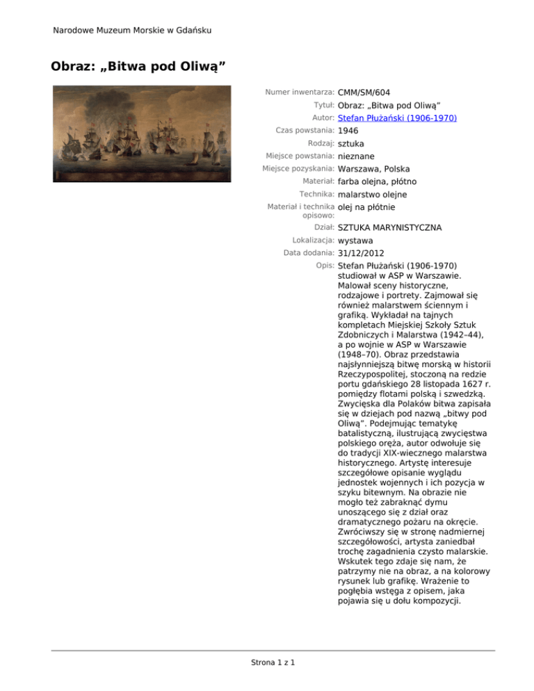 Narodowe Muzeum Morskie w Gdańsku Obraz: „Bitwa pod Oliwą” Numer inwentarza: CMM/SM/604 Tytuł: Obraz: „Bitwa pod Oliwą” Autor: Stefan Płużański (1906-1970) Czas powstania: 1946 Rodzaj: sztuka Miejsce powstania: nieznane Miejsce pozyskania: Warszawa, Polska Materiał: farba olejna, płótno Technika: malarstwo olejne Materiał i technika olej na płótnie opisowo: Dział: SZTUKA MARYNISTYCZNA Lokalizacja: wystawa Data dodania: 31/12/2012 Opis: Stefan Płużański (1906-1970) studiował w ASP w Warszawie. Malował sceny historyczne, rodzajowe i portrety. Zajmował się również malarstwem ściennym i grafiką. Wykładał na tajnych kompletach Miejskiej Szkoły Sztuk Zdobniczych i Malarstwa (1942–44), a po wojnie w ASP w Warszawie (1948–70). Obraz przedstawia najsłynniejszą bitwę morską w historii Rzeczypospolitej, stoczoną na redzie portu gdańskiego 28 listopada 1627 r. pomiędzy flotami polską i szwedzką. Zwycięska dla Polaków bitwa zapisała się w dziejach pod nazwą „bitwy pod Oliwą”. Podejmując tematykę batalistyczną, ilustrującą zwycięstwa polskiego oręża, autor odwołuje się do tradycji XIX-wiecznego malarstwa historycznego. Artystę interesuje szczegółowe opisanie wyglądu jednostek wojennych i ich pozycja w szyku bitewnym. Na obrazie nie mogło też zabraknąć dymu unoszącego się z dział oraz dramatycznego pożaru na okręcie. Zwróciwszy się w stronę nadmiernej szczegółowości, artysta zaniedbał trochę zagadnienia czysto malarskie. Wskutek tego zdaje się nam, że patrzymy nie na obraz, a na kolorowy rysunek lub grafikę. Wrażenie to pogłębia wstęga z opisem, jaka pojawia się u dołu kompozycji. Strona 1 z 1