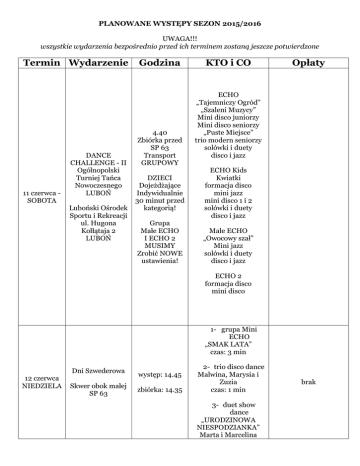 PLANOWANE WYSTĘPY SEZON 2015/2016 UWAGA!!! wszystkie wydarzenia bezpośrednio przed ich terminem zostaną jeszcze potwierdzone Termin Wydarzenie 11 czerwca SOBOTA DANCE CHALLENGE - II Ogólnopolski Turniej Tańca Nowoczesnego LUBOŃ Luboński Ośrodek Sportu i Rekreacji ul. Hugona Kołłątaja 2 LUBOŃ Godzina 4.40 Zbiórka przed SP 63 Transport GRUPOWY DZIECI Dojeżdżające Indywidualnie 30 minut przed kategorią! Grupa Małe ECHO I ECHO 2 MUSIMY Zrobić NOWE ustawienia! KTO i CO Opłaty ECHO „Tajemniczy Ogród” „Szaleni Muzycy” Mini disco juniorzy Mini disco seniorzy „Puste Miejsce” trio modern seniorzy solówki i duety disco i jazz ECHO Kids Kwiatki formacja disco mini jazz mini disco 1 i 2 solówki i duety disco i jazz Małe ECHO „Owocowy szał” Mini jazz solówki i duety disco i jazz ECHO 2 formacja disco mini disco 1- grupa Mini ECHO „SMAK LATA” czas: 3 min Dni Szwederowa 12 czerwca NIEDZIELA Skwer obok małej SP 63 występ: 14.45 zbiórka: 14.35 2- trio disco dance Malwina, Marysia i Zuzia czas: 1 min 3- duet show dance „URODZINOWA NIESPODZIANKA” Marta i Marcelina brak Czas: 1,5 min 4- grupa ECHO Mini Mini „ŚPIOCHY” czas: 2,5 min 5- solo show dance „WITAJ U MYSZKI MIKI” Malwina Czas: 1,5 min 6- grupa ECHO Mix „PARYŻANKI” czas: 3 min. Marta Sieraszewska solo disco solo jazz 18 czerwca SOBOTA MODRACZEK występ gościnny dla PN Skrzat Dominika Balicka solo disco solo lusterko ??? Kamila Jurkowska solo anioł solo disco Paulina Ścieszyńska solo modern solo disco SALA WIDOWISKOWA PAŁACU MŁODZIEŻY 18 czerwca SOBOTA Zbiórka: 15.30 wewnętrzny turniej tańca ECHO Start imprezy: 16.00 zabawa w SOLO! Zakończenie do 17.30 kategoria: DISCO JAZZ 18 czerwca SOBOTA SALA WIDOWISKOWA PAŁACU MŁODZIEŻY 17.30 Kolejność prezentacji w zakładce poświęconej turniejowi + solowe i duetowe występy wybranych osób z ECHO i ECHO Kids propozycja: ECHO „Tajemniczy Ogród” „Puste Miejsce” Mini disco seniorska Kolejność prezentacji: solo disco Donia i Marta Kamila solo anioł Paulina solo modern Marta solo jazz Donia solo lusterko solo disco Kama i Paulina zapisy zakończone Występ dla PN Skrzat 19 czerwca NIEDZIELA ZAKOŃCZENIE ROKU TANECZNEGO ECHO Dance Family ECHO Kids trio disco ECHO sweet – Daria, Tosia i Zosia Marta i Marcyś „Urodzinowa Niespodzianka” zakończenie 1 10.00 Grupy: Mini Mix Mini Mini Zakończenie 2 11.45 Grupy: ECHO Kids Małe ECHO 2 Na zakończenie przychodzimy ubrani po ECHOwemu Mini ECHO TRUSKAWKI podsumowanie pracy każdej z Naszych grup rozdanie dyplomów i nagród dla uczestników BRAK