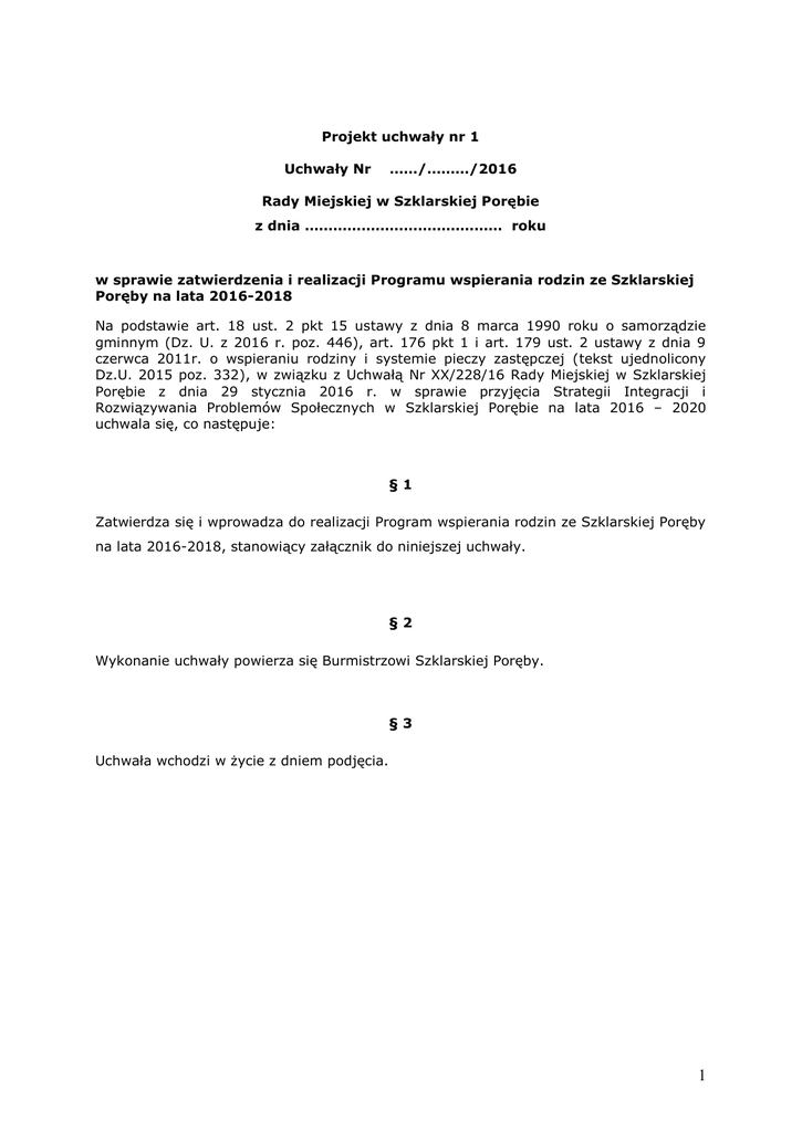 Projekt uchwały nr 1 Uchwały Nr ……/………/2016 Rady Miejskiej w Szklarskiej Porębie z dnia …………………………………… roku w sprawie zatwierdzenia i realizacji Programu wspierania rodzin ze Szklarskiej Poręby na lata 2016-2018 Na podstawie art. 18 ust. 2 pkt 15 ustawy z dnia 8 marca 1990 roku o samorządzie gminnym (Dz. U. z 2016 r. poz. 446), art. 176 pkt 1 i art. 179 ust. 2 ustawy z dnia 9 czerwca 2011r. o wspieraniu rodziny i systemie pieczy zastępczej (tekst ujednolicony Dz.U. 2015 poz. 332), w związku z Uchwałą Nr XX/228/16 Rady Miejskiej w Szklarskiej Porębie z dnia 29 stycznia 2016 r. w sprawie przyjęcia Strategii Integracji i Rozwiązywania Problemów Społecznych w Szklarskiej Porębie na lata 2016 – 2020 uchwala się, co następuje: §1 Zatwierdza się i wprowadza do realizacji Program wspierania rodzin ze Szklarskiej Poręby na lata 2016-2018, stanowiący załącznik do niniejszej uchwały. §2 Wykonanie uchwały powierza się Burmistrzowi Szklarskiej Poręby. §3 Uchwała wchodzi w życie z dniem podjęcia. 1 Uzasadnienie uchwały Ustawa o wspieraniu rodziny i systemie pieczy zastępczej (tekst ujednolicony Dz.U. 2015 poz. 332) w dziale Zadania administracji publicznej w zakresie wspierania rodziny i systemu pieczy zastępczej wskazała konieczność opracowania i realizacji 3-letnich gminnych programów wspierania rodziny do zadań własnych gminy. Mając powyższe na uwadze w roku 2012 Zespół ds. opracowania i realizacji 3-letniego Gminnego Programu Wspierania Rodziny opracował dokument pn. „Program wspierania rodzin ze Szklarskiej Poręby na lata 2012-2015” przyjęty Uchwałą Rady Miejskiej w Szklarskiej Porębie nr XXVIII/326/2012 z dnia 25 października 2012 r. Realizacja ww Programu zakończyła się w 2015 roku. Konieczne było stworzenie nowego programu na kolejne 3 lata. Stąd powołany przez Burmistrza Szklarskiej Poręby Zespół ds. monitoringu i ewaluacji przyjętych w gminie programów wsparcia, zaktualizował program wspierania rodziny na lata 2016-2018, który zawiera szereg działań wspierających rodziny ze Szklarskiej Poręby i jest zgodny z przyjętą Strategią Integracji i Rozwiązywania Problemów Społecznych w Szklarskiej Porębie na lata 2016-2020 . 2 Załącznik do Uchwały Nr ……/2016 Rady Miejskiej w Szklarskiej Porębie z dnia …………..2016 roku PROGRAM WSPIERANIA RODZIN ZE SZKLARSKIEJ PORĘBY NA LATA 2016-2018 3 Założenia Programu Każdy człowiek do prawidłowego rozwoju potrzebuje rodziny. Rodziny, która jest jego podstawowym środowiskiem zapewniającym mu poczucie bezpieczeństwa emocjonalnego, zaspokaja jego potrzebę przynależności i daje mu warunki do prawidłowego rozwoju. Wincenty Okoń w Słowniku pedagogicznym rodzinę definiuje jako "małą grupę społeczną, składającą się z rodziców i ich dzieci i krewnych; rodziców łączy więź małżeńska, rodziców z dziećmi więź rodzicielska, stanowiąca podstawę wychowania rodzinnego, jak również więź formalna określająca obowiązki rodziców i dzieci względem siebie"1. Makary Sieradzki twierdzi zaś, że rodzina "jest niezastąpionym fundamentem życia, normalnego rozwoju i wzrostu człowieka, a zarazem warunkiem normalnego rozwoju narodu, jego kultury, gwarantem jego przyszłości”2. Prawa do ochrony rodziny ze strony społeczeństwa i państwa pod względem społecznym, prawnym i ekonomicznym zawarte są w uregulowaniach prawnych rangi międzynarodowej tj. Powszechna Deklaracja Praw Człowieka, Konwencji o Prawach Dziecka, Europejska Karta Społeczna, stanowią jedną z zasad konstytucyjnych zawartych w Konstytucji Rzeczypospolitej Polskiej i określone są w przepisach ustaw szczegółowych tj. Kodeks rodzinny i opiekuńczy, Kodeks postępowania cywilnego, Kodeks cywilny, Kodeks karny, Kodeks postępowania karnego i Kodeks pracy. Ustawy o pomocy społecznej, o przeciwdziałaniu przemocy w rodzinie, o wychowaniu w trzeźwości i przeciwdziałaniu alkoholizmowi, o świadczenia rodzinnych i świadczeniach z funduszu alimentacyjnego, czy o wspieraniu rodziny i systemie pieczy zastępczej regulują postępowanie w szczególnych sytuacjach w jakich może znaleźć się współczesna rodzina. Zadania wynikające z w/w przepisów realizowane są na wszystkich szczeblach władzy począwszy od centralnych czy rządowych programów a skończywszy na lokalnych programach, projektach czy działaniach środowiskowych podejmowanych na poziomie gminy. Stąd też stwierdzenie, że treść aktów prawnych stanowi jeden z ważniejszych instrumentów polityki państwa oraz polityki wobec rodziny. Przyjęte strategie mają wpływ na jej sytuację: ułatwiają wypełnianie funkcji bądź utrudniają i wywołują dezintegracje rodzinę i stanowią utrudnienie dla jej prawidłowego funkcjonowania. W obecnych czasach postęp, zmiany mentalności i globalizacja życia przyczyniły się do ewaluacji pojęcia rodziny, w której mieści się między innymi: szeroko pojęta rodzina (matka, ojciec, dzieci, babcia, dziadek, ciotki, wujowie); para, która nie ma dzieci z wyboru lub z powodu różnych trudności (mąż i żona/partnerzy życiowi); rodzina, gdzie matka lub ojciec samotnie wychowują dzieci (wdowy/wdowcy i dzieci, osoba po rozwodzie lub w separacji, niezamężna matka z biologicznym dzieckiem lub dzieckiem adoptowanym); nastoletnia matka z dzieckiem, mieszkająca z rodzicami lub z innymi osobami nie będącymi częścią systemu rodzinnego; rodzina w której dziecko lub dzieci są adoptowane (para i adoptowane dziecko); rodzina po rekonstrukcji/mieszana (w której jedno lub oboje partnerów był wcześniej w związku małżeńskim i do nowej rodziny wchodzą z dziećmi z poprzedniego związku); rodzina wspólnotowa (grupy rodzin z dziećmi i kilkoro samotnych dorosłych); rodziny tej samej płci (pary gejowskie lub lesbijskie bez lub z dziećmi) 3 Powstania tych zupełnie odmiennych modeli rodziny i typów relacji międzymałże