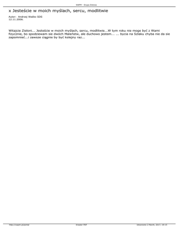 WAPM - Grupa Zielona x Jesteście w moich myślach, sercu, modlitwie Autor: Andrzej Waśko SDS 12.11.2006. Witajcie Zieloni... Jesteście w moich myślach, sercu, modlitwie...W tym roku nie moge być z Wami fizycznie, bo spodziewam sie dwóch Maleństw, ale duchowo jestem... ... bycia na Szlaku chyba nie da sie zapomnieć...i zawsze ciągnie by być kolejny raz... http://wapm.pl/portal Kreator PDF Utworzono 2 March, 2017, 19:15