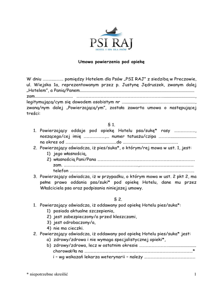 Umowa powierzenia pod opiekę W dniu ………....……. pomiędzy Hotelem dla Psów „PSI RAJ” z siedzibą w Preczowie, ul. Wiejska 1a, reprezentowanym przez p. Justynę Jędruszek, zwanym dalej „Hotelem”, a Panią/Panem...................................................................................................... zam.................................. ……………………………………………………………………………............................, legitymującą/cym się dowodem osobistym nr …..................………………………………….........., zwaną/nym dalej „Powierzającą/ym”, została zawarta umowa o następującej treści: § 1. 1. Powierzający oddaje pod opiekę Hotelu psa/sukę* rasy …………………, noszącego/cej imię …………………,... numer tatuażu/czipa …………....................... na okres od ……………................................do ………………........................………. 2. Powierzający oświadcza, iż pies/suka*, o którym/rej mowa w ust. 1, jest: 1) jego własnością, 2) własnością Pani/Pana ……………………………………………………………………………………. zam. ………………………………………………………………..,……………………………………………… telefon ……………………………………………………………………………………………………………. 3. Powierzający oświadcza, iż w przypadku, o którym mowa w ust. 2 pkt 2, ma pełne prawo oddania psa/suki* pod opiekę Hotelu, dane mu przez Właściciela psa oraz podpisania niniejszej umowy. § 2. 1. Powierzający oświadcza, iż oddawany pod opiekę Hotelu pies/suka*: 1) posiada aktualne szczepienia, 2) jest zabezpieczony/a przed kleszczami, 3) jest odrobaczony/a, 4) nie ma cieczki. 2. Powierzający oświadcza, iż oddawany pod opiekę Hotelu pies/suka* jest: a) zdrowy/zdrowa i nie wymaga specjalistycznej opieki*, b) zdrowy/zdrowa, lecz w ostatnim okresie …………………………........................ chorował/ła na ………………………………………………………………………………………………* i – wg wskazań lekarza weterynarii – należy …………………………………………… * niepotrzebne skreślić 1 …………………………………………………………………………………………………………………………… …………………………………………………………………………………………………………………………… …………………………………………………………………………………………………………………………… …………………………………………………………………………………………………………………………… …………………………………………………………………………………………………………………………… 3. Na okres pobytu w Hotelu Powierzający pozostawia: 1) książeczkę zdrowia psa/suki*, 2) obrożę, smycz i kaganiec, 3) inne - jakie (np. legowisko, koc, miski, zabawki, karmę, lekarstwa)……………………………………………………........................................................... ...................................……………………….……………………………………………………………………… …................……………………………………………………………………………………………………………… ……………..... § 3. 1. Powierzający przekazuje psa/sukę* pod opiekę Hotelu na warunkach, określonych w ofercie, zamieszczonej na stronie internetowej Hotelu. 2. Strony ustalają, iż opieka, o której mowa w ust. 1, zostaje poszerzona o: ……………………………………………………………………………............................................................ ………………………………………………………………………................................................................. …………………………………………………………………………….........................................................… …………………………………………………………………………………………………………………................. 3. Koszt pobytu psa/suki* w Hotelu w umówionym okresie został ustalony w oparciu o Cennik Usług i wynosi łącznie kwotę ………….............................…....PLN (słownie: …………………………………………………...................................................................... ……………………………………………………………………………............................................................. ……………………………………………………………………………............................................................. 4. Strony oświadczają, że kwota, o której mowa w ust. 3, została opłacona w następujący sposób: 1) 50% kwoty w wysokości ………………………….. PLN (słownie: ……………………….. ………………………………………………………………………………………………………………………………… ………………………………………………………………) wpłacono na konto/w kasie* Hotelu w dniu ……………………………, 2) pozostałe 50% kwoty w wysokości ……………... PLN (słownie: …………………………………………………………………………………………………………………………… ……………………………………………………………………………………………………………………