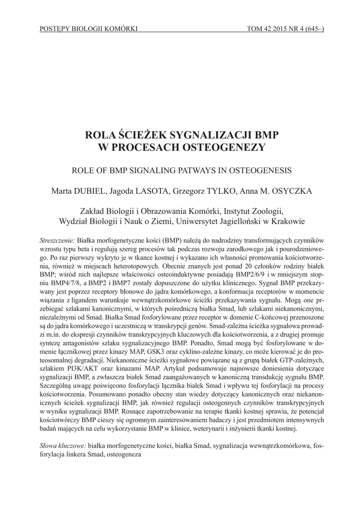 POSTĘPY BIOLOGII KOMÓRKI TOM 42 2015 NR 4 (645–) ROLA ŚCIEŻEK SYGNALIZACJI BMP W PROCESACH OSTEOGENEZY ROLE OF BMP SIGNALING PATWAYS IN OSTEOGENESIS Marta DUBIEL, Jagoda LASOTA, Grzegorz TYLKO, Anna M. OSYCZKA Zakład Biologii i Obrazowania Komórki, Instytut Zoologii, Wydział Biologii i Nauk o Ziemi, Uniwersytet Jagielloński w Krakowie Streszczenie: Białka morfogenetyczne kości (BMP) należą do nadrodziny transformujących czynników wzrostu typu beta i regulują szereg procesów tak podczas rozwoju zarodkowego jak i pourodzeniowego. Po raz pierwszy wykryto je w tkance kostnej i wykazano ich własności promowania kościotworzenia, również w miejscach heterotopowych. Obecnie znanych jest ponad 20 członków rodziny białek BMP; wśród nich najlepsze właściwości osteoinduktywne posiadają BMP2/6/9 i w mniejszym stopniu BMP4/7/8, a BMP2 i BMP7 zostały dopuszczone do użytku klinicznego. Sygnał BMP przekazywany jest poprzez receptory błonowe do jądra komórkowego, a konformacja receptorów w momencie wiązania z ligandem warunkuje wewnątrzkomórkowe ścieżki przekazywania sygnału. Mogą one przebiegać szlakami kanonicznymi, w których pośredniczą białka Smad, lub szlakami niekanonicznymi, niezależnymi od Smad. Białka Smad fosforylowane przez receptor w domenie C-końcowej przenoszone są do jądra komórkowego i uczestniczą w transkrypcji genów. Smad-zależna ścieżka sygnałowa prowadzi m.in. do ekspresji czynników transkrypcyjnych kluczowych dla kościotworzenia, a z drugiej promuje syntezę antagonistów szlaku sygnalizacyjnego BMP. Ponadto, Smad mogą być fosforylowane w domenie łącznikowej przez kinazy MAP, GSK3 oraz cyklino-zależne kinazy, co może kierować je do proteosomalnej degradacji. Niekanoniczne ścieżki sygnałowe powiązane są z grupą białek GTP-zależnych, szlakiem PI3K/AKT oraz kinazami MAP. Artykuł podsumowuje najnowsze doniesienia dotyczące sygnalizacji BMP, a zwłaszcza białek Smad zaangażowanych w kanoniczną transdukcję sygnału BMP. Szczególną uwagę poświęcono fosforylacji łącznika białek Smad i wpływu tej fosforylacji na procesy kościotworzenia. Posumowano ponadto obecny stan wiedzy dotyczący kanonicznych oraz niekanonicznych ścieżek sygnalizacji BMP, jak również regulacji osteogennych czynników transkrypcyjnych w wyniku sygnalizacji BMP. Rosnące zapotrzebowanie na terapie tkanki kostnej sprawia, że potencjał kościotwórczy BMP cieszy się ogromnym zainteresowaniem badaczy i jest przedmiotem intensywnych badań mających na celu wykorzystanie BMP w klinice, weterynarii i inżynierii tkanki kostnej. Słowa kluczowe: białka morfogenetyczne kości, białka Smad, sygnalizacja wewnątrzkomórkowa, fosforylacja linkera Smad, osteogeneza 646 M. DUBIEL, J. LASOTA, G. TYLKO, A.M. OSYCZKA Summary: Bone morphogenetic proteins (BMP) belong to the transforming growth factor beta superfamily. They regulate several developmental processes during embryogenesis and in postnatal life. BMP have been discovered for the first time in bone and their osteogenic properties, including heterotopic sites, have been defined. There are presently more than 20 members of BMP family; among them the best osteoinductive properties display BMP2/6/9, slightly less osteoinductive are BMP4/7/8, and BMP2 and BMP7 are clinically available. BMP signal is transduced through membrane receptors to a cell nucleus; upon ligand binding, the receptors’ conformation determines intracellular signaling pathways. Canonical pathways engage Smad proteins, whereas non-canonical pathways are Smad-independent. Receptor-phosphorylated Smads at C-terminal domain are shuttled to the nucleus, where participate in gene transcription. Smad-dependent signaling leads e.g. to the expression of key osteogenic transcription factors, on the other hand it promotes the synthesis of BMP signaling pathways’ antagonists. Besides, Smads can be phosphorylated by MAPK, GSK3 and cycline dependent kinases in a linker domain, which can lead to their proteosomal degradation. Non-canonical pathways are linked to a group of GTP-depended proteins, PI3K/Akt pathway and MAP kinases. The article summarizes the newest findings regarding the BMP signaling, focusing on Smad proteins engaged in canonical BMP signal transduction. Special attention is paid to Smad linker phosphorylation and its effects on osteogenesis. We have also summarized the present knowledge regarding the canonical and non-canonical BMP pathways and BMP regulation of osteogenic transcription factors. Growing needs for bone tissue therapies prompt researchers to explore BMP osteogenic potential. Extensive research on BMP aims to apply them eventually in clinics, veterinary and bone tissue engineering. Key words: bone morphogenetic proteins, Smad proteins, intracellular signaling, Smad linker phosphorylation, osteogenesis WSTĘP Białka morfogenetyczne kości (ang. Bone Morphogenetic Proteins, BMP) po raz pierwszy opisał w 1965 roku Marshall Urist, który zaobserwował, że zdemineralizowana kwasem hydrochlorowym macierz kości, po przeszczepieniu do mięśnia szkieletowego, indukuje tworzenie tkanki chrzęstnej oraz kostnej [74]. Izolacja pierwszego BMP (tj. BMP3) z ekstraktu kości bydlęcej miała jednak miejsce dopiero w 1980 roku. W 1988 roku, Wozney i wsp. sklonowali BMP2 i BMP4 [79], a w 1990 roku opracowano struktury krystaliczne ludzkich białek BMP2 i BMP7 [10]. Oprócz tkanki kostnej, ekspresja BMP zachodzi m.in. w nerkach (BMP3/4/7), płucach (BMP3/4/5/6), jelicie cienkim (BMP/2/7), sercu (BMP2/4/6/7), zawiązkach kończyn (BMP/2/4/5/7) oraz zębach (BMP3/4/7) [59]. BMP są najlepiej jak dotąd poznanymi cząsteczkami o charakterze osteoinduktywnym, zdolnymi do rekrutacji progenitorów kostnych, ich różnicowania w dojrzałe i funkcjonalne komórki kostne, a także indukowania procesów kościotworzenia w miejscach heterotopowych. Spośród liczącej ponad 20 członków rodziny BMP, najbardziej osteo