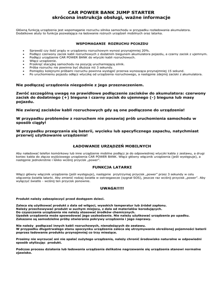 CAR POWER BANK JUMP STARTER skrócona instrukcja obsługi, ważne informacje Główną funkcją urządzenia jest wspomaganie rozruchu silnika samochodu w przypadku rozładowania akumulatora. Dodatkowe atuty to funkcja pozwalająca na ładowanie rożnych urządzeń mobilnych oraz latarka. WSPOMAGANIE ROZRUCHU POJAZDU Sprawdź czy ilość prądu w urządzeniu rozruchowym wynosi przynajmniej 20%. Podłącz czerwony zacisk kabli rozruchowych z dodatnim biegunem akumulatora pojazdu, a czarny zacisk z ujemnym. Podłącz urządzenie CAR POWER BANK do wtyczki kabli rozruchowych. Włącz urządzenie. Przekręć stacyjkę samochodu na pozycję uruchamiającą silnik. Próba rozruchu nie powinna być dłuższa niż 3 sekundy. Pomiędzy kolejnymi próbami rozruchu powinna wystąpić przerwa wynosząca przynajmniej 15 sekund. Po uruchomieniu pojazdu odłącz wtyczkę od urządzenia rozruchowego, a następnie zdejmij zaciski z akumulatora. Nie podłączaj urządzenia niezgodnie z jego przeznaczeniem. Zwróć szczególną uwagę na prawidłowe podłączenie zacisków do akumulatora: czerwony zacisk do dodatniego (+) bieguna i czarny zacisk do ujemnego (-) bieguna lub masy pojazdu. Nie zwieraj zacisków kabli rozruchowych gdy są one podłączone do urządzenia! W przypadku problemów z rozruchem nie ponawiaj prób uruchomienia samochodu w sposób ciągły! W przypadku przegrzania się baterii, wycieku lub specyficznego zapachu, natychmiast przerwij użytkowanie urządzenia! ŁADOWANIE URZĄDZEŃ MOBILNYCH Aby naładować telefon komórkowy lub inne urządzenie mobilne podłącz je do odpowiedniej wtyczki kabla z zestawu, a drugi koniec kabla do złącza wyjściowego urządzenia CAR POWER BANK. Włącz główny włącznik urządzenia (jeśli występuje), a następnie jednokrotnie i lekko wciśnij przycisk „power”. FUNKCJA LATARKI Włącz główny włącznik urządzenia (jeśli występuje), następnie przytrzymaj przycisk „power” przez 3 sekundy w celu włączenia światła latarki. Aby zmienić rodzaj światła w ostrzegawcze (sygnał SOS), jeszcze raz wciśnij przycisk „power”. Aby wyłączyć światło - wciśnij ten przycisk ponownie. Pytanie UWAGA!!!!! Produkt należy zabezpieczyć przed dostępem dzieci. Zaleca się użytkować produkt z dala od wilgoci, wysokich temperatur lub źródeł zapłonu. Należy przechowywać produkt w suchym miejscu, z dala od materiałów korodujących. Do czyszczenia urządzenia nie należy stosować środków chemicznych. Upadek urządzenia może spowodować jego uszkodzenie. Nie należy użytkować urządzenia po upadku. Zakazane są samodzielne próby otwierania pokrywy urządzenia i jego naprawy. Nie należy podłączać innych kabli rozruchowych, nienależących do zestawu. W przypadku długotrwałego stanu spoczynku urządzenia zaleca się utrzymywanie określonej pojemności baterii poprzez ładowanie produktu przynajmniej co trzy miesiące. Prosimy nie wyrzucać ani nie spalać zużytego urządzenia, należy chronić środowisko naturalne w odpowiedni sposób utylizując produkt. Podczas procesu działania lub ładowania urządzenia delikatne nagrzewanie się urządzenia stanowi normalne zjawisko.
