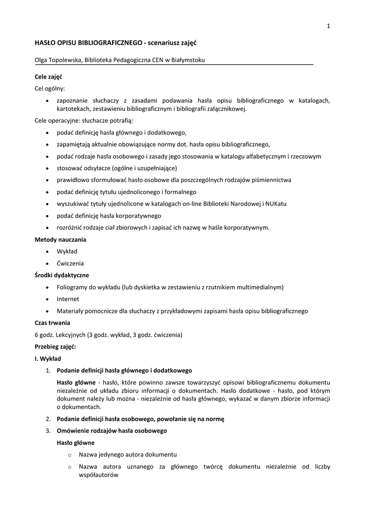 1 HASŁO OPISU BIBLIOGRAFICZNEGO - scenariusz zajęć Olga Topolewska, Biblioteka Pedagogiczna CEN w Białymstoku Cele zajęć Cel ogólny: • zapoznanie słuchaczy z zasadami podawania hasła opisu bibliograficznego w katalogach, kartotekach, zestawieniu bibliograficznym i bibliografii załącznikowej. Cele operacyjne: słuchacze potrafią: • podać definicję hasła głównego i dodatkowego, • zapamiętają aktualnie obowiązujące normy dot. hasła opisu bibliograficznego, • podać rodzaje hasła osobowego i zasady jego stosowania w katalogu alfabetycznym i rzeczowym • stosować odsyłacze (ogólne i uzupełniające) • prawidłowo sformułować hasło osobowe dla poszczególnych rodzajów piśmiennictwa • podać definicję tytułu ujednoliconego i formalnego • wyszukiwać tytuły ujednolicone w katalogach on-line Biblioteki Narodowej i NUKatu • podać definicję hasła korporatywnego • rozróżnić rodzaje ciał zbiorowych i zapisać ich nazwę w haśle korporatywnym. Metody nauczania • Wykład • Ćwiczenia Środki dydaktyczne • Foliogramy do wykładu (lub dyskietka w zestawieniu z rzutnikiem multimedialnym) • Internet • Materiały pomocnicze dla słuchaczy z przykładowymi zapisami hasła opisu bibliograficznego Czas trwania 6 godz. Lekcyjnych (3 godz. wykład, 3 godz. ćwiczenia) Przebieg zajęć: I. Wykład 1. Podanie definicji hasła głównego i dodatkowego Hasło główne - hasło, które powinno zawsze towarzyszyć opisowi bibliograficznemu dokumentu niezależnie od układu zbioru informacji o dokumentach. Hasło dodatkowe - hasło, pod którym dokument należy lub można - niezależnie od hasła głównego, wykazać w danym zbiorze informacji o dokumentach. 2. Podanie definicji hasła osobowego, powołanie się na normę 3. Omówienie rodzajów hasła osobowego Hasło główne o Nazwa jedynego autora dokumentu o Nazwa autora uznanego za głównego twórcę dokumentu niezależnie od liczby współautorów 2 o Nazwa pierwszego autora, jeżeli liczba autorów nie przekracza trzech i żaden z nich nie został uznany za głównego autora Hasło dodatkowe bez określenia rodzaju współpracy o Nazwa drugiego i trzeciego autora, jeżeli wszystkich autorów jest nie więcej niż trzech o Nazwę autora pierwszego, jeżeli autorów jest więcej niż trzech i żaden z nich nie został uznany za głównego autora z określeniem rodzaju współpracy o Dodatkowe oznaczenia odpowiedzialności typu tłumacz (Tł.), redaktor (Red.), opracowujący (Oprac.), autor przedmowy (Przedm.,) autor bibliografii (Bibliogr.), autor indeksu (Indeks), twórca adaptacji (Adapt.,)twórca wyboru (Wybór), ilustrator (Il.) obowiązkowe fakultatywne 4. Omówienie zasad stosowania odsyłaczy, podanie ich rodzajów oraz formy zapisu. Krótka charakterystyka dopowiedzeń. Zasady stosowania o Stosuje się w przypadku, gdy jedna osoba używa różnych nazw (lub form nazw). o Dopuszcza się podawanie w nawiasach kwadratowych określenia rodzaju nazwy [pseud.], [pierwotna nazwa], [późniejsza nazwa] Forma odsyłaczy Nazwa nie uwzględniona w haśle opisu bibliograficznego zob. (zob. też) Hasło opisu bibliograficznego Rodzaje odsyłaczy odsyłacze całkowite (ogólne) Zych, Maurycy [pseud,] zob. Żeromski, Stefan // Witkacy zob. Witkiewicz, Stanisław Ignacy // Szopen, Fryderyk zob. Chopin Fryderyk // Szewczenko, Taras zob. Sevcenko, Taras // Kowalska, Ewa Jarecka zob. Jarecka - Kowalska Ewa odsyłacze uzupełniaKoce Słomczy ski, MacieK zob. też AleS, Joe // Kwaśniewski , Kazimierz 5. Podanie przykładowych opisów bibliograficznych z zastosowaniem hasła głównego osobowego i dodatkowego (załącznik 1). 6. Omówienie zasad stosowania hasła osobowego na przykładzie różnych form piśmiennictwa (załącznik 2). 7. Wskazanie na różnice w stosowaniu haseł osobowych sporządzanych na podstawie Przepisów katalogowania J. Grycza i Borkowskiej oraz wg aktualnie obowiązującej normy PN-N-01231:2001 . 8. Podanie definicji hasła tytułowego, odwołanie się do normy. Hasło tytułowe - hasło, którego jedyną lub pierwszą częścią jest tytuł ujednolicony lub tytuł formalny 9. Omówienie tytułu ujednoliconego i przypadków jego stosowania. Tytuł ujednolicony - Tytuł dokumentu w najbardziej znanej formie, służący do grupowania opisów różnych wydań tego samego dzieła opublikowanych pod różnymi tytułami 3 Należy stosować jako hasło opisu bibliograficznego w przypadku: anonimów klasycznych, ksiąg świętych, ksiąg liturgicznych. Anonimy klasyczne Tytuł ujednolicony dla anonimów należy ustalać na podstawie: o Anonymus classics. Londyn 1978 (anonimy europejskie) o Liste internationale de vedettes uniformes pour les classiques anonymes. Paryż 1964 (dla anonimów pozaeuropejskich) o kartoteki wzorcowej tytułów ujednoliconych właściwych dla danego kraju. wg PN-N-01231:2001 - Hasło opisu bibliograficznego - Hasło tytułowe Przykłady: Chanson de Roland Kazania gnieźnie skie Satyra na leniwych chłopów (Pieś o Rolandzie) Biblia Tytuł ujednolicony stosować wg PN-N-01231:2001 (załącznik B) Przykłady: Biblia. ST Biblia. ST. Księga Jeremiasza Biblia ST. Pięcioksiog Biblia. NT Biblia NT. Ewangelie Biblia NT. Ewangelia według św. Łukasza Księgi liturgiczne Kościoła katolickiego Tytuł ujednolicony należy przejmować z: o List of uniform titles for liturgical works of the latin rites of the Catholic Church. Londyn 1981 Przykłady: Missale romanum Missale ambrosianum Missale (Arras) Missale romanum (Versio Polonica) Księgi święte innych wyznań Tytuł ujednolicony należy przejmować z: o Liste internationale des vedettes uniformes pour les classiques anonmes. Paris 1964 Przykłady: Kora Talmud 10. Podanie definicji i zasad stosowania ujednoliconego tytułu zbiorczego. Ujednolicony tytuł zbiorczy - Tytuł nadany przez opisującego, służący do grupowania opisów zbiorów prac jednego autora. Przy opisie publikacji wydanych po 1800 r. należy sto