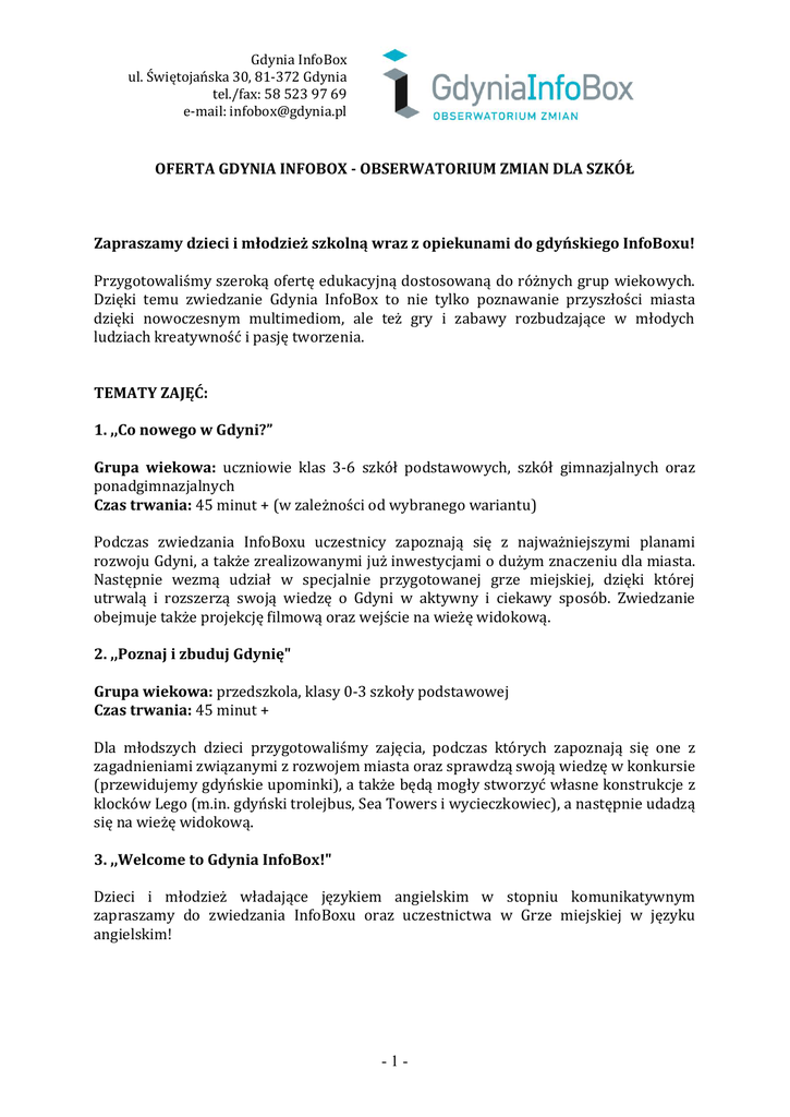 Gdynia InfoBox ul. Świętojańska 30, 81-372 Gdynia tel./fax: 58 523 97 69 e-mail: [email protected] OFERTA GDYNIA INFOBOX - OBSERWATORIUM ZMIAN DLA SZKÓŁ Zapraszamy dzieci i młodzież szkolną wraz z opiekunami do gdyńskiego InfoBoxu! Przygotowaliśmy szeroką ofertę edukacyjną dostosowaną do różnych grup wiekowych. Dzięki temu zwiedzanie Gdynia InfoBox to nie tylko poznawanie przyszłości miasta dzięki nowoczesnym multimediom, ale też gry i zabawy rozbudzające w młodych ludziach kreatywność i pasję tworzenia. TEMATY ZAJĘĆ: 1. ,,Co nowego w Gdyni?” Grupa wiekowa: uczniowie klas 3-6 szkół podstawowych, szkół gimnazjalnych oraz ponadgimnazjalnych Czas trwania: 45 minut + (w zależności od wybranego wariantu) Podczas zwiedzania InfoBoxu uczestnicy zapoznają się z najważniejszymi planami rozwoju Gdyni, a także zrealizowanymi już inwestycjami o dużym znaczeniu dla miasta. Następnie wezmą udział w specjalnie przygotowanej grze miejskiej, dzięki której utrwalą i rozszerzą swoją wiedzę o Gdyni w aktywny i ciekawy sposób. Zwiedzanie obejmuje także projekcję filmową oraz wejście na wieżę widokową. 2. ,,Poznaj i zbuduj Gdynię" Grupa wiekowa: przedszkola, klasy 0-3 szkoły podstawowej Czas trwania: 45 minut + Dla młodszych dzieci przygotowaliśmy zajęcia, podczas których zapoznają się one z zagadnieniami związanymi z rozwojem miasta oraz sprawdzą swoją wiedzę w konkursie (przewidujemy gdyńskie upominki), a także będą mogły stworzyć własne konstrukcje z klocków Lego (m.in. gdyński trolejbus, Sea Towers i wycieczkowiec), a następnie udadzą się na wieżę widokową. 3. ,,Welcome to Gdynia InfoBox!" Dzieci i młodzież władające językiem angielskim w stopniu komunikatywnym zapraszamy do zwiedzania InfoBoxu oraz uczestnictwa w Grze miejskiej w języku angielskim! -1- Gdynia InfoBox ul. Świętojańska 30, 81-372 Gdynia tel./fax: 58 523 97 69 e-mail: [email protected] 4. ,,Tak to się robi w Gdyni" Grupa wiekowa: uczniowie szkół gimnazjalnych i ponadgimnazjalnych Czas trwania: 60 minut Zajęcia prowadzą specjaliści z Biura Planowania Przestrzennego Miasta Gdyni, którzy opowiadają jak projektuje się miasto. Proponują oni uczestnikom udział w grze, w której będą musieli radzić sobie z problemami z jakimi na co dzień borykają się urbaniści. 5. ,,Miasto jak malowane" Grupa wiekowa: uczniowie szkół gimnazjalnych i ponadgimnazjalnych Czas trwania: 60 minut Zajęcia prowadzi Plastyk Miejski, który opowiada uczestnikom o estetyce w przestrzeni publicznej. Uczestnicy obejrzą też prezentację multimedialną na temat sztuki w mieście i spróbują zaprojektować własny mural lub szyld sklepowy. 6. ,,Rowerem do szkoły" Grupa wiekowa: uczniowie klas 5-6 szkół podstawowych oraz szkół gimnazjalnych Czas trwania: 60 minut Warsztaty będą składały się z części teoretycznej i praktycznej. W ramach części teoretycznej uczniowie zapoznają się z podstawowymi zasadami bezpiecznego poruszania się na rowerze i wybierania odpowiednio bezpiecznych dróg do szkoły. Przeanalizują również, jakie cechy powinny ich zdaniem posiadać te drogi, aby podróż rowerem do szkoły była przyjemna i bezpieczna. Materiał będzie zawierał formy multimedialne - krótkie filmy z przejazdów rowerem po Gdyni. W ramach części praktycznej uczestnicy na przykładzie własnych dróg do szkoły wskażą miejsca, które wymagają poprawy oraz zaznaczą na mapie drogę, którą pojechaliby rowerem. 7. „Piechotą po mieście” Grupa wiekowa : uczniowie szkół podstawowych Czas trwania: 60 minut Warsztaty będą składały się z części teoretycznej i praktycznej. W ramach części teoretycznej uczniowie zapoznają się z dobrymi przykładami kształtowania przyjaznych mieszkańcom przestrzeni publicznych, przeanalizują jakie cechy powinna ich zdaniem posiadać przyjazna im przestrzeń miejska. W ramach części praktycznej uczestnicy zaprojektują przestrzeń pieszą przyjazną mieszkańcom na podstawie jednej z gdyńskich ulic (do wyboru ul. Świętojańska, ul. Starowiejska, Skwer Kościuszki). -2- Gdynia InfoBox ul. Świętojańska 30, 81-372 Gdynia tel./fax: 58 523 97 69 e-mail: [email protected] 8. „Eco-friendly way to school” Grupa wiekowa: uczniowie szkół gimnazjalnych oraz ponadgimnazjalnych Czas trwania: 60 minut Warsztaty, prowadzone w języku angielskim, będą składały się z części teoretycznej i praktycznej. W ramach części teoretycznej uczniowie zapoznają się z dobrymi przykładami kształtowania przyjaznych mieszkańcom przestrzeni publicznych. Przeanalizują korzyści poruszania się poszczególnymi środkami transportu w mieście. W ramach części praktycznej uczestnicy zaprojektują przestrzeń pieszą przyjazną mieszkańcom na podstawie jednej z gdyńskich ulic (do wyboru ul. Świętojańska, ul. Starowiejska, Skwer Kościuszki). INFORMACJE DODATKOWE Zajęcia są dostosowane do różnych grup wiekowych; Nie łączymy klas; Zajęcia są bezpłatne; Zajęcia można łączyć; Obowiązują zapisy telefoniczne z co najmniej kilkudniowym wyprzedzeniem; Terminy zwiedzania oraz zajęć edukacyjnych (po uprzednim uzgodnieniu): poniedziałek-piątek 11:00-18:00, soboty 12:30-17:00; o Szczegółowych informacji udzielamy telefonicznie; o Osoba do kontaktu: Marta Juraniec, tel. 58 523 97 69; o Adres: Gdynia InfoBox, ul. Świętojańska 30. o o o o o o ZAPRASZAMY SERDECZNIE ! -3-