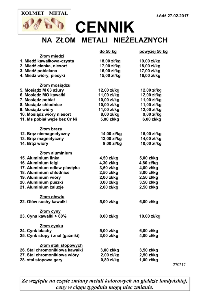 KOLMET METAL Łódź 27.02.2017 CENNIK NA ZŁOM METALI NIEŻELAZNYCH do 50 kg powyżej 50 kg Złom miedzi 1. Miedź kawałkowa-czysta 2. Miedź cienka, niesort 3. Miedź pobielana 4. Miedź wióry, piecyki 18,00 zł/kg 17,00 zł/kg 16,00 zł/kg 15,00 zł/kg 19,00 zł/kg 18,00 zł/kg 17,00 zł/kg 16,00 zł/kg Złom mosiądzu 5. Mosiądz M 63 ażury 6. Mosiądz MO kawałki 7. Mosiądz pobiał 8. Mosiądz chłodnice 9. Mosiądz wióry 10. Mosiądz wióry niesort 11. Ms pobiał węże bez Cr Ni 12,00 zł/kg 11,00 zł/kg 10,00 zł/kg 10,00 zł/kg 11,00 zł/kg 8,00 zł/kg 5,00 zł/kg 12,00 zł/kg 12,00 zł/kg 11,00 zł/kg 11,00 zł/kg 12,00 zł/kg 9,00 zł/kg 6,00 zł/kg Złom brązu 12. Brąz niemagnetyczny 13. Brąz magnetyczny 14. Brąz wióry 14,00 zł/kg 13,00 zł/kg 9,00 zł/kg 15,00 zł/kg 14,00 zł/kg 10,00 zł/kg Złom aluminium 15. Aluminium linka 16. Aluminium felgi 17. Aluminium odlew plastyka 18. Aluminium chłodnice 19. Aluminium wióry 20. Aluminium puszki 21. Aluminium żaluzje 4,50 zł/kg 4,30 zł/kg 3,50 zł/kg 2,50 zł/kg 2,00 zł/kg 3,00 zł/kg 2,00 zł/kg 5,00 zł/kg 4,80 zł/kg 4,00 zł/kg 3,00 zł/kg 2,50 zł/kg 3,50 zł/kg 2,50 zł/kg Złom ołowiu 22. Ołów suchy kawałki 5,00 zł/kg 6,00 zł/kg Złom cyny 23. Cyna kawałki > 60% 8,00 zł/kg 10,00 zł/kg Złom cynku 24. Cynk blachy 25. Cynk stopy i znal (gaźniki) 5,00 zł/kg 3,00 zł/kg 6,00 zł/kg 4,00 zł/kg Złom stali stopowych 26. Stal chromoniklowa kawałki 27. Stal chromoniklowa wióry 28. stal stopowa gary 3,00 zł/kg 2,00 zł/kg 0,80 zł/kg 3,50 zł/kg 2,50 zł/kg 1,00 zł/kg 270217 Ze względu na częste zmiany metali kolorowych na giełdzie londyńskiej, ceny w ciągu tygodnia mogą ulec zmianie.