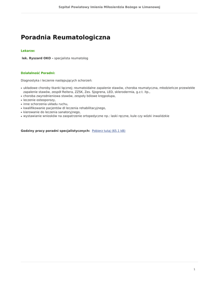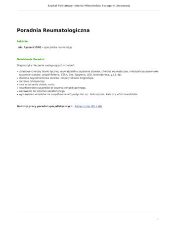 Szpital Powiatowy Imienia Miłosierdzia Bożego w Limanowej Poradnia Reumatologiczna Lekarze: lek. Ryszard OKO – specjalista reumatolog Działalność Poradni: Diagnostyka i leczenie następujących schorzeń: ● ● ● ● ● ● ● układowe choroby tkanki łącznej; reumatoidalne zapalenie stawów, choroba reumatyczna, młodzieńcze przewlekłe zapalenie stawów, zespół Reitera, ZZSK, Zes. Sjogrena, LED, sklerodermia, g.z.t. itp., choroba zwyrodnieniowa stawów, zespoły bólowe kręgosłupa, leczenie osteoporozy, inne schorzenia układu ruchu, kwalifikowanie pacjentów dl leczenia rehabilitacyjnego, kierowanie do leczenia sanatoryjnego, wystawianie wniosków na zaopatrzenie ortopedyczne np.: laski ręczne, kule czy wózki inwalidzkie Godziny pracy poradni specjalistycznych: Pobierz tutaj (65.1 kB) 1