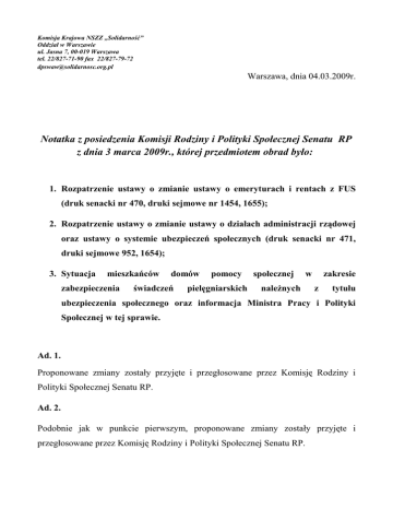 Komisja Krajowa NSZZ ,,Solidarność” Oddział w Warszawie ul. Jasna 7, 00-019 Warszawa tel. 22/827-71-90 fax 22/827-79-72 [email protected] Warszawa, dnia 04.03.2009r. Notatka z posiedzenia Komisji Rodziny i Polityki Społecznej Senatu RP z dnia 3 marca 2009r., której przedmiotem obrad było: 1. Rozpatrzenie ustawy o zmianie ustawy o emeryturach i rentach z FUS (druk senacki nr 470, druki sejmowe nr 1454, 1655); 2. Rozpatrzenie ustawy o zmianie ustawy o działach administracji rządowej oraz ustawy o systemie ubezpieczeń społecznych (druk senacki nr 471, druki sejmowe 952, 1654); 3. Sytuacja mieszkańców zabezpieczenia domów świadczeń pomocy pielęgniarskich społecznej w należnych zakresie z tytułu ubezpieczenia społecznego oraz informacja Ministra Pracy i Polityki Społecznej w tej sprawie. Ad. 1. Proponowane zmiany zostały przyjęte i przegłosowane przez Komisję Rodziny i Polityki Społecznej Senatu RP. Ad. 2. Podobnie jak w punkcie pierwszym, proponowane zmiany zostały przyjęte i przegłosowane przez Komisję Rodziny i Polityki Społecznej Senatu RP. Ad. 3. W sprawie sytuacji mieszkańców domów pomocy społecznej oraz proponowanych zmian w zakresie zabezpieczenia świadczeń pielęgniarskich należnych z tytułu ubezpieczenia społecznego informacji udzielił podsekretarz stanu w MPiPS Jarosław Duda. 1. Minister Jarosław Duda podniósł kwestię podwójnego opodatkowania mieszkańców DPS-ów, którzy płacą jednocześnie składkę zdrowotną od dochodu oraz ponoszą koszty opieki w DPS. 2. Jednocześnie wyraził wolę, aby DPS-y nie różniły się od Zakładów Leczniczych. 3. Zwrócił uwagę na brak środków finansowych umożliwiających przeprowadzenie reformy. 4. Przedstawił kilka pomysłów dotyczących proponowanych zmian w systemie świadczeń pielęgniarskich na terenie DPS-ów: a). dyrektor DPS powinien kontraktować w NFZ określoną liczbę pielęgniarek i rehabilitantów ( poinformował, że obecnie szacuje się, że jest ok. 8000 pielęgniarek i 2500 – 3500 rehabilitantów w DPS-ach; opłacenie tej grupy szacowane jest na 450 mln zł). b). kontraktowanie grupowe ( przykład z Piły), ale nie jest to traktowane jako rozwiązanie systemowe. c). w DPS można wydzielić piętro i wydzielić ZOL ( w Polsce jest ok. 1100 wolnych miejsc w DPS-ach). d). opieka zadaniowa lub środowiskowa (8 pacjentów) od 8do 18 opłaca NFZ, a opieka nocna z zaoszczędzonych środków dps. 5. Problem stanowi opieka psychiatryczna. W odpowiedzi na propozycje Ministra Jarosława Dudy zabrała głos M. Worlikowska z Ministerstwa Zdrowia. Poinformowała, że w sprawie kontraktowania usług zdrowotnych ZOZ-y posiadają zapewnione kontrakty natomiast DPS-y nie posiadają. Ponadto odniosła się do propozycji Ministra Jarosława Dudy dotyczących opieki pielęgniarskiej w DPS-ach. Według M. Worlikowskiej pomysł, aby wydzielać w DPS piętro na ZOL-e lub świadczyć opiekę środowiskową jest to możliwy do realizacji w ramach obowiązujących przepisów i nie wymaga to żadnej reformy. Przychylnie odniosła się również do kontraktów grupowych, które można upowszechnić, jednak to do tego pomysłu środowisko pielęgniarek ma największe zastrzeżenia i zgłasza wiele obaw. Ponadto Minister Zdrowia zlecił rozstrzygnięcie kwestii opieki psychiatrycznej w DPS – Prezesowi NFZ. Agnieszka Kochańska Specjalista KK NSZZ ,,Solidarność”