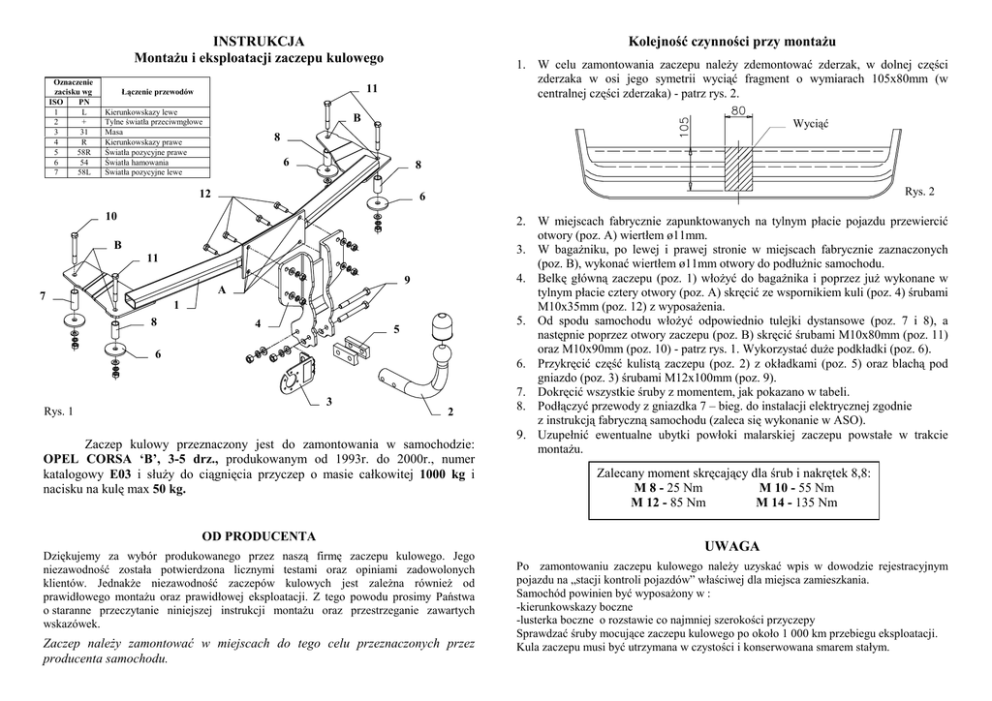 INSTRUKCJA MontaŜu i eksploatacji zaczepu kulowego Oznaczenie zacisku wg ISO PN 1 L 2 + 3 31 4 R 5 58R 6 54 7 58L Kolejność czynności przy montaŜu 1. W celu zamontowania zaczepu naleŜy zdemontować zderzak, w dolnej części zderzaka w osi jego symetrii wyciąć fragment o wymiarach 105x80mm (w centralnej części zderzaka) - patrz rys. 2. 11 Łączenie przewodów Kierunkowskazy lewe Tylne światła przeciwmgłowe Masa Kierunkowskazy prawe Światła pozycyjne prawe Światła hamowania Światła pozycyjne lewe B Wyciąć 8 6 8 12 Rys. 2 6 10 B 11 9 A 7 1 8 4 5 6 3 Rys. 1 2 Zaczep kulowy przeznaczony jest do zamontowania w samochodzie: OPEL CORSA ‘B’, 3-5 drz., produkowanym od 1993r. do 2000r., numer katalogowy E03 i słuŜy do ciągnięcia przyczep o masie całkowitej 1000 kg i nacisku na kulę max 50 kg. OD PRODUCENTA Dziękujemy za wybór produkowanego przez naszą firmę zaczepu kulowego. Jego niezawodność została potwierdzona licznymi testami oraz opiniami zadowolonych klientów. JednakŜe niezawodność zaczepów kulowych jest zaleŜna równieŜ od prawidłowego montaŜu oraz prawidłowej eksploatacji. Z tego powodu prosimy Państwa o staranne przeczytanie niniejszej instrukcji montaŜu oraz przestrzeganie zawartych wskazówek. Zaczep naleŜy zamontować w miejscach do tego celu przeznaczonych przez producenta samochodu. 2. W miejscach fabrycznie zapunktowanych na tylnym płacie pojazdu przewiercić otwory (poz. A) wiertłem ø11mm. 3. W bagaŜniku, po lewej i prawej stronie w miejscach fabrycznie zaznaczonych (poz. B), wykonać wiertłem ø11mm otwory do podłuŜnic samochodu. 4. Belkę główną zaczepu (poz. 1) włoŜyć do bagaŜnika i poprzez juŜ wykonane w tylnym płacie cztery otwory (poz. A) skręcić ze wspornikiem kuli (poz. 4) śrubami M10x35mm (poz. 12) z wyposaŜenia. 5. Od spodu samochodu włoŜyć odpowiednio tulejki dystansowe (poz. 7 i 8), a następnie poprzez otwory zaczepu (poz. B) skręcić śrubami M10x80mm (poz. 11) oraz M10x90mm (poz. 10) - patrz rys. 1. Wykorzystać duŜe podkładki (poz. 6). 6. Przykręcić część kulistą zaczepu (poz. 2) z okładkami (poz. 5) oraz blachą pod gniazdo (poz. 3) śrubami M12x100mm (poz. 9). 7. Dokręcić wszystkie śruby z momentem, jak pokazano w tabeli. 8. Podłączyć przewody z gniazdka 7 – bieg. do instalacji elektrycznej zgodnie z instrukcją fabryczną samochodu (zaleca się wykonanie w ASO). 9. Uzupełnić ewentualne ubytki powłoki malarskiej zaczepu powstałe w trakcie montaŜu. Zalecany moment skręcający dla śrub i nakrętek 8,8: M 8 - 25 Nm M 10 - 55 Nm M 12 - 85 Nm M 14 - 135 Nm UWAGA Po zamontowaniu zaczepu kulowego naleŜy uzyskać wpis w dowodzie rejestracyjnym pojazdu na „stacji kontroli pojazdów” właściwej dla miejsca zamieszkania. Samochód powinien być wyposaŜony w : -kierunkowskazy boczne -lusterka boczne o rozstawie co najmniej szerokości przyczepy Sprawdzać śruby mocujące zaczepu kulowego po około 1 000 km przebiegu eksploatacji. Kula zaczepu musi być utrzymana w czystości i konserwowana smarem stałym. PPUH AUTO-HAK S.J. WyposaŜenie zaczepu: Produkcja Haków Holowniczych Henryk & Zbigniew Nejman 76-200 SŁUPSK ul. Słoneczna 16K tel/fax (059) 8-414-414; 8-414-413 E-mail: [email protected] www. autohak.com.pl Zaczep kulowy bez wyposaŜenia elektrycznego Klasa: A50-X Nr kat. E03 Przeznaczony do zamontowania w samochodzie: Producent: OPEL Model: CORSA ‘B’ Typ: 3-5drz. produkowanego od 1993r. do 2000r. KARTA GWARANCYJNA Dane techniczne: Wartość siły D : 6,00 kN maksymalna masa przyczepy: 1000 kg maksymalny nacisk na kulę: 50 kg Numer homologacji zgodnie z wytycznymi regulaminu EKG/ONZ 55.01: E20-55R-01 0905 Producent udziela gwarancji niniejszą kartą gwarancyjną na okres 24 miesięcy licząc od dnia zakupu zaczepu kulowego do samochodu: OPEL CORSA ‘B’ 3-5 drz. produkowanego od 1993r. do 2000r. Data produkcji .............................. Data zakupu............................................. Zakres gwarancji obejmuje wyłącznie wady jakościowe wynikające z winy producenta. Gwarancja nie obejmuje natomiast uszkodzeń zawinionych przez nabywcę, wynikających z niewłaściwego montaŜu, uŜytkowania lub konserwacji, uszkodzeń mechanicznych, normalnego zuŜycia podczas eksploatacji itp. Gwarancja udzielona na zakupiony towar nie wyłącza, nie ogranicza ani nie zawiesza uprawnień kupującego wynikających z niezgodności towaru z umową. Reklamacje naleŜy zgłaszać w punkcie sprzedaŜy, składając jednocześnie kartę gwarancyjną. Usunięcie "wady" następuje po stwierdzeniu przez punkt sprzedaŜy wspólnie z producentem słuszności złoŜonej reklamacji. Reklamacja powinna być załatwiona w ciągu 14 dni od dnia uznania reklamacji. Karta gwarancyjna jest niewaŜna jeŜeli nie jest wypełniona i podpisana. Data zgłoszenia reklamacji: ................................................................... INFORMACJA WSTĘPNA Zaczep kulowy jest skonstruowany zgodnie z zasadami bezpieczeństwa ruchu drogowego. Zaczep kulowy jest elementem wpływającym na bezpieczeństwo jazdy i moŜe zostać zainstalowany wyłącznie przez personel wyspecjalizowany. Niedopuszczalne jest dokonywanie jakichkolwiek zmian w konstrukcji zaczepu. Powoduje to wygaśniecie dopuszczenia do stosowania. W przypadku obecności masy izolacyjnej lub osłony podwozia w miejscu przylegania zaczepu, naleŜy ją usunąć. Nieosłonięte miejsca karoserii oraz wywiercone otwory naleŜy pomalować farbą antykorozyjną. Informacjami wiąŜącymi odnośnie wartości obciąŜeń są dane podawane przez producenta samochodu, względnie wartości maksymalnej masy przyczepy oraz maksymalnego nacisku na kulę, przy czym wartości parametrów zaczepu kulowego nie mogą być przekroczone. Wzór do obliczania wartości siły D: Maks. masa przyczepy [kg] x Maks. masa samochodu [kg] Maks. masa przyczepy [kg] + Maks. masa samochodu [kg] X 9,81 = 1000 D [kN]