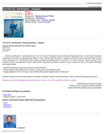Informacje o produkcie Utworzono 02-03-2017 Tai Chi 24 i 48 Postaw - książka Cena : 35,00 zł Producent : Wydawnictwo YMAA Dostępność : Dostępny Stan magazynowy : bardzo wysoki Średnia ocena : brak recenzji Tai Chi 24 i 48 Postaw z Zastosowaniami - książka Autorzy: Mistrz Liang Shou-Yu, Wu Wen-Ching 192 strony 620 ilustracji format B5 Unikalny podręcznik - wprowadzenie do Tai Chi Chuan (Taijiquan) ścieżki zdrowia, długowieczności i sztuki walki wiodącej człowieka do harmonii z otaczającą go Naturą. Autor (Liang) obecnie jeden z najwyżej cenionych trenerów prezentuje krok po kroku sekwencje 24 i 48 Postaw, które cieszą się ogromną popularnością w Chinach i na całym świecie. Oprócz samych form omawia również szczegółowo metody oddychania, kierowania umysłem, regulacji ciała i rozwoju Qi (Chi). Do książki dostępna jest kaseta wideo. ● ● ● Odkryj jak praktyka Taiji może wzmocnić twoje zdrowie Poznaj bojowe zastosowania form, które uczynią twą naukę bardziej żywą Sięgnij głębiej do teorii Yin-Yang i Pięciu Elementów dzięki objaśnieniom i ilustracjom Książka ta oprócz promocji zdrowotnych aspektów Taijiquan oferuje zainteresowanym wiele cennych zastosowań bojowych. Pragnę wyrazić moje najgłębsze uznanie trenerom Liang i Wu za ten wspaniały, twórczy wysiłek. Wielka Mistrzyni Wang, Ju-Rong Profesor China Shanghai Athletic Institute Sędzia chińskiego Wushu klasy państwowej Do książki dostępne są również:: ● ● Płyta DVD Zestaw książka + płyta DVD Zobacz zawartość książki (pliki PDF do pobrania): ● ● ● Wstęp Rozdział 1 Rozdział 4 O autorach Wygenerowano w programie www.oscGold.com Mistrz Liang Shou-Yu rozpoczął naukę Qigong mając 6 lat pod okiem swojego dziadka, Liang Zhi-Xiang. Uczył się u najbardziej znanych mistrzów z południa i północy Chin. Opanował ponad 100 sekwencji ruchowych różnych styli. Mistrz Liang poświęcił ponad 50 lat na praktyke i nauczanie chińskich sztuk walki i Qigong. Obecnie mieszka w Vancouver, w Kanadzie. Wu, Wen-Ching urodził się na Tajwanie w 1964 r. Po przeprowadzce do Bostonu w roku 1983 podjął studia na Northeastern University i rozpoczął naukę u dr Yang Jwing-Ming'a. Po 3 latach treningu został przedstawiony mistrzowi Liang Shou-Yu, u którego uczył się Taijiquan, Baguazhang, Xingyiquan i innych styli. Zdobywał wielokrotnie mistrzostwo Stanów Zjednoczonych w chińskich sztukach walki.