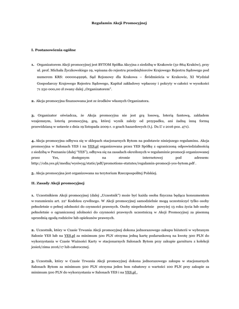 Regulamin Akcji Promocyjnej I. Postanowienia ogólne 1. Organizatorem Akcji promocyjnej jest BYTOM Spółka Akcyjna z siedzibą w Krakowie (31-864 Kraków), przy ul. prof. Michała Życzkowskiego 19, wpisana do rejestru przedsiębiorców Krajowego Rejestru Sądowego pod numerem KRS: 0000049296, Sąd Rejonowy dla Krakowa – śródmieścia w Krakowie, XI Wydział Gospodarczy Krajowego Rejestru Sądowego, Kapitał zakładowy wpłacony i pokryty w całości w wysokości 71 250 000,00 zł zwany dalej „Organizatorem". 2. Akcja promocyjna finansowana jest ze środków własnych Organizatora. 3. Organizator oświadcza, że Akcja promocyjna nie jest grą losową, loterią fantową, zakładem wzajemnym, loterią promocyjną, grą, której wynik zależy od przypadku, ani żadną inną formą przewidzianą w ustawie z dnia 19 listopada 2009 r. o grach hazardowych (t.j. Dz.U z 2016 poz. 471). 4. Akcja promocyjna odbywa się w sklepach stacjonarnych Bytom na podstawie niniejszego regulaminu. Akcja promocyjna w Salonach YES i na YES.pl organizowana przez YES Spółkę z ograniczoną odpowiedzialnością z siedzibą w Poznaniu (dalej “YES”), odbywa się na zasadach określonych w regulaminie promocji organizowanej przez Yes, dostępnym na stronie internetowej pod adresem: http://cdn.yes.pl/media/wysiwyg/static/pdf/promotions-statutes/regulamin-promocji-yes-bytom.pdf . 5. Akcja promocyjna jest organizowana na terytorium Rzeczpospolitej Polskiej. II. Zasady Akcji promocyjnej 1. Uczestnikiem Akcji promocyjnej (dalej „Uczestnik") może być każda osoba fizyczna będąca konsumentem w rozumieniu art. 221 Kodeksu cywilnego. W Akcji promocyjnej samodzielnie mogą uczestniczyć tylko osoby pełnoletnie o pełnej zdolności do czynności prawnych. Osoby niepełnoletnie powyżej 13 roku życia lub osoby pełnoletnie o ograniczonej zdolności do czynności prawnych uczestniczą w Akcji Promocyjnej za pisemną uprzednią zgodą rodziców lub opiekunów prawnych. 2. Uczestnik, który w Czasie Trwania Akcji promocyjnej dokona jednorazowego zakupu biżuterii w wybranym Salonie YES lub na YES.pl za minimum 50o PLN otrzyma jedną kartę podarunkową na kwotę 300 PLN do wykorzystania w Czasie Ważności Karty w stacjonarnych Salonach Bytom przy zakupie garnituru z kolekcji jesień/zima 2016/17 lub całorocznej. 3. Uczestnik, który w Czasie Trwania Akcji promocyjnej dokona jednorazowego zakupu w stacjonarnych Salonach Bytom za minimum 500 PLN otrzyma jeden bon rabatowy o wartości 100 PLN przy zakupie za minimum 500 PLN do wykorzystania w Salonach YES i na YES.pl . 4. Karty podarunkowe wydawane są w okresie: 05-31.07.2016 lub do ich wyczerpania (Czas Trwania Akcji). 5. Karty podarunkowe ważne są do 31.10.2016 (Czas Ważności Karty). 6. Karty podarunkowe obowiązują wyłącznie na garnitury z kolekcji jesień/zima 2016/2017 i z kolekcji całorocznej. Karty podarunkowe nie obowiązują na garnitury z kolekcji jesień/zima 2016/2017 i z kolekcji całorocznej objęte inną promocją. Dopuszczalne jest wykorzystanie tylko jednej karty podarunkowej przy zakupie jednego garnituru. Nie jest dopuszczalne także łączne wykorzystanie do zakupu jednego garnituru karty podarunkowej i innego rabatu oferowanego przez Organizatora. 7. Zasady promocji związane z wykorzystaniem bonów rabatowych w salonach YES i na YES.pl uregulowane są w regulaminie promocji YES dostępnym na stronie internetowej YES. III . Odpowiedzialność Organizatora 1. Organizator nie ponosi odpowiedzialności za problemy w funkcjonowaniu Akcji promocyjnej, jeżeli nastąpiły one wskutek zdarzeń, których Organizator, przy zachowaniu należytej staranności, nie był w stanie przewidzieć, lub którym nie mógł zapobiec, w szczególności w przypadku problemów związanych ze zdarzeniami losowymi o charakterze siły wyższej. 2. Organizator nie przetwarza danych osobowych Uczestników na potrzeby Akcji promocyjnej, z zastrzeżeniem postępowania reklamacyjnego, o którym mowa w IV poniżej. IV. Reklamacje 1. Organizator rozpatruje reklamacje dotyczące wyłącznie wykorzystywania kart podarunkowych. Reklamacje związane z wykorzystywaniem bonów rabatowych w Salonach YES i na YES.pl rozpatruje YES na zasadach przewidzianych w regulaminie akcji promocyjnej prowadzonej przez YES. 2. Reklamacje dotyczące sposobu przeprowadzenia Akcji promocyjnej mogą być składane od dnia rozpoczęcia Akcji promocyjnej do dnia 14 listopada 2016 r., tj. w terminie dwóch tygodni od dnia utraty ważności przez karty podarunkowe. 3. Reklamacje powinny być sporządzone w formie pisemnej i złożone bądź w stacjonarnym Salonie Bytom bądź przesłane na adres Organizatora. 4. Reklamacja powinna zawierać: a. imię, nazwisko i dokładny adres osoby reklamującej, adres e-mail i nr telefonu b. dokładny opis i powód reklamacji, c. wyraźną zgodę na przetwarzanie danych osobowych do celów reklamacji zgodnie z ustawą z dnia 29 sierpnia 1997 r. o chronię danych osobowych (t.j. Dz.U. z 2016 r., poz. 922). 4. Reklamacje złożone po terminie wskazanym w IV ust. 1 powyżej, jak i nie spełniające wymogów, o których mowa w IV ust. 4 powyżej, nie podlegają rozpoznaniu. 5. Organizator rozpatrzy reklamację i powiadomi Uczestnika o decyzji w terminie 14 dni od dnia jej otrzymania, listem poleconym na adres podany w reklamacji. V. Postanowienia końcowe 1. Regulamin Akcji promocyjnej dostępny jest na stronie internetowej Organizatora, w Salonach Organizatora jak i w jego siedzibie. 2. Wszystkie treści zawarte w materiałach reklamowo-promocyjnych dotyczących niniejszej Akcji promocyjnej mają jedynie charakter informacyjny. 3. Organizator zastrzega sobie prawo do zmiany niniejszego regulaminu oraz okresu obowiązywania Akcji promocyjnej, pod warunkiem, że zmiany te nie wpłyną na prawa nabyte przez Uczestników przed dniem dokonania zmiany. 4. W sprawach nieuregulowanych niniejszym Regulaminem, mają zastosowanie przepisy Kodeksu Cywilnego.