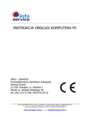 ___________________________________________________________________________ INSTRUKCJA OBSŁUGI KOMPUTERA PC INFO – SERVICE Przedsiębiorstwo Handlowo Usługowe Mariusz Kozioł 21-550 Terespol, ul. Szkolna 1 SKLEP ul. Wojska Polskiego 78 tel. (83) 311-11-85; (83)375-20-15 PHU „INFO-SERVICE” Mariusz Kozioł, ul. Szkolna 1, 21-550 Terespol, SKLEP ul. Wojska Polskiego 78 tel. (083) 311-11-85, kom. 0506-055-240, NIP 537-138-38-19, Regon 030233844 konto: Bank Spółdzielczy Terespol nr 15 8037 1021 0000 6103 2000 0001 www.terespol.net.pl e-mail: [email protected] ___________________________________________________________________________ Uruchomienie i bezpieczne wyłączenie komputera Uruchamianie komputera Uruchamianie komputera polega na naciśnięciu dużego przycisku z frontu obudowy oraz na naciśnięciu przycisku włączającego na obudowie monitora. Po tej czynności należy poczekać (około dwóch - trzech minut), aż cały system zakończy procedurę otwierania i po tym czasie komputer jest gotowy do pracy. Bezpieczne wyłączanie komputera Bezpieczne wyłączanie komputera polega na: - zakończeniu pracy programów, przez najechanie kursorem /strzałką / na znak " X " w prawym górnym rogu ekranu i kliknięciem lewym klawiszem "myszki", zamykamy kolejno wszystkie pootwierane okna programów; - odnalezieniu w dolnym lewym rogu ekranu monitora napisu "Start", Klikamy na niego lewym klawiszem "myszki" pojawi się lista rozwijana. Na dole tej listy odszukujemy napis "zamknij", i klikamy lewym klawiszem "myszki". Pojawi się plansza z napisem "Zamknij system Windows". Najeżdżamy kursorem na napis "OK" i klikamy lewy klawisz myszki. Po naciśnięciu system sam dokona procedury zamykania pracy komputera (około 1 minuty), pozostaje nam jedynie nacisnąć przycisk na obudowie monitora (wyłączenie monitora). Po zakończeniu pracy przeważnie nie należy naciskać ponownie przycisku na obudowie komputera, ponieważ ta czynność spowoduje ponowne uruchomienie systemu. PHU „INFO-SERVICE” Mariusz Kozioł, ul. Szkolna 1, 21-550 Terespol, SKLEP ul. Wojska Polskiego 78 tel. (083) 311-11-85, kom. 0506-055-240, NIP 537-138-38-19, Regon 030233844 konto: Bank Spółdzielczy Terespol nr 15 8037 1021 0000 6103 2000 0001 www.terespol.net.pl e-mail: [email protected] ___________________________________________________________________________ Czego nie wolno robić w czasie pracy komputera W czasie pracy komputera nie wolno: - wyłączać komputera przez naciśnięcie przycisku z przodu na obudowie lub przez wyjmowanie wtyczki z gniazda zasilania elektrycznego; - wkładać wtyczek do gniazd, od kabli podłączanych z tyłu obudowy, z wyjątkiem końcówki USB; wyjmować "dyskietek" dopóki nie zgaśnie kontrolka pracy stacji; - zaraz po wyłączeniu komputera, ponownie go włączać (trzeba odczekać co najmniej siedem minut). Zawieszanie się systemu Zawieszanie się systemu w czasie pracy, objawia się tym że system czasami wykonując nieodpowiednie operacje zatrzymuje się i nie reaguje na naciskanie klawiszy klawiatury i klikanie "myszką". W takich sytuacjach należy odszukać na klawiaturze, klawisz z napisem " Esc" (lewy górny róg klawiatury) i go nacisnąć. Często naciśnięcie "Esc" nie daje rezultatu, odszukujemy na klawiaturze przyciski (na dole klawiatury): "Alt", "Ctrl", "Del". Naciskamy te klawisze kolejno ale w taki sposób że po naciśnięciu "Alt" jednym palcem nie puszczając tego klawisza, drugim palcem naciskamy "Ctrl", którego też nie puszczamy i trzecim palcem naciskamy "Del". Pojawi się plansza "Zakończ zadanie". Należy odszukać napis "zakończ zadanie" najechać kursorem i kliknąć lewym przyciskim "myszki". Po chwili (od jednej do kilku minut), program powinien zostać odwieszony. Czasami może pojawić się obraz monitora bez tła, z małym napisem "przywróć mój pulpit" - należy na ten napis najechać kursorem i kliknąć lewy klawisz "myszki". Przy bardzo masywnych zawieszeniach, kiedy komputer nie reaguje na kilkakrotnie powtarzane poprzednie czynności, należy nacisnąć mały przycisk znajdujący się z przodu na obudowie komputera, z napisem "RESET". Spowoduje to zamknięcie i ponowne awaryjne uruchomienie komputera. Tym razem takie awaryjne uruchamianie może potrwać dość długo ponieważ system musi naprawić błędy. Taki sam sposób uruchamiania komputera jak po naciśnięciu przycisku "RESET" system wykona jeśli komputer został wyłączony nieprawidłowo np. jeśli nastąpi przerwa w dopływie energii elektrycznej (wyłączenie prądu). Należy zawsze pamiętać aby komputer zamykać prawidłowo. PHU „INFO-SERVICE” Mariusz Kozioł, ul. Szkolna 1, 21-550 Terespol, SKLEP ul. Wojska Polskiego 78 tel. (083) 311-11-85, kom. 0506-055-240, NIP 537-138-38-19, Regon 030233844 konto: Bank Spółdzielczy Terespol nr 15 8037 1021 0000 6103 2000 0001 www.terespol.net.pl e-mail: [email protected] ___________________________________________________________________________ Wirusy komputerowe Wirus komputerowy to program, który bez wiedzy użytkownika przedostaje się do pamięci komputera, doczepiony do swojego nosiciela (zarażonego programu, dokumentu) lub też przesyłany przez Internet. Wirus na ogół wyposażony jest w złośliwe funkcje kasujące pliki, niszczące dyski twarde lub wyświetlające śmieszne według ich autora komunikaty. O wirusach komputerowych Wirus komputerowy to program napisany przez informatyków. Wirusy komputerowe czynią bardzo wiele szkód. Łagodne odmiany mają charakter żartów i jedynie utrudniają pracę, wyświetlają śmieszne (zdaniem autorów) komunikaty na ekranie lub powodują inne niegroźne zmiany w pracy komputera. Natomiast odmiany wirusów, pisane i rozprowadzane w celach innych różnych struktur, są na ogół dość złośliwe i nie tylko niszczą zapisane w komputerach dane ale czasami potrafią zniszczyć sprzęt. Jak ustrzec własny komputer przed zakażeniem wirusem ? - nie należy wkł