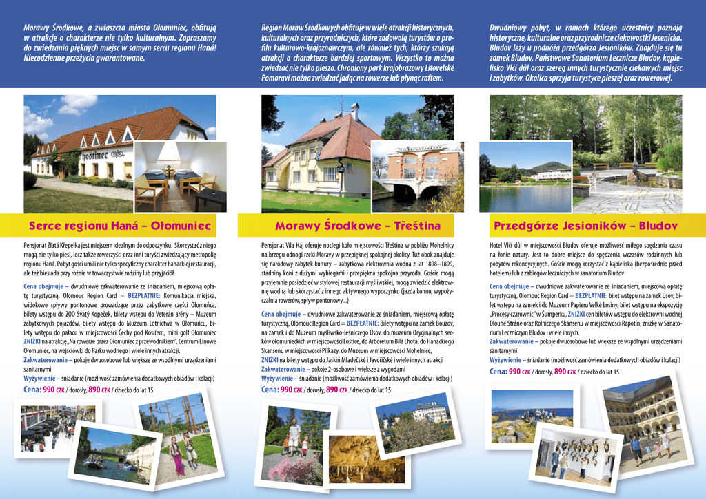 Morawy Środkowe, a zwłaszcza miasto Ołomuniec, obfitują w atrakcje o charakterze nie tylko kulturalnym. Zapraszamy do zwiedzania pięknych miejsc w samym sercu regionu Haná! Niecodzienne przeżycia gwarantowane. Region Moraw Środkowych obfituje w wiele atrakcji historycznych, kulturalnych oraz przyrodniczych, które zadowolą turystów o profilu kulturowo-krajoznawczym, ale również tych, którzy szukają atrakcji o charakterze bardziej sportowym. Wszystko to można zwiedzać nie tylko pieszo. Chroniony park krajobrazowy Litovelské Pomoraví można zwiedzać jadąc na rowerze lub płynąc raftem. Dwudniowy pobyt, w ramach którego uczestnicy poznają historyczne, kulturalne oraz przyrodnicze ciekawostki Jesenicka. Bludov leży u podnóża przedgórza Jesioników. Znajduje się tu zamek Bludov, Państwowe Sanatorium Lecznicze Bludov, kąpielisko Vlčí důl oraz szereg innych turystycznie ciekawych miejsc i zabytków. Okolica sprzyja turystyce pieszej oraz rowerowej. Serce regionu Haná – Ołomuniec Morawy Środkowe – Třeština Przedgórze Jesioników – Bludov Pensjonat Zlatá Křepelka jest miejscem idealnym do odpoczynku. Skorzystać z niego mogą nie tylko piesi, lecz także rowerzyści oraz inni turyści zwiedzający metropolię regionu Haná. Pobyt gości umili nie tylko specyficzny charakter hanackiej restauracji, ale też biesiada przy rożnie w towarzystwie rodziny lub przyjaciół. Pensjonat Vila Háj oferuje noclegi koło miejscowości Třeština w pobliżu Mohelnicy na brzegu odnogi rzeki Moravy w przepięknej spokojnej okolicy. Tuż obok znajduje się narodowy zabytek kultury – zabytkowa elektrownia wodna z lat 1898–1899, stadniny koni z dużymi wybiegami i przepiękna spokojna przyroda. Goście mogą przyjemnie posiedzieć w stylowej restauracji myśliwskiej, mogą zwiedzić elektrownię wodną lub skorzystać z innego aktywnego wypoczynku (jazda konno, wypożyczalnia rowerów, spływ pontonowy...) Hotel Vlčí důl w miejscowości Bludov oferuje możliwość miłego spędzania czasu na łonie natury. Jest to dobre miejsce do spędzenia wczasów rodzinnych lub pobytów rekondycyjnych. Goście mogą korzystać z kąpieliska (bezpośrednio przed hotelem) lub z zabiegów leczniczych w sanatorium Bludov Cena obejmuje – dwudniowe zakwaterowanie ze śniadaniem, miejscową opłatę turystyczną, Olomouc Region Card = BEZPŁATNIE: Komunikacja miejska, widokowe spływy pontonowe prowadzące przez zabytkowe części Ołomuńca, bilety wstępu do ZOO Svatý Kopeček, bilety wstępu do Veterán arény – Muzeum zabytkowych pojazdów, bilety wstępu do Muzeum Lotnictwa w Ołomuńcu, bilety wstępu do pałacu w miejscowości Čechy pod Kosířem, mini golf Ołomuniec ZNIŻKI na atrakcję „Na rowerze przez Ołomuniec z przewodnikiem”, Centrum Linowe Ołomuniec, na wejściówki do Parku wodnego i wiele innych atrakcji. Zakwaterowanie – pokoje dwuosobowe lub większe ze wspólnymi urządzeniami sanitarnymi Wyżywienie – śniadanie (możliwość zamówienia dodatkowych obiadów i kolacji) Cena obejmuje – dwudniowe zakwaterowanie ze śniadaniem, miejscową opłatę turystyczną, Olomouc Region Card = BEZPŁATNIE: Bilety wstępu na zamek Bouzov, na zamek i do Muzeum myśliwsko-leśniczego Úsov, do muzeum Oryginalnych serków ołomunieckich w miejscowości Loštice, do Arboretum Bílá Lhota, do Hanackiego Skansenu w miejscowości Příkazy, do Muzeum w miejscowości Mohelnice, ZNIŻKI na bilety wstępu do Jaskiń Mladečské i Javořičské i wiele innych atrakcji Zakwaterowanie – pokoje 2-osobowe i większe z wygodami Wyżywienie – śniadanie (możliwość zamówienia dodatkowych obiadów i kolacji) Cena: 990 CZK / dorosły, 890 CZK / dziecko do lat 15 Cena: 990 CZK / dorosły, 890 CZK / dziecko do lat 15 Cena obejmuje – dwudniowe zakwaterowanie ze śniadaniem, miejscową opłatę turystyczną, Olomouc Region Card = BEZPŁATNIE: bilet wstępu na zamek Usov, bilet wstępu na zamek i do Muzeum Papieru Velké Losiny, bilet wstępu na ekspozycję „Procesy czarownic” w Šumperku, ZNIŻKI cen biletów wstępu do elektrowni wodnej Dlouhé Stráně oraz Rolniczego Skansenu w miejscowości Rapotín, zniżkę w Sanatorium Leczniczym Bludov i wiele innych. Zakwaterowanie – pokoje dwuosobowe lub większe ze wspólnymi urządzeniami sanitarnymi Wyżywienie – śniadanie (możliwość zamówienia dodatkowych obiadów i kolacji) Cena: 990 CZK / dorosły, 890 CZK / dziecko do lat 15 Region Jesenicko obfituje w wiele zabytków, atrakcji kulturalnych, przyrodniczych i innych, które zadowolą turystów szukających kultury i sportu. Miejscowość Branná jest świetnym punktem wyjścia dla tych, którzy pragną odkrywać historię oraz kulturę regionu. Branná jest miejskim obszarem zabytkowym. To świetne miejsce do uprawiania turystyki rowerowej. Można skorzystać z przyjemnych leśnych oraz innych tras, które prowadzą wśród wspaniałej przyrody. Świetnym pomysłem jest również piesza wyprawa w celu zwiedzenia okolicy lub skorzystanie z nowej ścieżki dla hulajnóg. Więcej o pakietach pobytowych na: Biuro podróży (Cestovní kancelář) PEŘEJ tours s.r.o. Třída Svobody 39, 779 00 Olomouc tel./fax/zázn.: +420 585 313 176 mobil: +420 603 113 344 e-mail: [email protected] • www.perej.cz Pozostałe oferty biura podróży CK Peřej tours Aktywne wycieczki i urlop na rzece „Turystyka wodniacka dla wszystkich” • inne programy w Kraju Ołomunieckim – woda, rowery, konie, wspinaczka, kultura, gastronomia, … • rejsy jednodniowe i weekendowe po innych rzekach • tygodniowa wędrówka wodniacko-turystyczna po rzekach w kraju i za granicą • oferty specjalne: • kombinacja woda + rowery, konie, wspinaczka • weekendy sportowe i zapoznawcze • dziecięce i młodzieżowe obozy wodniackie /również z turystyką rowerową i wspinaczką/ • wycieczki wodniacko-poznawcze i kursy dla kolektywów szkolnych i dziecięcych • firmowe programy outdoo
