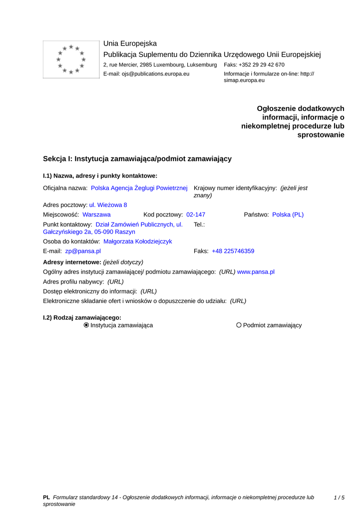Unia Europejska Publikacja Suplementu do Dziennika Urzędowego Unii Europejskiej 2, rue Mercier, 2985 Luxembourg, Luksemburg Faks: +352 29 29 42 670 E-mail: [email protected] Informacje i formularze on-line: http:// simap.europa.eu Ogłoszenie dodatkowych informacji, informacje o niekompletnej procedurze lub sprostowanie Sekcja I: Instytucja zamawiająca/podmiot zamawiający I.1) Nazwa, adresy i punkty kontaktowe: Oficjalna nazwa: Polska Agencja Żeglugi Powietrznej Krajowy numer identyfikacyjny: (jeżeli jest znany) _____ Adres pocztowy: ul. Wieżowa 8 Miejscowość: Warszawa Kod pocztowy: 02-147 Punkt kontaktowy: Dział Zamówień Publicznych, ul. Gałczyńskiego 2a, 05-090 Raszyn Państwo: Polska (PL) Tel.: _____ Osoba do kontaktów: Małgorzata Kołodziejczyk E-mail: [email protected] Faks: +48 225746359 Adresy internetowe: (jeżeli dotyczy) Ogólny adres instytucji zamawiającej/ podmiotu zamawiającego: (URL) www.pansa.pl Adres profilu nabywcy: (URL) _____ Dostęp elektroniczny do informacji: (URL) _____ Elektroniczne składanie ofert i wniosków o dopuszczenie do udziału: (URL) _____ I.2) Rodzaj zamawiającego: Instytucja zamawiająca Podmiot zamawiający PL Formularz standardowy 14 - Ogłoszenie dodatkowych informacji, informacje o niekompletnej procedurze lub sprostowanie 1/5 Sekcja II: Przedmiot zamówienia II.1.1) Nazwa nadana zamówieniu: ŚWIADCZENIE USŁUG SPECJALISTYCZNEJ POMOCY PRAWNEJ DLA INTELLECTUAL PROPERTY RIGHTS II.1.2) Krótki opis zamówienia lub zakupu: (podano w pierwotnym ogłoszeniu) Przedmiotem zamówienia jest świadczenie usług specjalistycznej pomocy prawnej wiążącej się z koniecznością znajomości i stosowania prawa polskiego, UE, międzynarodowego oraz belgijskiego, niemieckiego i hiszpańskiego dla Intellectual Property Rights (IPR). Świadczenie pomocy prawnej w sprawach prowadzonych przez Zamawiającego odbywać się będzie w zakresie określonym w ustawie z dnia 6 lipca z 1982 r. o radcach prawnych (j.t. Dz.U. 2016 poz. 233), ustawie z dnia 26 maja 1982 r. prawo o adwokaturze (j.t. Dz.U. z 2015 r. poz. 615 ze zm.) lub ustawie z dnia 5 lipca 1996 r. o doradztwie podatkowym (j.t. Dz.U. z 2016, poz. 794) oraz ustawie z dnia 5 lipca 2002 r. o świadczeniu przez prawników zagranicznych pomocy prawnej w Rzeczypospolitej Polskiej (j.t. Dz.U. z 2014, poz. 134 z późn. zm.). II.1.3) Wspólny Słownik Zamówień (CPV) Główny przedmiot Słownik główny 79100000 Słownik uzupełniający (jeżeli dotyczy) PL Formularz standardowy 14 - Ogłoszenie dodatkowych informacji, informacje o niekompletnej procedurze lub sprostowanie 2/5 Sekcja IV: Procedura IV.1)Rodzaj procedury (podano w pierwotnym ogłoszeniu) Otwarta Ograniczona Ograniczona przyspieszona Negocjacyjna Negocjacyjna przyspieszona Dialog konkurencyjny Negocjacyjna z uprzednim ogłoszeniem Negocjacyjna bez uprzedniego ogłoszenia Negocjacyjna z publikacją ogłoszenia o zamówieniu Negocjacyjna bez publikacji ogłoszenia o zamówieniu Udzielenie zamówienia bez uprzedniej publikacji ogłoszenia o zamówieniu w Dzienniku Urzędowym Unii Europejskiej IV.2)Informacje administracyjne IV.2.1)Numer referencyjny: (podano w pierwotnym ogłoszeniu) AQW-2227-24/63/2016 IV.2.2)Dane referencyjne ogłoszenia w przypadku ogłoszeń przesłanych drogą elektroniczną: Pierwotne ogłoszenie przesłane przez eNotices TED eSender Login: ENOTICES_PAZP Dane referencyjne ogłoszenia: 2016-093942 rok i numer dokumentu IV.2.3)Ogłoszenie, którego dotyczy niniejsza publikacja: Numer ogłoszenia w Dz.U.: 2016/S 142-257651 z dnia: 26/07/2016 (dd/mm/rrrr) IV.2.4)Data wysłania pierwotnego ogłoszenia: 21/07/2016 (dd/mm/rrrr) PL Formularz standardowy 14 - Ogłoszenie dodatkowych informacji, informacje o niekompletnej procedurze lub sprostowanie 3/5 Sekcja VI: Informacje uzupełniające VI.1) Ogłoszenie dotyczy: Procedury niepełnej Sprostowania Informacji dodatkowych VI.2) Informacje na temat niepełnej procedury udzielenia zamówienia: Postępowanie o udzielenie zamówienia zostało przerwane Postępowanie o udzielenie zamówienia uznano za nieskuteczne Zamówienia nie udzielono Zamówienie może być przedmiotem ponownej publikacji VI.3) Informacje do poprawienia lub dodania : VI.3.1) Zmiana oryginalnej informacji podanej przez instytucję zamawiającą Publikacja w witrynie TED niezgodna z oryginalną informacją, przekazaną przez instytucję zamawiającą Oba przypadki VI.3.2) W ogłoszeniu pierwotnym W odpowiedniej dokumentacji przetargowej (więcej informacji w odpowiedniej dokumentacji przetargowej) W obu przypadkach (więcej informacji w odpowiedniej dokumentacji przetargowej) VI.3.3) Tekst, który należy poprawić w pierwotnym ogłoszeniu Miejsce, w którym znajduje się Zamiast: zmieniany tekst: VI.3) Informacje dodatkowe VI.3.4) Daty, które należy poprawić w pierwotnym ogłoszeniu Miejsce, w którym znajdują się Zamiast: zmieniane daty: Powinno być: 12. Zamawiający przewiduje udzielenie zamówień uzupełniających, o których mowa w art. 67 ust. 1 pkt 6 ustawy. Zgodnie z art. 67 ust. 1 pkt. 6 ustawy Zamawiający może udzielić zamówienia z wolnej ręki, w przypadku udzielenia, w okresie 3 lat od udzielenia zamówienia podstawowego, dotychczasowemu wykonawcy usług zamówień uzupełniających. Zamawiający przewiduje udzielenie zamówień uzupełniających stanowiących nie więcej niż 50% wartości zamówienia podstawowego i polegających na powtórzeniu tego samego rodzaju zamówień. Powinno być: VI.3.5) Adresy i punkty kontaktowe, które należy poprawić VI.3.6) Tekst, który należy dodać do pierwotnego ogłoszenia PL Formularz standardowy 14 - Ogłoszenie dodatkowych informacji, informacje o niekompletnej procedurze lub sprostowanie 4/5 Miejsce, w którym należy dodać tekst: Tekst do dodania: VI.4) Inne dodatkowe informacje: _____ VI.5) Data wysłania niniejszego ogłoszenia: 17/08/2016 (dd/mm/rrrr) - ID:2016-106402 PL Formularz standardowy 14 - Ogłoszenie dodatkowych informacji, inf