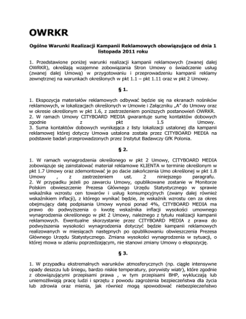 OWRKR Ogólne Warunki Realizacji Kampanii Reklamowych obowiązujące od dnia 1 listopada 2011 roku 1. Przedstawione poniżej warunki realizacji kampanii reklamowych (zwanej dalej OWRKR), określają wzajemne zobowiązania Stron Umowy o świadczenie usług (zwanej dalej Umową) w przygotowaniu i przeprowadzeniu kampanii reklamy zewnętrznej na warunkach określonych w pkt 1.1 – pkt 1.11 oraz w pkt 2 Umowy. § 1. 1. Ekspozycja materiałów reklamowych odbywać będzie się na ekranach nośników reklamowych, w lokalizacjach określonych w Umowie i Załączniku „A” do Umowy oraz w okresie określonym w pkt 1.6, z zastrzeżeniem poniższych postanowień OWRKR. 2. W ramach Umowy CITYBOARD MEDIA gwarantuje sumę kontaktów dobowych zgodnie z pkt 1.5 Umowy. 3. Suma kontaktów dobowych wynikająca z listy lokalizacji ustalonej dla kampanii reklamowej której dotyczy Umowa ustalona została przez CITYBOARD MEDIA na podstawie badań przeprowadzonych przez Instytut Badawczy GfK Polonia. § 2. 1. W ramach wynagrodzenia określonego w pkt 2 Umowy, CITYBOARD MEDIA zobowiązuje się zainstalować materiał reklamowe KLIENTA w terminie określonym w pkt 1.7 Umowy oraz zdemontować je po dacie zakończenia Umo określonej w pkt 1.8 Umowy , z zastrzeżeniem ust. 2 niniejszego paragrafu. 2. W przypadku jeżeli po zawarciu Umowy, opublikowane zostanie w Monitorze Polskim obwieszczenie Prezesa Głównego Urzędu Statystycznego w sprawie wskaźnika wzrostu cen towarów i usług konsumpcyjnych (zwany dalej również wskaźnikiem inflacji), z którego wynikać będzie, że wskaźnik wzrostu cen za okres obejmujący datę podpisania Umowy wynosi ponad 4%, CITYBOARD MEDIA ma prawo do podwyższenia o kwotę wskaźnika inflacji wysokości umownego wynagrodzenia określonego w pkt 2 Umowy, należnego z tytułu realizacji kampanii reklamowych. Ewentualne skorzystanie przez CITYBOARD MEDIA z prawa do podwyższenia wysokości wynagrodzenia dotyczyć będzie kampanii reklamowych realizowanych w miesiącach następnych po opublikowaniu obwieszczenia Prezesa Głównego Urzędu Statystycznego. Zmiana wysokości wynagrodzenia w sytuacji, o której mowa w zdaniu poprzedzającym, nie stanowi zmiany Umowy o ekspozycję. § 3. 1. W przypadku ekstremalnych warunków atmosferycznych (np. ciągłe intensywne opady deszczu lub śniegu, bardzo niskie temperatury, porywisty wiatr), które zgodnie z obowiązującymi przepisami prawa , w tym przepisami BHP, wykluczają lub uniemożliwiają pracę ludzi i sprzętu z powodu zagrożenia bezpieczeństwa dla życia lub zdrowia oraz mienia, jak również mogą spowodować niebezpieczeństwo zniszczenia materiałów reklamowych KLIENTA, CITYBOARD MEDIA może przesunąć termin instalacji materiałów reklamowych, określony w pkt 1.7 Umowy i w ten sposób skrócić okres ekspozycji przy jednoczesnym zachowaniu prawa do wynagrodzenia umownego należnego za cały okres ekspozycji. O powyższym CITYBOARD MEDIA niezwłocznie powiadomi KLIENTA. § 4. 1. W przypadku jeżeli Strony uzgodniły, że producentem materiałów reklamowych jest KLIENT, KLIENT zobowiązany jest dostarczyć materiał reklamowy przeznaczony do prezentacji wraz z 20% zapasem do magazynu CITYBOARD MEDIA (adres magazynu: ul. Sokratesa 15 w Warszawie) w nieprzekraczalnym terminie określonym w pkt 1.9 Umowy, do godziny 12.00 (tj. co najmniej na 5 dni roboczych przed terminem instalacji). W przypadku nie zachowania przez KLIENTA terminu dostarczenia materiałów reklamowych, KLIENT zapłaci CITYBOARD MEDIA karę umowną w wysokości stanowiącej iloczyn kwoty 100 PLN i ilości ekranów, na których ma być przeprowadzona kampania reklamowa KLIENTA, określonych w pkt. 1.3 Umowy. Ponadto niezależnie od prawa do kary umownej CITYBOARD MEDIA uprawnione jest do przesunięcia terminu instalacji materiałów reklamowych i w ten sposób skrócenia okresu ekspozycji o tyle dni, o ile został przekroczony przez KLIENTA termin do dostarczenia materiałów reklamowych, przy jednoczesnym zachowaniu przez CITYBOARD MEDIA prawa do wynagrodzenia umownego należnego za cały okres ekspozycji. 2. W przypadku kampanii długookresowej, gdy producentem materiałów reklamowych jest KLIENT, KLIENT zobowiązany jest dostarczyć do CITYBOARD MEDIA materiały reklamowe wraz z 20% zapasem, przed rozpoczęciem poszczególnych okresów ekspozycji, zgodnie z warunkami określonymi w § 4 pkt 1 OWRKR, w takiej ilości, która zapewni ich wymianę z następującą częstotliwością: plakat papierowy wymieniany co 3 miesiące - plakat winylowy lub ekoplakat wymieniane co 6 miesięcy. 3. KLIENT zobowiązuje się najpóźniej na 5 dni przed instalacją materiałów reklamowych do przesłania layoutów wraz z podziałem na motywy i lokalizacje. W przypadku nie zachowania przez KLIENTA tego terminu, KLIENT zapłaci CITYBOARD MEDIA karę umowną w wysokości stanowiącej iloczyn kwoty 100 PLN i ilości ekranów, na których ma być przeprowadzona kampania reklamowa KLIENTA, określonych w pkt 1.3 Umowy. Ponadto niezależnie od prawa do kary umownej CITYBOARD MEDIA uprawnione jest do przesunięcia terminu instalacji materiałów reklamowych i w ten sposób skrócenia okresu ekspozycji o tyle dni, o ile został przekroczony przez KLIENTA termin do przesłania layoutów wraz z podziałem na motywy i lokalizacje, przy jednoczesnym zachowaniu przez CITYBOARD MEDIA prawa do wynagrodzenia umownego należnego za cały okres ekspozycji. 4. Strony uzgadniają, że przed wyklejeniem przez CITYBOARD MEDIA materiału reklamowego na nośnikach reklamowych, dokonane zostanie próbne wyklejenie materiału reklamowego w magazynie CITYBOARD MEDIA, celem jego zatwierdzenia przez KLIENTA. CITYBOARD MEDIA poinformuje drogą elektroniczną KLIENTA o terminie i miejscu zatwierdzenia próbnego wyklejenia papierowego materiału reklamowego. KLIENT jest zobowiązany do dokonania w formie pisemnej akceptacji próbnego wyklejenia. W przypadku jeżeli KLIENT nie stawi się we wskazanym