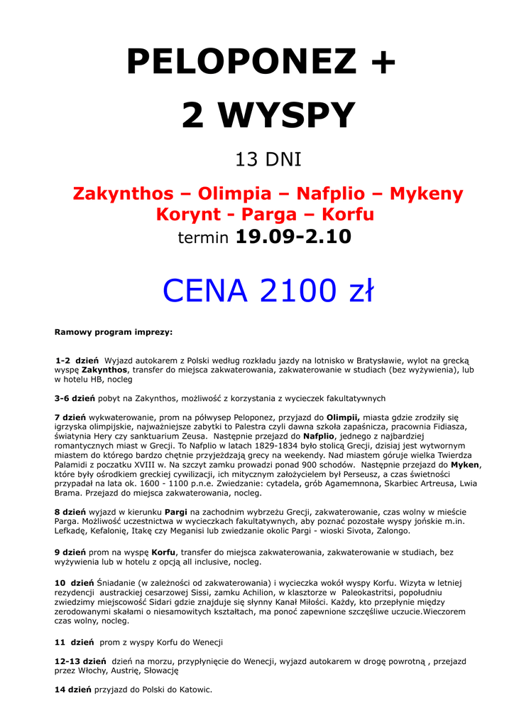 PELOPONEZ + 2 WYSPY 13 DNI Zakynthos – Olimpia – Nafplio – Mykeny Korynt - Parga – Korfu termin 19.09-2.10 CENA 2100 zł Ramowy program imprezy: 1-2 dzień Wyjazd autokarem z Polski według rozkładu jazdy na lotnisko w Bratysławie, wylot na grecką wyspę Zakynthos, transfer do miejsca zakwaterowania, zakwaterowanie w studiach (bez wyżywienia), lub w hotelu HB, nocleg 3-6 dzień pobyt na Zakynthos, możliwość z korzystania z wycieczek fakultatywnych 7 dzień wykwaterowanie, prom na półwysep Peloponez, przyjazd do Olimpii, miasta gdzie zrodziły się igrzyska olimpijskie, najważniejsze zabytki to Palestra czyli dawna szkoła zapaśnicza, pracownia Fidiasza, światynia Hery czy sanktuarium Zeusa. Następnie przejazd do Nafplio, jednego z najbardziej romantycznych miast w Grecji. To Nafplio w latach 1829-1834 było stolicą Grecji, dzisiaj jest wytwornym miastem do którego bardzo chętnie przyjeżdzają grecy na weekendy. Nad miastem góruje wielka Twierdza Palamidi z poczatku XVIII w. Na szczyt zamku prowadzi ponad 900 schodów. Następnie przejazd do Myken, które były ośrodkiem greckiej cywilizacji, ich mitycznym założycielem był Perseusz, a czas świetności przypadał na lata ok. 1600 - 1100 p.n.e. Zwiedzanie: cytadela, grób Agamemnona, Skarbiec Artreusa, Lwia Brama. Przejazd do miejsca zakwaterowania, nocleg. 8 dzień wyjazd w kierunku Pargi na zachodnim wybrzeżu Grecji, zakwaterowanie, czas wolny w mieście Parga. Możliwość uczestnictwa w wycieczkach fakultatywnych, aby poznać pozostałe wyspy jońskie m.in. Lefkadę, Kefalonię, Itakę czy Meganisi lub zwiedzanie okolic Pargi - wioski Sivota, Zalongo. 9 dzień prom na wyspę Korfu, transfer do miejsca zakwaterowania, zakwaterowanie w studiach, bez wyżywienia lub w hotelu z opcją all inclusive, nocleg. 10 dzień Śniadanie (w zależności od zakwaterowania) i wycieczka wokół wyspy Korfu. Wizyta w letniej rezydencji austrackiej cesarzowej Sissi, zamku Achilion, w klasztorze w Paleokastritsi, popołudniu zwiedzimy miejscowość Sidari gdzie znajduje się słynny Kanał Miłości. Każdy, kto przepłynie między zerodowanymi skałami o niesamowitych kształtach, ma ponoć zapewnione szczęśliwe uczucie.Wieczorem czas wolny, nocleg. 11 dzień prom z wyspy Korfu do Wenecji 12-13 dzień dzień na morzu, przypłynięcie do Wenecji, wyjazd autokarem w drogę powrotną , przejazd przez Włochy, Austrię, Słowację 14 dzień przyjazd do Polski do Katowic. Miejsca i godziny odjazdu autokaru miasto Godz. wyjazdu Kraków Gliwice Katowice Tychy Pszczyna Bielsko-Biała Łódź Częstochowa Wrocław Kędzierzyn K. Opole 19.40 20.20 21.00 21.20 21.40 22.15 17.45 19.40 16.30 19.00 18.00 Miejsce wyjazdu Dw.Autokarowy ul.Bosacka Zajez. PKS ul.Toszecka st.międzyn. ul. Sądowa, parking międz. Stacja Bliska, przy dr.na Cieszyn Parking przy Hotelu Imperium Dworzec PKS dolna płyta Pl.Dąbrowskiego k.Teatru Wielk. parking z Mc Drive obok stacji BP ul. Sucha, dw PKS peron 3 lub 4 parking nad Odrą Okrąglak, ul. Oleska 70 dopłata 40,00 zł 30,00 zł ----------------------------80,00 zł 40,00 zł 80,00 zł 60,00 zł 70,00 zł Cena dotyczy przejazdu jednej osoby w dwie strony. Ceny zawierają podatek VAT. Uwaga! Połączenia antenowe do Katowic mogą odbywać się mikrobusami lub samochodami osobowymi. Połączenia antenowe odbywają się przy minimum 4 osobach z danego kierunku. Kierunek nr 1 Wrocław – Opole – Kędzierzyn Koźle - Gliwice Kierunek nr 2 Łódź - Częstochowa Kierunek nr 3 Kraków Cena obejmuje: • • • • • • • • • • przejazd autokarem LUX na trasie zwiedzania transfer na/z lotnisko w Bratysławie wszystkie przeprawy promowe (Zakynthos-Killini, Parga-Korfu, Korfu-Wenecja) przelot Bratysława - Zakynthos transfery z/do portów do/z miejsc zakwaterowania zakwaterowanie w studiach, bez wyżywienia catering na pokładzie samolotu ubezpieczenie KL, NNW, bagaż opieka pilota oraz rezydenta podatek Vat Cena nie obejmuje: - opłaty lotniskowej – 250 zł , dzieci 2-5 lat 190 zł - biletów wstępów, na ten cel sugerujemy przeznaczyć około 45 euro - wyżywienia - dopłata do opcji all inclusive w hotelu Bellos Beach na Korfu, w hotelu Planos na Zakynthos(550 zł), Pilot -przewodnik nie oprowadza po muzeach i wnętrzach zwiedzanych obiektów. Transfer na/z lotnisko w Bratysławie może odbywać się mikrobusem, samochedem osobowym. REZERWUJ TERAZ!!!! 0 801 000 145 koszt według stawki twojego operatora