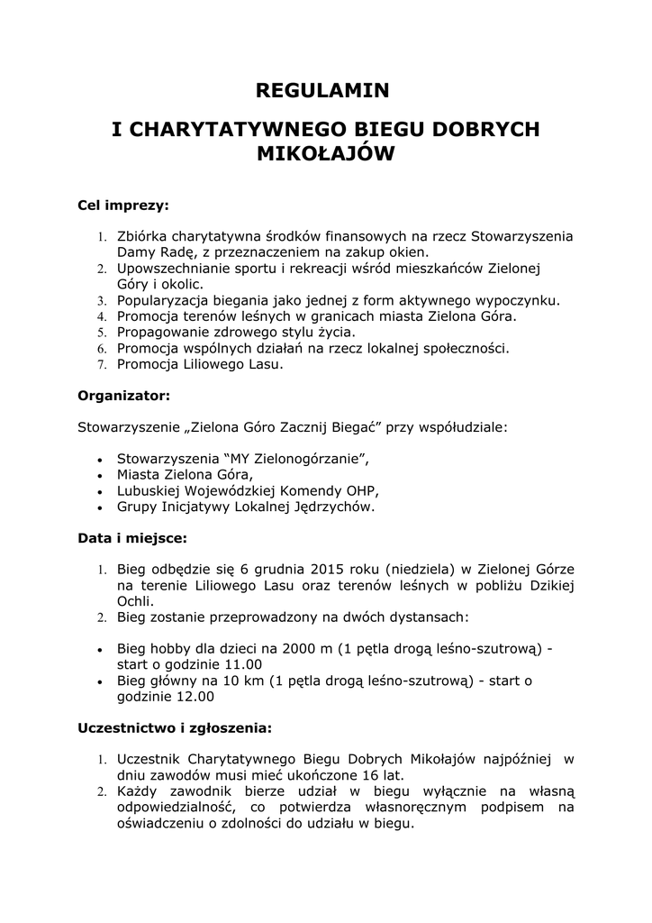 REGULAMIN I CHARYTATYWNEGO BIEGU DOBRYCH MIKOŁAJÓW Cel imprezy: 1. Zbiórka charytatywna środków finansowych na rzecz Stowarzyszenia Damy Radę, z przeznaczeniem na zakup okien. 2. Upowszechnianie sportu i rekreacji wśród mieszkańców Zielonej Góry i okolic. 3. Popularyzacja biegania jako jednej z form aktywnego wypoczynku. 4. Promocja terenów leśnych w granicach miasta Zielona Góra. 5. Propagowanie zdrowego stylu życia. 6. Promocja wspólnych działań na rzecz lokalnej społeczności. 7. Promocja Liliowego Lasu. Organizator: Stowarzyszenie „Zielona Góro Zacznij Biegać” przy współudziale: • • • • Stowarzyszenia “MY Zielonogórzanie”, Miasta Zielona Góra, Lubuskiej Wojewódzkiej Komendy OHP, Grupy Inicjatywy Lokalnej Jędrzychów. Data i miejsce: 1. Bieg odbędzie się 6 grudnia 2015 roku (niedziela) w Zielonej Górze na terenie Liliowego Lasu oraz terenów leśnych w pobliżu Dzikiej Ochli. 2. Bieg zostanie przeprowadzony na dwóch dystansach: • • Bieg hobby dla dzieci na 2000 m (1 pętla drogą leśno-szutrową) start o godzinie 11.00 Bieg główny na 10 km (1 pętla drogą leśno-szutrową) - start o godzinie 12.00 Uczestnictwo i zgłoszenia: 1. Uczestnik Charytatywnego Biegu Dobrych Mikołajów najpóźniej w dniu zawodów musi mieć ukończone 16 lat. 2. Każdy zawodnik bierze udział w biegu wyłącznie na własną odpowiedzialność, co potwierdza własnoręcznym podpisem na oświadczeniu o zdolności do udziału w biegu. 3. Zawodnicy niepełnoletni muszą posiadać zgodę opiekunów prawnych na udział w biegu – zgody do wypełnienia przed biegiem w Biurze Zawodów. 4. Zgłoszenia do biegu dziecięcego przyjmowane będą w dniu zawodów 6.12.2015 roku. Gwarantuje się przyjęcie 100 uczestników biegu dziecięcego. 5. Zgłoszenia i opłaty przyjmowane będą wyłącznie elektronicznie od dnia 12 października 2015 roku do 30 listopada 2015 roku włącznie, poprzez rejestrację na stronie internetowej www.pulsarsport.pl 6. Limit uczestników I Charytatywnego Biegu Dobrych Mikołajów to 300 osób. 7. Organizator zastrzega sobie prawo zamknięcia listy startowej w momencie przekroczenia liczby 300 Uczestników imprezy. 8. Organizator biegu pobiera opłatę startową w wysokości 30 zł za bieg główny, która w całości przekazana zostanie na rzecz Stowarzyszenia Damy Radę. 9. Numer konta do dokonania opłaty startowej: 53 1090 1535 0000 0001 3136 2101 tytułem: opłata startowa, imię i nazwisko 10. Organizator zastrzega sobie prawo zamknięcia listy startowej w momencie przekroczenia liczby 300 Uczestników imprezy 11. Organizator biegu gwarantuje pomiaru czasu. 12. Organizator zapewnia wspólną rozgrzewkę przed I Charytatywnym Biegiem Dobrych Mikołajów. 13. Pakiety startowe wydawane będą w biurze zawodów po podpisaniu przez uczestnika oświadczenia: • • w Szkole Podstawowej nr 8 przy ulicy Kąpielowej 7 w dniu 04.12.2015 od godziny 17.00 do godziny 20.00 oraz 05.12.2015 od godziny 10.00 do 12.00, w dniu biegu od godziny 9.30 - 11.15 w strefie Startu i Mety 14.Pobranie numeru startowego i podpisanie oświadczenia, jest równoznaczne z akceptacją regulaminu biegu oraz zgodą na przetwarzanie danych osobowych i wykorzystanie wizerunku uczestnika dla potrzeb organizatora. Rozstrzygnięcie biegu i nagrody: 1. Wygrywa uczestnik, który pierwszy dotrze do linii mety i przekroczy ją. 2. Nagrody przyznawane będą w dwóch kategoriach: open kobiet i open mężczyzn. 3. Nie przewidziano nagród dla poszczególnych kategorii wiekowych. 4. Dodatkowo zostaną nagrodzone miejsca 6, 12, 18, 24, 30, 36, 42, 48, 54, 60, 66, 72, 78, 84, 90, 96 102, 108, 114, 120, 126, 132, 138, 144, 150, 156, 162, 168, 174, 180, 186, 192, 198, 204, 210, 216, 222, 228, 234, 240 246, 252, 258, 264, 270, 276, 282, 288, 294. 5. Nagrodą za trzy pierwsze miejsca w kategoriach open kobiet i open mężczyzn będą pamiątkowe puchary oraz bony upominkowe. 6. Ostatni zawodnik na mecie otrzyma nagrodę specjalną 7. Najlepsza Zielonogórzanka i Zielonogórzanin otrzymają nagrody specjalne 8. Wszyscy uczestnicy obu biegów otrzymają pamiątkowe medale. 9. Uczestnicy biegu dla dzieci otrzymają na mecie słodką niespodziankę. 10. Wszyscy uczestnicy obu biegów mają zagwarantowany ciepły napój i poczęstunek po zakończeniu zawodów. Program zawodów: 9.30 – 10.40 – rejestracja uczestników biegu dziecięcego, podpisanie zgody na udział dziecka w biegu, wydawanie pakietów startowych na bieg główny 10.45 - rozgrzewka dla dzieci startujących w biegu 11.00 – start biegu dziecięcego na dystansie 2 km 11.20 -11.35 – rozdanie nagród i medali uczestnikom biegu dziecięcego 11.40 - wspólne zdjęcie wszystkich uczestników biegu z Mikołajem 11.45 - rozgrzewka dla uczestników biegu głównego 12.00 – start I Charytatywnego Biegu Dobrych Mikołajów 13.30 – dekoracja zwycięzców I Charytatywnego Biegu Dobrych Mikołajów 13.50 - rozdanie nagród w poszczególnych kategoriach 14.30 – zakończenie zawodów Finansowanie: 1. Koszty związane z przeprowadzeniem zawodów pokrywa organizator – Stowarzyszenie Zielona Góro Zacznij Biegać przy współfinansowaniu Miasta Zielona Góra oraz Nadleśnictwa Zielona Góra. 2. Zawodnicy przyjeżdżają na koszt własny. Postanowienia końcowe: 1. Trasa biegu będzie oznaczona taśmami w nieoczywistych miejscach i na skrętach. 2. Uczestnicy biegu nie są ubezpieczeni od następstw nieszczęśliwych wypadków. 3. Organizator zapewnia opiekę lekarską. 4. Uczestników biegu obowiązuje strój oraz obuwie sportowe w czasie biegu. 5. Podczas biegu Uczestnicy muszą mieć numery startowe przymocowane w widocznym miejscu. 6. Biegi odbędą się bez względu na pogodę. 7. Organizator nie odpowiada za przedmioty pozostawione bez zabezpieczenia lub skradzione w czasie imprezy. 8. W trakcie imprezy będzie prowadzona zbiórka publiczna na rzecz Stowarzyszenia Damy Radę z przeznaczeniem na zakup okien. 9. W trakcie impre