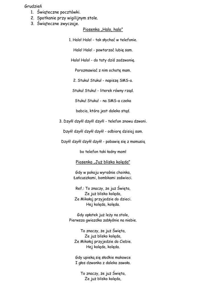 Grudzień 1. Świąteczne pocztówki. 2. Spotkanie przy wigilijnym stole. 3. Świąteczne zwyczaje. Piosenka „Halo, halo” 1. Halo! Halo! - tak słychać w telefonie. Halo! Halo! - powtarzać lubię sam. Halo! Halo! - do taty dziś zadzwonię. Porozmawiać z nim ochotę mam. 2. Stuku! Stuku! - napiszę SMS-a. Stuku! Stuku! - literek równy rząd. Stuku! Stuku! - na SMS-a czeka babcia, która jest daleko stąd. 3. Dzyń! dzyń! dzyń! dzyń! - telefon znowu dzwoni. Dzyń! dzyń! dzyń! dzyń! - odbiorę dzisiaj sam. Dzyń! dzyń! dzyń! dzyń! - pobawię się z mamusią bo telefon taki ładny mam! Piosenka „Już blisko kolęda” Gdy w pokoju wyrośnie choinka, Łańcuszkami, bombkami zaświeci. Ref.: To znaczy, że już Święta, Że już blisko kolęda, Że Mikołaj przyjedzie do dzieci. Hej kolęda, kolęda. Gdy opłatek już leży na stole, Pierwsza gwiazdka zabłyśnie na niebie. To znaczy, że już Święta, Że już blisko kolęda, Że Mikołaj przyjedzie do Ciebie. Hej kolęda, kolęda. Gdy upieką się słodkie makowce I głos dzwonka z daleka zawoła. To znaczy, że już Święta, Że już blisko kolęda, I za drzwiami już stoi Mikołaj. Hej kolęda, kolęda Wierszyk „Prezent dla Mikołaja” A ja się bardzo, bardzo postaram I zrobię prezent dla Mikołaja: Zrobię mu szalik piękny i nowy Żeby go nosił w noce zimowe I żeby nie zmarzł w szyję i w uszy Gdy z burej chmury śnieg zacznie prószyć Niech się ucieszy Mikołaj Święty Tak rzadko ktoś mu daje prezenty Wierszyk „ Kupujemy Choinkę” Pojedziemy dziś sankami na plac choinkowy, Gdzie choinki do choinek tulą swoje głowy. Gdzie choinki się trzymają za zielone ręce, I znajdziemy tę jedyną w iglastej sukience. Damy świeczki, niech je trzyma, w palcach swych zielonych, Niech ogniami złocistymi błyśnie z każdej strony. Ustrojona, rozświecona królować nam będzie, Przy opłatku, przy muzyce, przy cichej kolędzie.