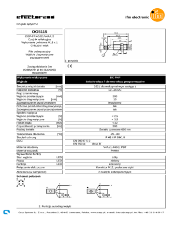 Czujniki optyczne OG5115 OGP-FPKG/B1/V4A/US Czujnik refleksyjny Wykonanie gwintowa M18 x 1 Gniazdo i wtyk Filtr polaryzacyjny Wyjście diagnostyczne pozłacane styki 1: przycisk Zasięg działania 3m (Odbłyśnik Ø 80 (E20005)) nastawialny Wykonanie elektryczne DC PNP Wyjście światło-włącz / ciemno-włącz programowalne Średnica wiązki światła [mm] Napięcie zasilania [V] Prąd znamionowy Wyjście przełączające [mA] Wyjście diagnostyczne [mA] Zabezpieczenie przed zwarciem Ochrona przed odwrotną polaryzacją Zabezpieczenie przed przeciążeniem Spadek napięcia Wyjście przełączające [V] Wyjście diagnostyczne [V] Pobór prądu [mA] Częstotliwość przełączania [Hz] Rodzaj światła Temperatura otoczenia Stopień ochrony EMC Materiał obudowy Materiał soczewki Wyświetlanie funkcji Stan wyjścia Praca Funkcja Połączenie elektryczne 262 ( dla maksymalnego zasięgu ) 10...36 DC 200 10 impulsowe tak tak < 2,5 < 3,5 < 32 500 Światło czerwone 660 nm [°C] -25...80 IP 68 / IP 69K, II EN 60947-5-2 EN 55011: klasa B V4A (1.4404); PBT PMMA LED LED LED Akcesoria (w komplecie) Schemat połączeń 2: Funkcja autodiagnostyki żółty zielony czerwony Konektor M12; pozłacane styki 2 nakrętki zabezpieczające OG5115 Wykres funkcji wzmocnienia ifm electronic gmbh • Teichstraße 4 • 45127 Essen — Rezerwujemy prawo do zmian technicznych bez wcześniejszego powiadomienia. — PL — OG5115 — 06.03.2003