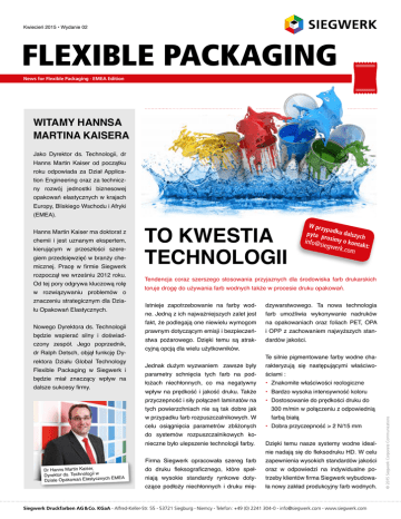 Kwiecień 2015 • Wydanie 02 FLEXIBLE PACKAGING News for Flexible Packaging ∙ EMEA Edition WITAMY HANNSA MARTINA KAISERA Jako Dyrektor ds. Technologii, dr Hanns Martin Kaiser od początku roku odpowiada za Dział Application Engineering oraz za technicz- ny rozwój jednostki biznesowej opakowań elastycznych w krajach Europy, Bliskiego Wschodu i Afryki (EMEA). chemii i jest uznanym ekspertem, kierującym w przeszłości szeregiem przedsięwzięć w branży chemicznej. Pracę w firmie Siegwerk rozpoczął we wrześniu 2012 roku. Od tej pory odgrywa kluczową rolę w rozwiązywaniu problemów o znaczeniu strategicznym dla Działu Opakowań Elastycznych. Nowego Dyrektora ds. Technologii będzie wspierać silny i doświadczony zespół. Jego poprzednik, dr Ralph Detsch, objął funkcję Dyrektora Działu Global Technology Flexible Packaging w Siegwerk i będzie miał znaczący wpływ na dalsze sukcesy firmy. TO KWESTIA TECHNOLOGII rk.com Tendencja coraz szerszego stosowania przyjaznych dla środowiska farb drukarskich toruje drogę do używania farb wodnych także w procesie druku opakowań. Istnieje zapotrzebowanie na farby wod- dzywarstwowego. Ta nowa technologia fakt, że podlegają one niewielu wymogom na opakowaniach oraz foliach PET, OPA ne. Jedną z ich najważniejszych zalet jest prawnym dotyczącym emisji i bezpieczeństwa pożarowego. Dzięki temu są atrakcyjną opcją dla wielu użytkowników. Jednak dużym wyzwaniem zawsze były parametry schnięcia tych farb na podłożach niechłonnych, co ma negatywny wpływ na prędkość i jakość druku. Także przyczepność i siły połączeń laminatów na tych powierzchniach nie są tak dobre jak w przypadku farb rozpuszczalnikowych. W farb umożliwia wykonywanie nadruków i OPP z zachowaniem najwyższych standardów jakości. Te silnie pigmentowane farby wodne charakteryzują się następującymi właściwościami : • Znakomite właściwości reologiczne • Bardzo wysoka intensywność koloru •Dostosowanie do prędkości druku do 300 m/min w połączeniu z odpowiednią farbą białą celu osiągnięcia parametrów zbliżonych • Dobra przyczepność > 2 N/15 mm nieczne było ulepszenie technologii farby. Dzięki temu nasze systemy wodne ideal- Firma Siegwerk opracowała szereg farb zapewnienia wysokich standardów jakości do systemów rozpuszczalnikowych ko- Dr Hanns Martin Kaiser, Dyrektor ds. Technologii w nych EMEA Dziale Opakowań Elastycz W przy pa pytań p dku dalszyc h ro info@s simy o konta iegwe kt: do druku fleksograficznego, które spełniają wysokie standardy rynkowe dotyczące podłoży niechłonnych i druku mię- nie nadają się do fleksodruku HD. W celu oraz w odpowiedzi na indywidualne potrzeby klientów firma Siegwerk wybudowała nowy zakład produkcyjny farb wodnych. Siegwerk Druckfarben AG & Co. KGaA ∙ Alfred-Keller-Str. 55 ∙ 53721 Siegburg ∙ Niemcy ∙ Telefon: +49 (0) 2241 304-0 ∙ [email protected] ∙ www.siegwerk.com © 2015 Siegwerk Corporate Communications Hanns Martin Kaiser ma doktorat z FLEXIBLE PACKAGING News for Flexible Packaging ∙ EMEA Edition POMOC NA ŻĄDANIE Farby drukarskie przeznaczone do produkcji opakowań elastycznych do żywności muszą spełnić bardzo rygorystyczne wymogi, aby zapewnić bezpieczeństwo produktu i zgodność z przepisami prawa. Dlatego firma Siegwerk udostępnia swoim klientom szeroką gamę internetowych narzędzi do zapewniania bezpieczeństwa produktów. Jednym z narzędzi jest baza danych do- ne czynniki migracji stosowanych mate- Narzędzie Worst-Case-Calculator© Non- macje o bezpieczeństwie produktu i jego potrafić zastosować tę wiedzę we własnej którzy używają półproduktów do miesza- zgodności z przepisami prawa oraz specyfikacje dla konsumentów. Dr Nikole Peters, riałów, np folii i farby drukarskiej, a także analizie ryzyka. Firma Siegwerk udostęp- nia Worst-Case-Calculator© (kalkulator Specjalista ds. Bezpieczeństwa Produktu, najgorszego przypadku), służący do oce- bezpieczeństwa produktu? Nie zostawia- farb drukarskich. „Umożliwia on oblicze- podkreśla: „Jakie są możliwe zagrożenia my naszych klientów samym sobie, ale zapewniamy im wsparcie wykraczające poza zwykłą dokumentację dla klientów.” Jednym z potencjalnych zagrożeń jest możliwość oceny ryzyka migracji farb dru- karskich do zapakowanej żywności. Firmy produkujące opakowania elastyczne muszą dokładnie wiedzieć, jakie są istot- ny ryzyka związanego z zastosowaniem nie maksymalnej spodziewanej migracji materiału zdolnego do migracji z farby drukarskiej do zapakowanej żywności” — wyjaśnia dr Nikole Peters. „Użytkownik może zmieniać wielkość opakowania reklamacji i problemów jakościowych. Na- sie zastosowań i analiz, którzy pomagają nam w identyfikowaniu przyczyny proble- tów Siegwerk o 13-cyfrowym numerze materiału. Zastosowanie tych narzędzi pozwala na uzyskania większości potrzebnych informacji. Zwiększa to przej- rzystość działań firmy Siegwerk oraz poprawia komunikację z klientem. W przy pa pytań p dku dalszyc h rosimy o info@s iegwe kontakt: rk.com du opakowania.” stowy serwis techniczny. Doświadczeni nujemy globalną siecią ekspertów w zakre- z przepisami BHP dla wszystkich produk- sować wartości do projektowanego ukła- mów. Tworzymy odpowiednie rozwiązania długofalowe działania korygujące. Dyspo- aktualne karty charakterystyki zgodne procent pokrycia powierzchni, aby dopa- Jeżeli pojawią się problemy podczas dru- technolodzy potrafią szybko przygotować nia farb lub lakierów. Dostępne są także jednostkowego, nakładaną ilość farb oraz PIERWSZA POMOC DLA FIRM DRUKARSKICH ku, firma Siegwerk świadczy natychmia- Finished Inks jest dostępne dla klientów, w dziedzinie farb drukarskich, aby uniknąć szym klientom zapewniamy również wsparcie we wdrażaniu nowych technologii on site. Firma Siegwerk przeprowadza szkolenia dla pracowników swoich klientów z zakresu stosowania f