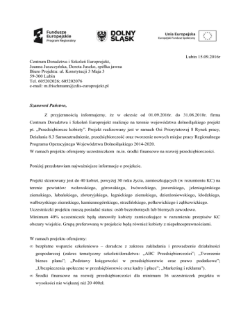 Lubin 15.09.2016r Centrum Doradztwa i Szkoleńń Europrojekt, Joanna Juszczyńska, ska, Dorota Juszko, spółka jawna Biuro Projektu: ul. Konstytucji 3 Maja 3 59-300 Lubin Tel. 605202026; 605202076 europrojekt.pl e-mail: [email protected] Szanowni Państwo, Z przyjemnościąą informujemy, żee w okresie od 01.09.2016r. do 31.08.2018r. firma Centrum Doradztwa i Szkoleńń Europrojekt realizuje na terenie województwa dolnośląskiego dolno projekt pt. „Przedsiębiorcze biorcze kobiety”. Projekt realizowany jest w ramach Osi Priorytetowej 8 Rynek pracy, Działania 8.3 Samozatrudnienie, przedsiębiorczość przedsi oraz tworzenie nowych miejsc pracy Regionalnego Programu gramu Operacyjnego Województwa Dolnośląskiego Dolno 2014-2020. W ramach projektu oferujemy uczestniczkom m.in. środki rodki finansowe na rozwój przedsiębiorczości. przedsi Poniżej przedstawiam najważniejsze żniejsze informacje o projekcie. Projekt skierowany jest do 40 kobiet, powyżej powy 30 roku życia, zamieszkujących ących (w rozumieniu KC) na terenie powiatów: wołowskiego, górowskiego, lwóweckiego, jaworskiego, jeleniogórskiego ziemskiego, lubańskiego, skiego, złotoryjskiego, legnickiego ziemskiego, dzier dzierżoniowskiego, żoniowskiego, kłodzkiego, wałbrzyskiego ziemskiego, kamiennogórskiego, strzelińskiego, s skiego, polkowickiego i zą ząbkowickiego. Uczestniczki projektu musząą posiada posiadać status: osób bezrobotnych lub biernych zawodowo. Minimum 40% uczestniczek będą bę ą stanowiły kobiety zamieszkujące ce w rozumieniu przepisów KC obszary wiejskie. Grupąą preferowaną preferowan w projekcie będą również kobiety z niepełnosprawnościami. niepełnosprawno W ramach projektu oferujemy: • bezpłatne wsparcie szkoleniowo – doradcze z zakresu zakładania i prowadzenie działalności działalno gospodarczej (zakres tematyczny szkoleń/doradztwa: szkole „ABC Przedsiębiorczo ębiorczości”; „Tworzenie biznes planu”; „Podstawy ksi księgowości w przedsiębiorstwie biorstwie oraz prawo podatkowe”; „Ubezpieczenia społeczne w przedsiębiorstwie przedsi biorstwie oraz kadry i płace”; „Marketing i reklama”). • Środki finansowe na rozwój przedsiębiorczości przedsi dla minimum 36 uczestniczek projektu p w wysokości nie większej niżż 20 400zł. • Wsparcie pomostowe przez 12 pierwszych miesięcy prowadzenia działalności (w postaci finansowej i doradczej). Rekrutacja do projektu jest prowadzona w okresie od września 2016r. do listopada 2016r. Więcej informacji znajdziecie Państwo na naszej stronie www.przedsiebiorczekobiety.eu Zapraszamy również do kontaktu z Biurem Projektu, odpowiemy na wszystkie pytania. Z poważaniem, Kierownik projektu Magdalena Frischmann internetowej: