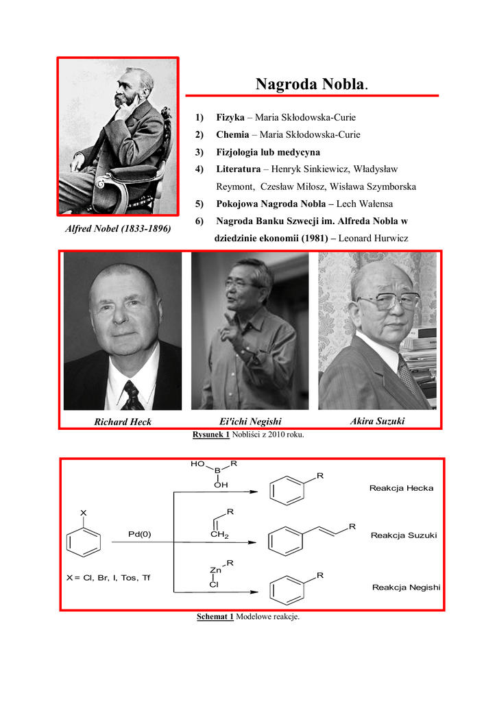 Nagroda Nobla. 1) Fizyka – Maria Skłodowska-Curie 2) Chemia – Maria Skłodowska-Curie 3) Fizjologia lub medycyna 4) Literatura – Henryk Sinkiewicz, Władysław Reymont, Czesław Miłosz, Wisława Szymborska Alfred Nobel (1833-1896) 5) Pokojowa Nagroda Nobla – Lech Wałensa 6) Nagroda Banku Szwecji im. Alfreda Nobla w dziedzinie ekonomii (1981) – Leonard Hurwicz Akira Suzuki Ei'ichi Negishi Richard Heck Rysunek 1 Nobliści z 2010 roku. R HO B R OH Reakcja Hecka R X R Pd(0) CH2 Reakcja Suzuki R Zn X = Cl, Br, I, Tos, Tf Cl Schemat 1 Modelowe reakcje. R Reakcja Negishi Reakcja sprzęgania krzyżowego – reakcja Hecka Rysunek 2 Katalizator reakcji Hecka. 1) Synteza Naproxenu ((Aleve®, Anaprox®, Naprelan®, Napron X®, Naprosyn®) - 100 t/rok Br H3C + H2C CH2 O CH2 H3C O 2) Synteza kremów przeciwslonecznych (filtr UVB) O O H3C O CH3 CH3 Schemat 2 Przemysłowe zastosowanie reakcji Hecka. Schemat 3 Mechanizm reakcji Hecka. Naproxen Reakcja sprzęgania krzyżowego – reakcja Suzuki Schemat 4 Mechanizm reakcji Suzuki. 1) Stereoselektywna reakcja Suzuki jest stosowana do syntezy produktów naturalnych zawierających układ sprzężonego polienu, takich jak feromony, czy retinoidy: Schemat 5 Zastosowanie reakcji Suzuki w syntezie witaminy A. 2) Reakcja Suzuki nadaje się szczególnie dobrze do syntezy zatłoczonych przestrzennie układów biarylowych zarówno karbo- jak i heterocyklicznych. Schemat 6 Zastosowanie reakcji Suzuki w syntezie układów biarylowych. 3) W roku 2000 pojawiło się pierwsze doniesienie o asymetrycznej reakcji Suzuki prowadzącej do chiralnych układów biarylowych używanych np. w katalizatorach stereoselektywnej reakcji aldolowej. 4) Wewnątrzcząsteczkowa reakcja Suzuki pozwala z dobrymi wydajnościami otrzymywać związki makrocykliczne, w tym antybiotyki: Schemat 7 Zastosowanie reakcji Suzuki w syntezie antybiotyków. Schemat 8 Palytoxin – naturalnie występująca toksyna, izolowana z korali, synteza – 1994 r. zawiera: 129 C, 223 H, 3 N, 54 O. Reakcja sprzęgania krzyżowego – reakcja Negishi 1) Produkcja PDE472 (inhibitorem fosfodiesterazy typu 4D) – alternatywna metoda do reakcji Suzuki. Schemat 9 Zastosowanie reakcji Negishi w syntezie infibitoru fosfodiesterazy typu 4D. 2) Synteza związków występujących naturalnie w przyrodzie: Schemat 10 Zastosowanie reakcji Negishi w syntezie Stemoamide. Stemoamide – do leczenia zaburzeń układu oddechowego. Schemat 11 Zastosowanie reakcji Negishi w syntezie Pumiliotoxin B Pumiliotoxin B – Silna toksyna produkowana naturalnie przez żaby. Schemat 12 Zastosowanie reakcji Negishi w syntezie Gamma-trans-tocotrienoloic acid Gamma-trans-tocotrienoloic acid – hamuje β-polimerazę DNA – zwiększa cytotoksyczność leków chemioterapeutycznych dzięki czemu można stosować mniejsze dawki. Literatura 1) Manley, P. W.; Acemoglu, M.; Marterer, W.; Pachinger, W. (2003). "Large-Scale Negishi Coupling as Applied to the Synthesis of PDE472, an Inhibitor of Phosphodiesterase Type 4D". Organic Process Research & Development 7 (3): 436– 445. 2) Lessene, G. (2004). "Advances in the Negishi coupling". Aust. J. Chem. 57 (1): 107. 3) Maloney, D. J.; Hecht, S. M. (2005). "A Stereocontrolled Synthesis of δ-transTocotrienoloic Acid". Organic Letters 7 (19): 4297–4300 4) Joanne E. Harvey, B. Halto; Chemistry in New Zealand 2011 5) http://pl.wikipedia.org/wiki/Laureaci_Nagrody_Nobla_w_dziedzinie_chemii