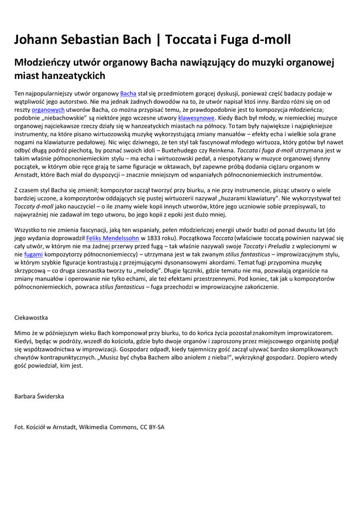 Johann Sebastian Bach | Toccata i Fuga d-moll Młodzieńczy utwór organowy Bacha nawiązujący do muzyki organowej miast hanzeatyckich Ten najpopularniejszy utwór organowy Bacha stał się przedmiotem gorącej dyskusji, ponieważ część badaczy podaje w wątpliwość jego autorstwo. Nie ma jednak żadnych dowodów na to, że utwór napisał ktoś inny. Bardzo różni się on od reszty organowych utworów Bacha, co można przypisać temu, że prawdopodobnie jest to kompozycja młodzieńcza; podobnie „niebachowskie” są niektóre jego wczesne utwory klawesynowe. Kiedy Bach był młody, w niemieckiej muzyce organowej najciekawsze rzeczy działy się w hanzeatyckich miastach na północy. To tam były największe i najpiękniejsze instrumenty, na które pisano wirtuozowską muzykę wykorzystującą zmiany manuałów – efekty echa i wielkie sola grane nogami na klawiaturze pedałowej. Nic więc dziwnego, że ten styl tak fascynował młodego wirtuoza, który gotów był nawet odbyć długą podróż piechotą, by poznać swoich idoli – Buxtehudego czy Reinkena. Toccata i fuga d-moll utrzymana jest w takim właśnie północnoniemieckim stylu – ma echa i wirtuozowski pedał, a niespotykany w muzyce organowej słynny początek, w którym obie ręce grają te same figuracje w oktawach, był zapewne próbą dodania ciężaru organom w Arnstadt, które Bach miał do dyspozycji – znacznie mniejszym od wspaniałych północnoniemieckich instrumentów. Z czasem styl Bacha się zmienił; kompozytor zaczął tworzyć przy biurku, a nie przy instrumencie, pisząc utwory o wiele bardziej uczone, a kompozytorów oddających się pustej wirtuozerii nazywał „huzarami klawiatury”. Nie wykorzystywał też Toccaty d-moll jako nauczyciel – o ile znamy wiele kopii innych utworów, które jego uczniowie sobie przepisywali, to najwyraźniej nie zadawał im tego utworu, bo jego kopii z epoki jest dużo mniej. Wszystko to nie zmienia fascynacji, jaką ten wspaniały, pełen młodzieńczej energii utwór budzi od ponad dwustu lat (do jego wydania doprowadził Feliks Mendelssohn w 1833 roku). Początkowa Toccata (właściwie toccatą powinien nazywać się cały utwór, w którym nie ma żadnej przerwy przed fugą – tak właśnie nazywali swoje Toccaty i Preludia z wplecionymi w nie fugami kompozytorzy północnoniemieccy) – utrzymana jest w tak zwanym stilus fantasticus – improwizacyjnym stylu, w którym szybkie figuracje kontrastują z przejmującymi dysonansowymi akordami. Temat fugi przypomina muzykę skrzypcową – co druga szesnastka tworzy tu „melodię”. Długie łączniki, gdzie tematu nie ma, pozwalają organiście na zmiany manuałów i operowanie nie tylko echami, ale też efektami przestrzennymi. Pod koniec, tak jak u kompozytorów północnoniemieckich, powraca stilus fantasticus – fuga przechodzi w improwizacyjne zakończenie. Ciekawostka Mimo że w późniejszym wieku Bach komponował przy biurku, to do końca życia pozostał znakomitym improwizatorem. Kiedyś, będąc w podróży, wszedł do kościoła, gdzie było dwoje organów i zaproszony przez miejscowego organistę podjął się współzawodnictwa w improwizacji. Gospodarz odpadł, kiedy tajemniczy gość zaczął używać bardzo skomplikowanych chwytów kontrapunktycznych. „Musisz być chyba Bachem albo aniołem z nieba!”, wykrzyknął gospodarz. Dopiero wtedy gość powiedział, kim jest. Barbara Świderska Fot. Kościół w Arnstadt, Wikimedia Commons, CC BY-SA