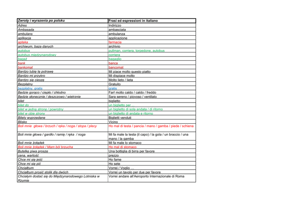 Zwroty i wyrazenia po polsku Adres Ambasada ambulans aplikacja apteka archiwum, baza danych autobus autobus międzynarodowy bagaż bank bankomat Bardzo lubię tę potrawę Bardzo mi przykro Bardzo się cieszę Bezpłatny bezpłatny, gratis Będzie gorąco / ciepło / chłodno Będzie słonecznie / deszczowo / wietrznie bilet bilet do … bilet w jedną stronę / powrotny bilet w obie strony Bilety wyprzedane Blisko Boli mnie głowa / brzuch / ręka / noga / stopa / plecy Frasi ed espressioni in italiano Indirizzo ambasciata ambulanza applicazione farmacia archivio pullman, corriera, torpedone, autobus corriera bagaglio banca bancomat Mi piace molto questo piatto Mi dispiace molto Molto lieto / lieta Gratuito gratis Farŕ molto caldo / caldo / freddo Sara sereno / piovoso / ventilato biglietto un biglietto per ... un biglietto di sola andata / di ritorno un biglietto di andata e ritorno Biglietti venduti Vicino Ho mal di testa / pancia / mano / gamba / piede / schiena Boli mnie głowa / gardło / ramię / ręka / noga Mi fa male la testa (il capo) / la gola / un braccio / una mano / la gamba Mi fa male lo stomaco Ho mal di stomaco Una bottiglia di birra per favore prezzo Ho fame Ho sete Vorrei / Voglio … Vorrei un tavolo per due per favore Vorrei andare all'Aeroporto Internazionale di Roma Boli mnie żołądek Boli mnie żołądek / Mam ból brzucha Butelkę piwa proszę cena, wartość Chce mi się jeść Chce mi się pić Chciałbym Chciałbym prosić stolik dla dwóch Chciałym dostać się do Międzynarodowego Lotniska w Rzymie chciałym zwiedzić Chleb chory Ciągnąć Cieszę się, że cię widzę Cieszę się, że tu jestem Cisza Co mam robić? Co pan / pani poleca? Co robisz, czym się zajmujesz? / What do you do for a living? Co słychać? Co teraz robisz? Co to jest? Co to za stacja? Co to znaczy ...? Co to znaczy? / Co masz na myśli? Co tu jest napisane? Co znaczy to słowo? cukier Czego pan sobie życzy? Czego się pan / pani napije? czekolada Cześć Cześć (nieformalne przywitanie / pożegnanie) cześć (powitanie) cześć (pożegnanie) Czuję się źle Czy chce pan/i pójść ze mną na przyjęcie / do kina/ do teatru / na spacer? Czy jest ktoś, kto mówi po angielsku? Czy jest tu blisko jakiś kościół? Czy jest tu lekarz? Czy jest wolny stolik? Czy jest zniżka dla studentów / osób starszych Czy jesteś pewien? Czy ktoś z was rozumie po polsku? Czy ma pan / pani ochotę coś zjeść? Czy ma pan gorączkę? voglio visitare Pane malato Tirare E'un piacere incontrarLa Sono contento/a d'esserci Silenzio Che cosa devo fare? Cosa consiglia? Che lavoro fai? Come va? Che cosa stai facendo adesso? Che cos'e / Che cos'e questo? Che stazione č questa? Cosa vuol dire...? Cosa significa? / Che vuoi dire? Che cosa c'č scritto? Che significa questa parola? zucchero Che cosa desidera? Che cosa desidera da bere? Cioccolata Salve! Ciao ciao (all'arrivo) ciao (alla partenza) Mi sento male Le piacerebbe andare con me al ricevimento / al cinema / al teatro / a fare una passeggiata? C'č qualcuno che parla inglese? C'č una chiesa qua vicino? C'č un medico qui? C'č un tavolo libero? C'e lo sconto per studenti / anziani Sei securo? Qualcuno di voi capisce il polacco? Vuole mangiare qualcosa? Ha la febbre? Czy moge postawic panu / pani drinka? Czy mogę pana / panią prosić do tańca? Czy mogę panią odprowadzić? Czy mogę podłączyć moją komórkę do ładowanie? Czy mogę prosić menu? Czy mogę prosić o szklankę wody? Czy mogę prosić rachunek? Czy mogę skorzystać z twojego telefonu? Czy mogę zadzwonić? Czy mogę zapalić? Czy mogę zapłacić kartą kredytowa / zbliżeniowo? Czy mogę zapłacić kartą kredytową? Czy mogę zapytać o nazwisko? Czy może mi pan pokazać na mapie? Czy może mi pan polecić dobrą restaurację Czy możesz mi pomóc, proszę? Czy możesz mi pomóc? Czy mógłby mi pan / mogłaby pani powiedzieć jak dojść do …? Czy mógłby pan / mogłaby pani zamknąć okno / drzwi? Czy mógłby pan / mogłaby przeliterowac swoje nazwisko? Posso offrirLe un drimk? Posso invitarLa per un ballo? Posso accomagnarLa a casa? Posso caricare qui il mio cellulare? Posso avere il menu? Posso chiedere un bicchiere d'acqua? Posso avere il conto per favore? Posso usare il tuo telefono? Posso telefonare? Posso fumare? Posso pagare con la carta di credito? Posso pagare con la carta di credito? Posso chiedere il Suo cognome Me lo puň indicare sulla mappa? Mi puň consigliare un buon ristorante? Puň aiutarmi per favore? Mi puoi aiutare? Potrebbe dirmi come andare a …. Czy mógłbym porozmawiać z panem / panią? Czy mówi pan po angielsku? Czy mówi pan/pani po włosku? Czy mówi pan/pani po francusku / niemiecku? Czy mówi pan/pani po polsku / angielsku? Czy pan mnie rozumie? Czy płaci się z góry? Czy to daleko / blisko? Czy zje pan/i ze mną śniadanie / lunch / obiad / kolację? Posso parlare con lei un momento? Parli inglese? Parla l'italiano? Parla francese / tedesco? Parla inglese / polacco? Lei mi capisce? Il pagamento č anticipato? E' lontano / vicino? Vorrebbe mangiare con me la colazione / il lunch / il pranzo / la cena? Quale mezzo devo prendere per andare a ... Lontano Data di nascita Prenditi cura di te Signori / Signore Perche? / Perche no? da mangiare Czym dojadę do… Daleko Data urodzenia Dbaj o siebie Dla panów / pan Dlaczego? / Dlaczego nie? do jedzenia Potrebbe chiudare la finestra / la porta? Potrebbe ripetere lettere dopo lettera il Suo cognome? Do której godziny będzie otwarte? do picia Do widzenia Do widzenia Do widzenia panu /pani Do wynajęcia Do zobaczenia Dobranoc Dobry wieczór Dobry, dobra Dobrze (jak) Dobrze / zgoda Dokąd idziesz? dom towarowy Doskonale! dreszcze droga droga jednokierunkowa Droga prywatna dworzec / przystanek autobusowy Dziekuję, dobrze. A ty? Dziekuję, wzajemnie Dziekuję, z przyjemnością Dzień dobry Dzień dobry (po południu) Dzień doby, panie..., pani ..., panno... Dzięki za zaproszenie Dzię