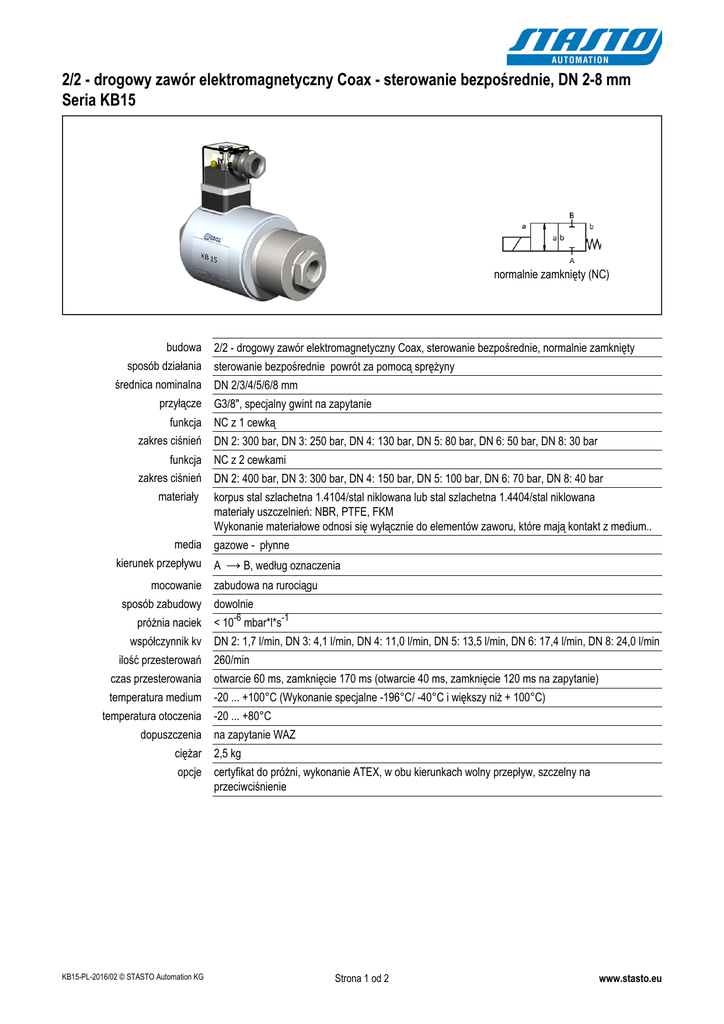 2/2 - drogowy zawór elektromagnetyczny Coax - sterowanie bezpośrednie, DN 2-8 mm Seria KB15 normalnie zamknięty (NC) budowa sposób działania średnica nominalna przyłącze funkcja zakres ciśnień funkcja zakres ciśnień materiały media kierunek przepływu mocowanie sposób zabudowy próżnia naciek współczynnik kv ilość przesterowań 2/2 - drogowy zawór elektromagnetyczny Coax, sterowanie bezpośrednie, normalnie zamknięty sterowanie bezpośrednie powrót za pomocą sprężyny DN 2/3/4/5/6/8 mm G3/8", specjalny gwint na zapytanie NC z 1 cewką DN 2: 300 bar, DN 3: 250 bar, DN 4: 130 bar, DN 5: 80 bar, DN 6: 50 bar, DN 8: 30 bar NC z 2 cewkami DN 2: 400 bar, DN 3: 300 bar, DN 4: 150 bar, DN 5: 100 bar, DN 6: 70 bar, DN 8: 40 bar korpus stal szlachetna 1.4104/stal niklowana lub stal szlachetna 1.4404/stal niklowana materiały uszczelnień: NBR, PTFE, FKM Wykonanie materiałowe odnosi się wyłącznie do elementów zaworu, które mają kontakt z medium.. gazowe - płynne A → B, według oznaczenia zabudowa na rurociągu dowolnie < 10-6 mbar*l*s-1 DN 2: 1,7 l/min, DN 3: 4,1 l/min, DN 4: 11,0 l/min, DN 5: 13,5 l/min, DN 6: 17,4 l/min, DN 8: 24,0 l/min 260/min czas przesterowania otwarcie 60 ms, zamknięcie 170 ms (otwarcie 40 ms, zamknięcie 120 ms na zapytanie) temperatura medium -20 ... +100°C (Wykonanie specjalne -196°C/ -40°C i większy niż + 100°C) temperatura otoczenia dopuszczenia -20 ... +80°C na zapytanie WAZ ciężar 2,5 kg opcje certyfikat do próżni, wykonanie ATEX, w obu kierunkach wolny przepływ, szczelny na przeciwciśnienie KB15-PL-2016/02 © STASTO Automation KG Strona 1 od 2 www.stasto.eu rodzaj zasilania napięcie zmienne i stałe napięcie standardowe 230V/40-60Hz, 24VDC, dop. wahania napięcia ± 10% napięcia niestandardowe na zapytanie cewka elektromagnetyczna DC cewka na prąd stały, AC magnes prądu stałego ze zintegrowanym prostownikiem (powyżej 100°C z oddzielnym prostownikiem) klasa materiału izolacyjnego H 180°C pobór prądu z 1 cewką 24VDC 1,6 A, 230VAC 0,15 A z 2 cewkami prąd przyciągania 24VDC 5,9 A, 230VAC 0,76 A, prąd podtrzymywania 24VDC 1,58 A, 230VAC 0,16 A czas pracy 100% (tryb pracy ciągły) rodzaj zabezpieczenia IP65 zgodnie z EN 60529 przy poprawnie zamontowanym gnieździe (ochrona przed pyłem i strumieniem wody) zakres dostawy wraz z wtyczką zgodną z EN175301-803-Form A (wcześniej DIN43650)-wejście kabla M16x1,5 opcjonalnie wtyczka zgodna z DESINA, wtyczka zgodna z VDMA, skrzynka przyłączeniowa M16x1,5 na zapytanie wyposażenie dodatkowe wtyczka z LED i bezpiecznikiem dane do zamówienia średnica nominalna, przyłącze, funkcja NC/NO, ciśnienie pracy, przepływ, medium, temperatura medium, temperatura otoczenia, napięcie nominalne zasady doboru Dobór wykonania materiałowego, materiału uszczelnień oraz innych parametrów zaworu odbywa się na podstawie rodzaju medium i warunków pracy. Istnieje możliwość odstępstw od parametrów ogólnych zawartych w dokumentacji technicznej.. W przypadku podania niedokładnych lub niepełnych danych do zamówienia, bądź parametrów aplikacji, istnieje niebezpieczeństwo niewłaściwego doboru wykonania materiałowego zaworu. W konsekwencji właściwości fizykochemiczne użytych materiałów lub uszczelnień mogą być niewystarczające dla założonej aplikacji. wymiary KB15 funkcja NC przyłącza elektryczne M12x1 DESINA / VDMA skrzynka przyłączeniowa wtyczka forma A DIN EN 175301-803 rysunki poglądowe Zmiany w konstrukcji, wymiarach i wykonaniu materiałowym zastrzeżone KB15-PL-2016/02 © STASTO Automation KG Strona 2 od 2 www.stasto.eu