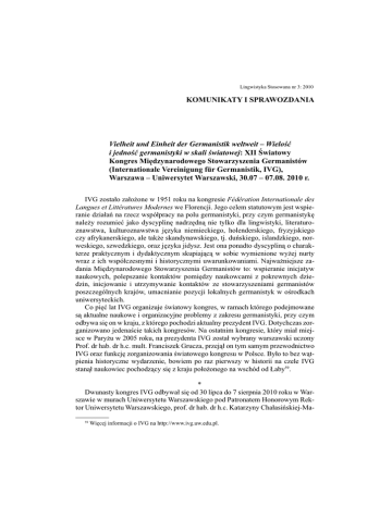 339 Lingwistyka Stosowana nr 3: 2010 KOMUNIKATY I SPRAWOZDANIA Vielheit und Einheit der Germanistik weltweit – Wielość i jedność germanistyki w skali światowej: XII Światowy Kongres Międzynarodowego Stowarzyszenia Germanistów (Internationale Vereinigung für Germanistik, IVG), Warszawa – Uniwersytet Warszawski, 30.07 – 07.08. 2010 r. IVG zostało założone w 1951 roku na kongresie Fédération Internationale des Langues et Littératures Modernes we Florencji. Jego celem statutowym jest wspieranie działań na rzecz współpracy na polu germanistyki, przy czym germanistykę należy rozumieć jako dyscyplinę nadrzędną nie tylko dla lingwistyki, literaturoznawstwa, kulturoznawstwa języka niemieckiego, holenderskiego, fryzyjskiego czy afrykanerskiego, ale także skandynawskiego, tj. duńskiego, islandzkiego, norweskiego, szwedzkiego, oraz języka jidysz. Jest ona ponadto dyscypliną o charakterze praktycznym i dydaktycznym skupiającą w sobie wymienione wyżej nurty wraz z ich współczesnymi i historycznymi uwarunkowaniami. Najważniejsze zadania Międzynarodowego Stowarzyszenia Germanistów to: wspieranie inicjatyw naukowych, polepszanie kontaktów pomiędzy naukowcami z pokrewnych dziedzin, inicjowanie i utrzymywanie kontaktów ze stowarzyszeniami germanistów poszczególnych krajów, umacnianie pozycji lokalnych germanistyk w ośrodkach uniwersyteckich. Co pięć lat IVG organizuje światowy kongres, w ramach którego podejmowane są aktualne naukowe i organizacyjne problemy z zakresu germanistyki, przy czym odbywa się on w kraju, z którego pochodzi aktualny prezydent IVG. Dotychczas zorganizowano jedenaście takich kongresów. Na ostatnim kongresie, który miał miejsce w Paryżu w 2005 roku, na prezydenta IVG został wybrany warszawski uczony Prof. dr hab. dr h.c. mult. Franciszek Grucza, przejął on tym samym przewodnictwo IVG oraz funkcję zorganizowania światowego kongresu w Polsce. Było to bez wątpienia historyczne wydarzenie, bowiem po raz pierwszy w historii na czele IVG stanął naukowiec pochodzący się z kraju położonego na wschód od Łaby59. * Dwunasty kongres IVG odbywał się od 30 lipca do 7 sierpnia 2010 roku w Warszawie w murach Uniwersytetu Warszawskiego pod Patronatem Honorowym Rektor Uniwersytetu Warszawskiego, prof. dr hab. dr h.c. Katarzyny Chałasińskiej-Ma59 Więcej informacji o IVG na http://www.ivg.uw.edu.pl. 340 KOMUNIKATY I SPRAWOZDANIA cukow60, oraz Patronatem Regionalnym Marszałka Województwa Mazowieckiego, pana Adama Struzika. Kongres uhonorowali swoją obecnością także: dr Rüdiger Freiherr von Fritsch, Ambasador Republiki Federalnej Niemiec w Warszawie, dr Herbert Krauss, Ambasador Republiki Austrii w Warszawie, Olaf Kjelsen, Minister Ambasady i Zastępca Ambasadora Szwajcarii w Warszawie, prof. Dr.-Ing. Dr. Sabine Kunst, Prezydent Niemieckiej Centrali Wymiany Akademickiej (DAAD), dr Christian Bode, Sekretarz Generalny Niemieckiej Centrali Wymiany Akademickiej (DAAD), dr Gisela Janetzke, Zastępca Sekretarza Generalnego Fundacji im. Aleksandra von Humboldta, dr Hans-Rudi Spiegel, Sekretarz Generalny Fundacji na Rzecz Niemieckiej Nauki (Stifterverband für die Deutsche Wissenschaft). List ze słowem powitalnym do uczestników przesłał także Donald Tusk, Premier Rzeczpospolitej Polskiej. Miejscem obrad był teren historycznego kampusu Uniwersytetu Warszawskiego przy Krakowskim Przedmieściu. Współorganizatorem Kongresu był Wydział Lingwistyki Stosowanej Uniwersytetu Warszawskiego61. Temat przewodni obrad XII Kongresu IVG brzmiał: „Vielheit und Einheit der Germanistik weltweit” (Wielość i jedność germanistyki w skali światowej). Decyzja o wyborze słowa wielość nie była podyktowana wyłącznie faktem, iż w Międzynarodowym Stowarzyszeniu Germanistów poza germanistyką w sensie ścisłym skupione są także różne nurty germanistyki w sensie szerszym, ale miała ona na celu przede wszystkim promowanie obszarów poszczególnych dyscyplin naukowych w ramach germanistyki, ukazanie ich kompleksowości oraz potencjału. Decyzja o wyborze słowa jedność natomiast zapadła przede wszystkim z myślą o tym, aby każdy naukowiec, niezależnie od tego, jaką reprezentuje dyscyplinę czy kierunek badań, miał szansę jako jednostka (*jedność) zaprezentować swój dorobek naukowy specjalistom z różnych kontynentów. * Część naukową Kongresu otworzyły trzy referaty plenarne pt: Germanistik in der Wissenschaftsgesellschaft Petera Strohschneidera (Monachium/Niemcy), Zur Rekonstruktion der weiblichen Genealogie im ästhethischen Diskurs deutscher Autorinnen seit dem 17. Jahrhundert Mirosławy Czarneckiej (Wrocław/Polska) oraz Deutsch(-lernen und -lehren) in einer mehrsprachigen Welt – Risiken und Chancen Hansa-Jürgena Krumma (Wiedeń/Austria). Każdemu naukowemu dniu towarzyszył także panel dyskusyjny. W sumie odbyło się 8 paneli: Panel A: Führt die deutschsprachige Literatur „Selbstgespräche”? Zur internationalen Wahrnehmung zeitgenössischer deutschsprachiger Literatur [prowadzenie: Hartmut Eggert (Berlin/Niemcy); uczestnicy: Deniz Göktürk 60 Na kolejnych stronach zamieszczamy tekst przemówienia, jakie wygłosiła Rektor Uniwersytetu Warszawskiego. 61 www.wls.uw.edu.pl. KOMUNIKATY I SPRAWOZDANIA 341 (Berkeley/USA), Joanna Jabłkowska (Łódź/Polska), Hubert Lengauer (Klagenfurt/ Austria), Rekha Kamath-Rajan (Neu Delhi/Indie)]. Panel B: Transkulturalität und Intermedialität in der Germanistik des globalen Zeitalters [prowadzenie: Ortrud Gutjahr (Hamburg/Niemcy); uczestnicy: Anton Kaes (Berkeley/USA), Tim Mehigan (Dunedin/Nowa Zelandia), Aoussine Seddiki (Oran/Algieria), Vibha Surana (Mumbai/Indie), Wilhelm Voßkamp (Köln/Niemcy)]. Panel C: Warum Literatur der Vormoderne? [prowadzenie: Jan-Dirk Müller (München/Niemcy); uczestnicy: Frank Baron (Lawrence, KS/USA), Beate Kellner (Zurych/Szwajcariaz), Elaine Tennant (Berkeley/ USA)]. Panel D: Zukunftsmodelle der Germanistik [prowadzenie