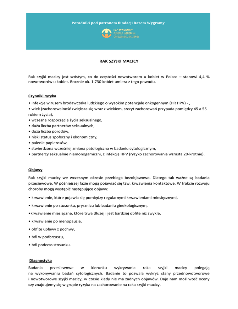 Poradniki pod patronem fundacji Razem Wygramy RAK SZYJKI MACICY Rak szyjki macicy jest szóstym, co do częstości nowotworem u kobiet w Polsce – stanowi 4,4 % nowotworów u kobiet. Rocznie ok. 1.730 kobiet umiera z tego powodu. Czynniki ryzyka • infekcje wirusem brodawczaka ludzkiego o wysokim potencjale onkogennym (HR HPV) - , • wiek (zachorowalność zwiększa się wraz z wiekiem, szczyt zachorowań przypada pomiędzy 45 a 55 rokiem życia), • wczesne rozpoczęcie życia seksualnego, • duża liczba partnerów seksualnych, • duża liczba porodów, • niski status społeczny i ekonomiczny, • palenie papierosów, • stwierdzona wcześniej zmiana patologiczna w badaniu cytologicznym, • partnerzy seksualnie niemonogamiczni, z infekcją HPV (ryzyko zachorowania wzrasta 20-krotnie). Objawy Rak szyjki macicy we wczesnym okresie przebiega bezobjawowo. Dlatego tak ważne są badania przesiewowe. W późniejszej fazie mogą pojawiać się tzw. krwawienia kontaktowe. W trakcie rozwoju choroby mogą wystąpić następujące objawy: • krwawienie, które pojawia się pomiędzy regularnymi krwawieniami miesięcznymi, • krwawienie po stosunku, prysznicu lub badaniu ginekologicznym, •krwawienie miesięczne, które trwa dłużej i jest bardziej obfite niż zwykle, • krwawienie po menopauzie, • obfite upławy z pochwy, • ból w podbrzuszu, • ból podczas stosunku. Diagnostyka Badania przesiewowe w kierunku wykrywania raka szyjki macicy polegają na wykonywaniu badań cytologicznych. Badanie to pozwala wykryć stany przednowotworowe i nowotworowe szyjki macicy, w czasie kiedy nie ma żadnych objawów. Daje nam możliwość oceny czy znajdujemy się w grupie ryzyka na zachorowanie na raka szyjki macicy. W przypadku stwierdzenia zmian o charakterze dysplastycznym należy w celu weryfikacji wstępnego rozpoznania wykonać badanie kolposkopowe z celowanym pobraniem wycinków do badania histopatologicznego. Profilaktyka Skutecznym sposobem profilaktyki raka szyjki macicy jest regularne wykonywanie badań cytologicznych, które przysługują kobietom w wieku od 25 do 59 lat co trzy lata.