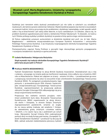 Wywiad z prof. Martą Bogdanowicz, inicjatorką i propagatorką Europejskiego Tygodnia Świadomości Dysleksji w Polsce Dysleksja jest tematem wielu dyskusji prowadzonych już nie tylko w szkołach czy ośrodkach naukowych, ale także w prasie codziennej i telewizji. Wątek dysleksji pojawia się również w wywiadach ze znanymi ludźmi, którzy przyznają się do problemów z dysleksją i opowiadają, w jaki sposób radzili sobie z nią w dzieciństwie i jak radzą sobie obecnie, w życiu zawodowym. Co ciekawe, zdarza się, że problem dysleksji sygnalizowany jest także u bohaterów filmów fabularnych. To dowodzi, że twórcy tych filmów próbują wydobyć problem dysleksji na powierzchnię społecznego zainteresowania. W Polsce najbardziej uznanym autorytetem w dziedzinie dysleksji jest prof. zw. dr hab. Marta Bogdanowicz – wieloletnia wiceprzewodnicząca European Dyslexia Assosiation i założycielka Polskiego Towarzystwa Dysleksji. Z jej inicjatywy rozpropagowano obchody Europejskiego Tygodnia Świadomości Dysleksji w Polsce. Postanowiłyśmy zapytać Panią Profesor o początki tego niezwykłego pomysłu propagowania i rozwijania świadomości dysleksji w społeczeństwie. Izabela Mańkowska i Małgorzata Rożyńska: Skąd wywodzi się tradycja obchodów Europejskiego Tygodnia Świadomości Dysleksji? Jakie były jej początki w Polsce? Profesor MARTA BOGDANOWICZ: Tydzień Świadomości Dysleksji to akcja British Dyslexia Association. Dowiedziałam się o niej z plakatu, wiszącego na ścianie podczas konferencji naukowej, która odbyła się w kwietniu 2001 roku w Manchesterze. Plakat ten zdjęłam ze ściany – wisiało ich kilka – i przedstawiłam go wraz z propozycją rozszerzenia tej akcji na wszystkie kraje członkowskie Europejskiego Towarzystwa Dysleksji (EDA). Po wstępnym przedyskutowaniu tego pomysłu z przewodniczącym EDA Alanem Sayles’em, jako wiceprzewodnicząca Europejskiego Towarzystwa Dysleksji, zaprezentowałam tę propozycję podczas zebrania Zarządu Głównego EDA odbywającego się przy okazji wspomnianej konferencji. Propozycja bez wahania została przyjęta, natomiast problemem była data. Brytyjskie Towarzystwo Dyslektyczne (BDA) organizowało tę akcję dorocznie około 1 listopada, w okresie Święta Zmarłych. Zaproponowałam październik, właśnie ze względu na naszą polską tradycję, jak wiadomo 1 listopada odwiedzamy groby zmarłych: członków rodziny i bliskich, a to często łączy się z podróżami po całym kraju. Wprawdzie Zarząd Główny EDA zaakceptował pomysł akcji na skalę Europy pod nazwą „Europejski Tydzień Świadomości Dysleksji” i przekazał tę decyzję do BDA, jednak wskutek niedomówienia pierwszy tydzień Inicjatorka ETŚD prof. Marta Bogdanowicz. 1 MODUŁ 1 Tydzień Świadomości Dysleksji - dobre praktyki terapeutyczne na rzecz dzieci z dysleksją i ich rodziców świadomości dysleksji w organizacjach stowarzyszonych w EDA został wyznaczony w tradycyjnym okresie, czyli na początku listopada. Moja kolejna interwencja spowodowała, że kolejne akcje miały już miejsce w październiku, co więcej ustalono, że ten tydzień może być ruchomy i odbywać się w dowolnym tygodniu października, zależnie od preferencji każdego stowarzyszenia. W związku z tym ZG Europejskiego Towarzystwa Dysleksji przyjął, że w zasadzie mamy do czynienia z Europejskim Miesiącem Świadomości Dysleksji. Izabela Mańkowska i Małgorzata Rożyńska: Jak w Polsce przyjęto propozycję organizacji Tygodnia Świadomości Dysleksji? Profesor MARTA BOGDANOWICZ: Polskie Towarzystwo Dysleksji, którego w tym czasie byłam przewodniczącą, przyjęło ten pomysł. W nowej kadencji PTD, przy poparciu kolejnej przewodniczącej pani Renaty Czabaj, poszczególne oddziały organizowały go według swoich możliwości i fantazji. Izabela Mańkowska i Małgorzata Rożyńska: Izabela Mańkowska - Koordynatorka ETŚD w Szkole Podstawowej nr 6 w Gdyni. Skąd bierze się potrzeba organizowania Tygodnia Świadomości Dysleksji? Profesor MARTA BOGDANOWICZ: Dwukrotnie prowadziłam badania nad poziomem świadomości dysleksji. Twierdzenie o niskiej świadomości i wiedzy o dysleksji w Polsce opieram na wynikach własnych badań, które odbyły się w odstępie 8 lat i zostały przeprowadzone w grupach dobranych losowo. Pierwszy etap miał miejsce w latach 1995–1996 i wzięło w nim udział 514 osób, w drugim etapie, który odbył się w latach 2003–2004 – 740 osób. Wszyscy uczestniczyli w badaniu anonimowo, wypełniając kwestionariusz zawierający pytania sprawdzające poziom wiedzy deklaratywnej oraz zdania niedokończone, umożliwiające ocenę realnego poziomu ich wiedzy. Wv pierwszym badaniu wyniki wahały się od stanu wiedzy niedostatecznego do dostatecznego. W drugim badaniu pracownicy poradni wykazywali się dobrym stanem wiedzy, pozostali dostatecznym. Wśród 10 grup, reprezentujących różne zawody, pediatrzy zajęli przedostatnie i w następnym badaniu trzecie od końca miejsce, uzyskując ocenę niedostateczną, w drugim – dostateczną w zakresie wiedzy na temat zaburzeń w uczeniu się. A przecież pediatrzy to pierwsi specjaliści, którzy stanowią autorytet dla rodziców, mogą ich zachęcić lub zniechęcić do udania się na przykład do logopedy w celu stymulowania rozwoju mowy dziecka, co jest pierwszym krokiem w kierunku profilaktyki dysleksji rozwojowej. 2 MODUŁ 1 Tydzień Świadomości Dysleksji - dobre praktyki terapeutyczne na rzecz dzieci z dysleksją i ich rodziców Obecnie często się słyszy, że problematyka dysleksji jest doskonale wszystkim znana, tymczasem jest to wiedza zazwyczaj powierzchowna, jest w niej wiele nieścisłości, sprzeczności, słowem – nie jest to wiedza lecz stan, który niekiedy określa się sformułowaniem „dzwoniło, lecz nie wiadomo w którym kościele”. Izabela Mańkowska i Małgorzata Rożyńska: Kto zajmuje się popularyzacją tej idei w naszym kraju? Profesor MAR