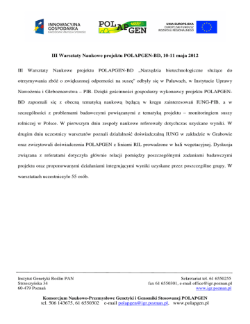 III Warsztaty Naukowe projektu POLAPGEN-BD, 10-11 maja 2012 III Warsztaty Naukowe projektu POLAPGEN-BD „Narzędzia biotechnologiczne słuŜące do otrzymywania zbóŜ o zwiększonej odporności na suszę'' odbyły się w Puławach, w Instytucie Uprawy NawoŜenia i Gleboznawstwa – PIB. Dzięki gościnności gospodarzy wykonawcy projektu POLAPGENBD zapoznali się z obecną tematyką naukową będącą w kręgu zainteresowań IUNG-PIB, a w szczególności z problemami badawczymi powiązanymi z tematyką projektu – monitoringiem suszy rolniczej w Polsce. W pierwszym dniu zespoły naukowe referowały dotychczas uzyskane wyniki. W drugim dniu uczestnicy warsztatów poznali działalność doświadczalną IUNG w zakładzie w Grabowie oraz zwizytowali doświadczenia POLAPGEN z liniami RIL prowadzone w hali wegetacyjnej. Dyskusja związana z referatami dotyczyła głównie relacji pomiędzy poszczególnymi zadaniami badawczymi projektu oraz proponowanymi działaniami integrującymi wyniki uzyskane przez poszczególne grupy. W warsztatach uczestniczyło 55 osób. Instytut Genetyki Roślin PAN Strzeszyńska 34 60-479 Poznań Sekretariat tel. 61 6550255 fax 61 6550301, e-mail [email protected] www.igr.poznan.pl Konsorcjum Naukowo-Przemysłowe Genetyki i Genomiki Stosowanej POLAPGEN tel. 506 143675, 61 6550302 e-mail [email protected], www.polapgen.pl III Warsztaty Naukowe projektu POLAPGEN-BD, 10-11 maja 2012 Obrady w Sali Balowej Zwiedzanie obiektów IUNG-PIB Omawianie systemu nawadniania wazonów Doświadczenie z liniami RIL Dyskusja nad doświadczeniem Zwiedzanie zakładu w Grabowie Program warsztatów POLAPGEN w Puławach 10 maja 2012 Godzina Zadanie Instytucja Czas [min] Stanisław Krasowicz Główne kierunki działalności IUNG-PIB IUNG-PIB 15 Andrzej Doroszewski Monitoring suszy rolniczej w Polsce IUNG-PIB 15 1 Andrzej Kędziora Obecny i przyszły bilans wodny okresu wegetacyjnego jęczmienia jarego na terenie Polski IŚRiL PAN 20 3 Alicja Pecio Ocena stanu odŜywienia roślin zboŜowych azotem i potasem IUNG-PIB 15 2 Anetta Kuczyńska Wstępne wyniki doświadczenia szklarniowego i polowego z 2011 r. IGR PAN 15 8:30-10:00 Referent Tytuł referatu Dyskusja 10:00-10:30 10:30-12:30 10 Przerwa 5 Tomasz Wyka Morfo-anatomiczne róŜnice odmianowe liści jęczmienia oraz modyfikacje pod wpływem suszy 6 Grzegorz Józefaciuk Wybrane właściwości fizykochemiczne korzeni oraz liści jęczmienia odmian Maresi i CamB1 w warunkach suszy 4 Kornelia Adamska 22 23 UAM 20 IA PAN 20 Tworzenie mapy szkieletowej markerów SSR populacji RIL otrzymanej z krzyŜówki ‘Maresi’ x ‘CamB1C1’ UŚ 20 Agata Daszkowska-Golec Wykorzystanie strategii TILLING w analizie genów-kandydatów związanych z odpowiedzią jęczmienia na stres niedoboru wody UŚ 20 Hanna Ćwiek Ontologie i ich rola w opisie wyników doświadczeń IGR PAN 20 Dyskusja 12:30-14:30 14:30-16:30 20 Zwiedzanie parku, lunch 17 Małgorzata Kaczmarek Analiza profilu transkrypcyjnego jęczmienia, linii odpornej i wraŜliwej na stres suszy, dla warunków stresowych i po hartowaniu CaCl2, z wykorzystaniem mikromacierzy oligonukleotydowej GeneChip Barley1 22K Affymetrix IGR PAN 20 18 Katarzyna Śniegowska Wewnętrzne standardy w badaniu ekspresji genów techniką Real-Time PCR u roślin jęczmienia jarego (Hordeum vulgare L.) poddanych działaniu suszy UR Kraków 20 19 Agnieszka Janiak Ocena zmian w ekspresji genów w liściach i korzeniach siewek jęczmienia w odpowiedzi na stres suszy UŚ 20 20 Katarzyna Kruszka ZłoŜone dojrzewanie wybranych mikroRNA w jęczmieniu UAM 15 20 Andrzej Pacak Splicing jest niezbędny do produkcji mikroRNA444 w jęczmieniu UAM 15 20 Aleksandra Świda-Barteczka Głębokie sekwencjonowanie krótkich RNA Hordeum vulgare w roślinach kontrolnych i poddanych stresowi niedoboru wody UAM 15 Dyskusja 16:30-16:50 16:50-18:40 15 Przerwa 13 Klaudia Sikorska Analiza proteomiczna siewek jęczmienia w warunkach niedoboru wody 15, 16, 23 Barbara Swarcewicz, Anna Piasecka, Aneta Sawikowska Analiza zmian metabolomu liści jęczmienia w warunkach suszy 21 Mateusz de Mezer ZróŜnicowanie reakcji jęczmienia na stres niedoboru wody na podstawie analizy cech fizjologicznych i molekularnych Dyskusja 19:30 ----- Kolacja (hotel Trzy Korony) 11 maja 2012 8:00 Wyjazd spod hotelu do RZD Grabów 8:45-9:00 Informacja dyr. Marka Sowińskiego o RZD Grabów 9:00-10:00 Prezentacja doświadczenia wazonowego w hali wegetacyjnej 10:00-10:30 Przerwa 10:30-11:30 Lustracja doświadczeń polowych 12.00-13.00 Obiad 13:00 Odjazd do Puław 13:30 Przyjazd do hotelu w Puławach ICHB PAN 20 ICHB PAN, IGR PAN 40 IGR PAN 20 10
