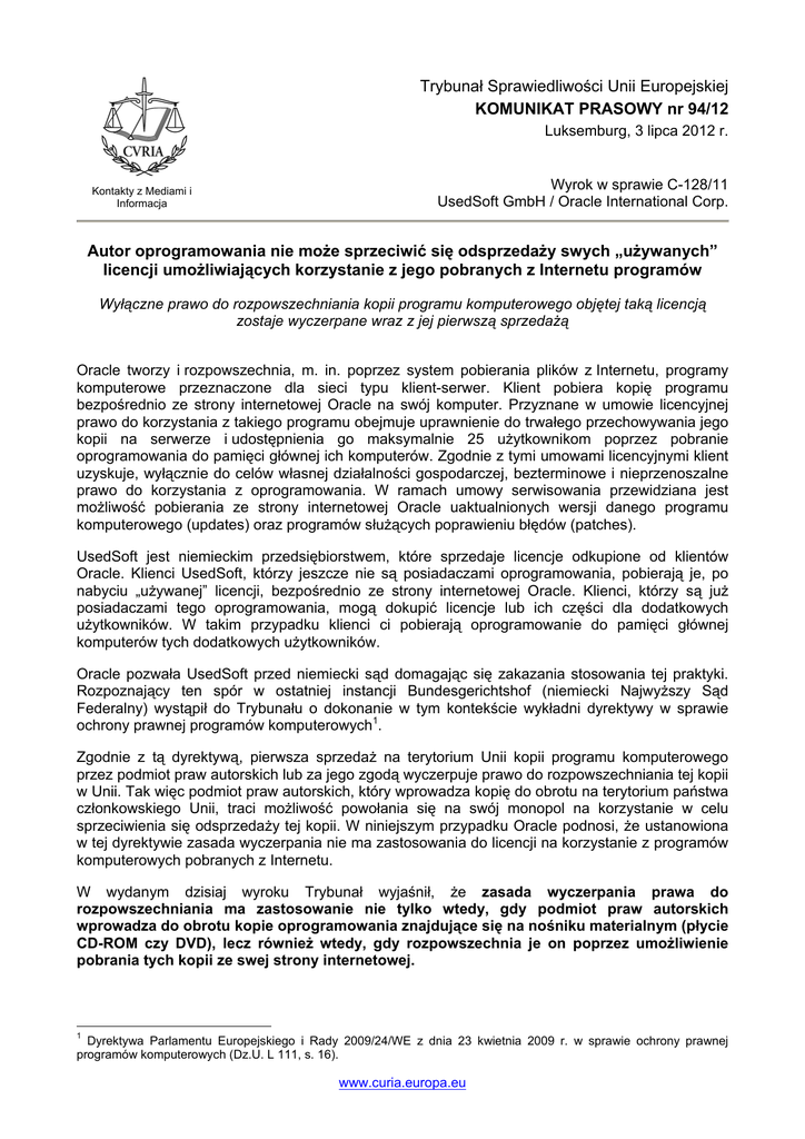 Trybunał Sprawiedliwości Unii Europejskiej KOMUNIKAT PRASOWY nr 94/12 Luksemburg, 3 lipca 2012 r. Kontakty z Mediami i Informacja Wyrok w sprawie C-128/11 UsedSoft GmbH / Oracle International Corp. Autor oprogramowania nie może sprzeciwić się odsprzedaży swych „używanych” licencji umożliwiających korzystanie z jego pobranych z Internetu programów Wyłączne prawo do rozpowszechniania kopii programu komputerowego objętej taką licencją zostaje wyczerpane wraz z jej pierwszą sprzedażą Oracle tworzy i rozpowszechnia, m. in. poprzez system pobierania plików z Internetu, programy komputerowe przeznaczone dla sieci typu klient-serwer. Klient pobiera kopię programu bezpośrednio ze strony internetowej Oracle na swój komputer. Przyznane w umowie licencyjnej prawo do korzystania z takiego programu obejmuje uprawnienie do trwałego przechowywania jego kopii na serwerze i udostępnienia go maksymalnie 25 użytkownikom poprzez pobranie oprogramowania do pamięci głównej ich komputerów. Zgodnie z tymi umowami licencyjnymi klient uzyskuje, wyłącznie do celów własnej działalności gospodarczej, bezterminowe i nieprzenoszalne prawo do korzystania z oprogramowania. W ramach umowy serwisowania przewidziana jest możliwość pobierania ze strony internetowej Oracle uaktualnionych wersji danego programu komputerowego (updates) oraz programów służących poprawieniu błędów (patches). UsedSoft jest niemieckim przedsiębiorstwem, które sprzedaje licencje odkupione od klientów Oracle. Klienci UsedSoft, którzy jeszcze nie są posiadaczami oprogramowania, pobierają je, po nabyciu „używanej” licencji, bezpośrednio ze strony internetowej Oracle. Klienci, którzy są już posiadaczami tego oprogramowania, mogą dokupić licencje lub ich części dla dodatkowych użytkowników. W takim przypadku klienci ci pobierają oprogramowanie do pamięci głównej komputerów tych dodatkowych użytkowników. Oracle pozwała UsedSoft przed niemiecki sąd domagając się zakazania stosowania tej praktyki. Rozpoznający ten spór w ostatniej instancji Bundesgerichtshof (niemiecki Najwyższy Sąd Federalny) wystąpił do Trybunału o dokonanie w tym kontekście wykładni dyrektywy w sprawie ochrony prawnej programów komputerowych1. Zgodnie z tą dyrektywą, pierwsza sprzedaż na terytorium Unii kopii programu komputerowego przez podmiot praw autorskich lub za jego zgodą wyczerpuje prawo do rozpowszechniania tej kopii w Unii. Tak więc podmiot praw autorskich, który wprowadza kopię do obrotu na terytorium państwa członkowskiego Unii, traci możliwość powołania się na swój monopol na korzystanie w celu sprzeciwienia się odsprzedaży tej kopii. W niniejszym przypadku Oracle podnosi, że ustanowiona w tej dyrektywie zasada wyczerpania nie ma zastosowania do licencji na korzystanie z programów komputerowych pobranych z Internetu. W wydanym dzisiaj wyroku Trybunał wyjaśnił, że zasada wyczerpania prawa do rozpowszechniania ma zastosowanie nie tylko wtedy, gdy podmiot praw autorskich wprowadza do obrotu kopie oprogramowania znajdujące się na nośniku materialnym (płycie CD-ROM czy DVD), lecz również wtedy, gdy rozpowszechnia je on poprzez umożliwienie pobrania tych kopii ze swej strony internetowej. 1 Dyrektywa Parlamentu Europejskiego i Rady 2009/24/WE z dnia 23 kwietnia 2009 r. w sprawie ochrony prawnej programów komputerowych (Dz.U. L 111, s. 16). www.curia.europa.eu Jeśli bowiem podmiot praw autorskich udostępnia swemu klientowi kopię – niezależnie od tego, czy jest to kopia materialna czy niematerialna – zawierając jednocześnie z nim przewidującą zapłatę ceny umowę licencyjną przyznającą bezterminowe prawo do korzystania z tej kopii, podmiot ten sprzedaje tę kopię klientowi i wyczerpuje w ten sposób swoje wyłączne prawo do rozpowszechniania. Transakcja taka wiąże się bowiem z przeniesieniem prawa własności tej kopii. Nawet jeśli ta umowa licencyjna zakazuje dalszego zbywania, podmiot prawa autorskiego nie może już sprzeciwić się odsprzedaży tej kopii. Trybunał zaznaczył w szczególności, że ograniczenie zastosowania zasady wyczerpania prawa do rozpowszechniania tylko do kopii programów komputerowych sprzedawanych na nośnikach materialnych umożliwiałoby podmiotowi praw autorskich sprawowanie kontroli nad odsprzedażą kopii, które zostały pobrane z Internetu i żądanie przy każdej transakcji odsprzedaży zapłaty kolejnego wynagrodzenia pomimo tego, że pierwsza sprzedaż tej kopii już umożliwiła temu podmiotowi uzyskanie odpowiedniego wynagrodzenia. Takie ograniczenie odsprzedaży pobranych z Internetu programów komputerowych wykraczałoby poza to, co jest konieczne do ochrony praw, które stanowią szczególny przedmiot własności intelektualnej. Ponadto wyczerpanie prawa do rozpowszechniania obejmuje swym zakresem również kopię programu komputerowego, która została sprzedana już po uaktualnieniu jej przez podmiot praw autorskich i wprowadzeniu przezeń poprawek. Nawet bowiem w przypadku, w którym umowa serwisowania została zawarta na czas określony, funkcje tego programu, które zostały naprawione, zmienione lub dodane w ramach wykonania takiej umowy, stanowią integralną część początkowo pobranej kopii i klient może z nich korzystać w nieograniczony w czasie sposób. Trybunał podkreślił jednak, że jeśli kupiona przez pierwszego nabywcę licencja występowała w pakiecie dla takiej ilości użytkowników, która przekraczała jego potrzeby, nabywca ten nie ma jednak prawa, opierając się na zasadzie wyczerpania prawa do rozpowszechniania, do dokonania podziału tej licencji i jej częściowego odsprzedania. Trybunał wyjaśnił ponadto, że początkowy nabywca materialnej lub niematerialnej kopii programu komputerowego, którego prawo do dystrybucji przez podmiot praw autorskich zostało wyczerpane, powinien w momencie odsprzedaży dezaktywować jego pobraną na swój komputer kopię. Jeśli 