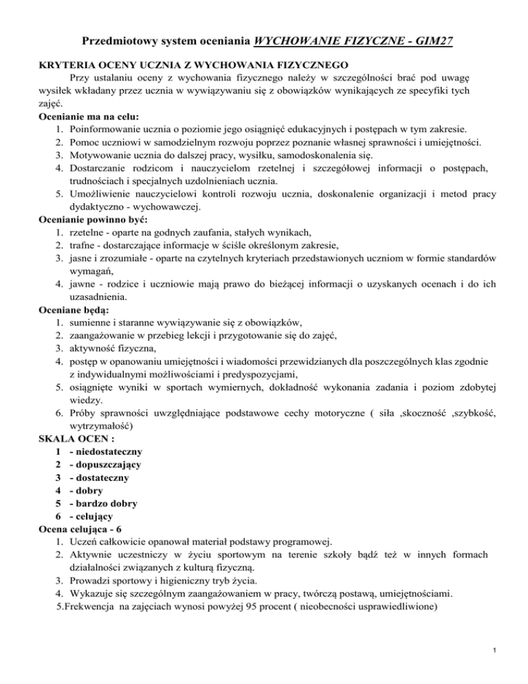 Przedmiotowy system oceniania WYCHOWANIE FIZYCZNE - GIM27 KRYTERIA OCENY UCZNIA Z WYCHOWANIA FIZYCZNEGO Przy ustalaniu oceny z wychowania fizycznego należy w szczególności brać pod uwagę wysiłek wkładany przez ucznia w wywiązywaniu się z obowiązków wynikających ze specyfiki tych zajęć. Ocenianie ma na celu: 1. Poinformowanie ucznia o poziomie jego osiągnięć edukacyjnych i postępach w tym zakresie. 2. Pomoc uczniowi w samodzielnym rozwoju poprzez poznanie własnej sprawności i umiejętności. 3. Motywowanie ucznia do dalszej pracy, wysiłku, samodoskonalenia się. 4. Dostarczanie rodzicom i nauczycielom rzetelnej i szczegółowej informacji o postępach, trudnościach i specjalnych uzdolnieniach ucznia. 5. Umożliwienie nauczycielowi kontroli rozwoju ucznia, doskonalenie organizacji i metod pracy dydaktyczno - wychowawczej. Ocenianie powinno być: 1. rzetelne - oparte na godnych zaufania, stałych wynikach, 2. trafne - dostarczające informacje w ściśle określonym zakresie, 3. jasne i zrozumiałe - oparte na czytelnych kryteriach przedstawionych uczniom w formie standardów wymagań, 4. jawne - rodzice i uczniowie mają prawo do bieżącej informacji o uzyskanych ocenach i do ich uzasadnienia. Oceniane będą: 1. sumienne i staranne wywiązywanie się z obowiązków, 2. zaangażowanie w przebieg lekcji i przygotowanie się do zajęć, 3. aktywność fizyczna, 4. postęp w opanowaniu umiejętności i wiadomości przewidzianych dla poszczególnych klas zgodnie z indywidualnymi możliwościami i predyspozycjami, 5. osiągnięte wyniki w sportach wymiernych, dokładność wykonania zadania i poziom zdobytej wiedzy. 6. Próby sprawności uwzględniające podstawowe cechy motoryczne ( siła ,skoczność ,szybkość, wytrzymałość) SKALA OCEN : 1 - niedostateczny 2 - dopuszczający 3 - dostateczny 4 - dobry 5 - bardzo dobry 6 - celujący Ocena celująca - 6 1. Uczeń całkowicie opanował materiał podstawy programowej. 2. Aktywnie uczestniczy w życiu sportowym na terenie szkoły bądź też w innych formach działalności związanych z kulturą fizyczną. 3. Prowadzi sportowy i higieniczny tryb życia. 4. Wykazuje się szczególnym zaangażowaniem w pracy, twórczą postawą, umiejętnościami. 5.Frekwencja na zajęciach wynosi powyżej 95 procent ( nieobecności usprawiedliwione) 1 Ocena bardzo dobra - 5 1. Uczeń całkowicie opanował materiał podstawy programowej. 2. Prowadzi sportowy i higieniczny tryb życia. 3. Ćwiczenia wykonuje z właściwą techniką, pewnie, w odpowiednim tempie, dokładnie, 4. Zna założenia taktyczne i przepisy dyscyplin sportowych zawartych w programie. 5. Posiada duże wiadomości w zakresie kultury fizycznej i umiejętnie wykorzystuje je w praktycznym działaniu. 6. Systematycznie doskonali swoją sprawność motoryczną i wykazuje duże postępy w osobistym usprawnieniu. 7. Jego postawa, zaangażowanie i stosunek do wychowania fizycznego nie budzą najmniejszych zastrzeżeń. 8. Frekwencja na zajęciach wynosi powyżej 90 procent ( nieobecności usprawiedliwione) Ocena dobra - 4 1. Uczeń w zasadzie opanował materiał podstawy programowej. 2. Dysponuje dobrą sprawnością motoryczną. 3. Ćwiczenia wykonuje prawidłowo, lecz nie dość dokładnie z małymi błędami technicznymi. 4. Posiadane wiadomości potrafi wykorzystać w praktyce przy pomocy nauczyciela. 5. Nie potrzebuje większych bodźców do pracy nad osobistym usprawnieniem, wskazuje stałe i dość dobre postępy w tym zakresie. 6. Jego postawa i stosunek do kultury fizycznej nie budzi większych zastrzeżeń. 7. Prowadzi higieniczny tryb życia. 8. Frekwencja na zajęciach wynosi powyżej 85 procent ( nieobecności usprawiedliwione ) Ocena dostateczna - 3 1. Uczeń opanował materiał podstawowy programowej na przeciętnym poziomie. 2. Dysponuje przeciętną sprawnością motoryczną. Ćwiczenia wykonuje niepewnie, w nieodpowiednim tempie z błędami technicznymi. 3. Wykazuje małe postępy w usprawnieniu motorycznym. 4. W jego wiadomościach zakresu kultury fizycznej są znaczne luki. 5. Wykazuje małe postępy w usprawnianiu. 6. Frekwencja na zajęciach wynosi powyżej 80 procent ( nieobecności usprawiedliwione) Ocena dopuszczająca - 2 1. Uczeń nie opanował materiału podstawy programowej w stopniu dostatecznym i ma poważne luki. 2. Jest mało sprawny fizycznie. 3. Ćwiczenia wykonuje niechętnie i z dużymi błędami technicznymi. 4. Posiada małe wiadomości z zakresu kultury fizycznej, nie potrafi wykonać prostych zadań związanych z samooceną. 5. Nie jest pilny i wykazuje bardzo małe postępy w usprawnieniu. 6. Na zajęciach wychowania fizycznego ma niechętny stosunek do ćwiczeń. 7. Frekwencja na zajęciach wynosi powyżej 50 procent ( nieobecności usprawiedliwione) Ocena niedostateczna - 1 1. Uczeń nie spełnienia wymagań stawianych przez założenia podstawy programowej. 2. Posiada bardzo niską sprawność motoryczną. 3. Wykonuje jedynie najprostsze ćwiczenia i w dodatku z błędami. 4. Charakteryzuje się niewiedzą w zakresie kultury fizycznej. 5. Ma lekceważący stosunek do zajęć i nie wykazuje żadnych postępów w usprawnieniu. 6. Na zajęciach wychowania fizycznego wykazuje duże braki w zakresie wychowania. 2 Strój sportowy : - uczeń nigdy nie zapomina stroju i ma usprawiedliwienia w przypadku jego braku . Uczeń ma prawo 3 razy w ciągu semestru do niećwiczenia bez usprawiedliwienia (brak stroju, lub inne okoliczności). W przypadku większej ilości braku stroju (bez usprawiedliwienia), uczeń za każdym razem otrzymuje ocenę niedostateczną. WARUNKI I TRYB UZYSKANIA WYŻSZEJ NIŻ PRZEWIDYWANA OCENY ŚRÓDROCZNEJ LUB KOŃCOWOROCZNEJ Na miesiąc przed terminem wystawienia proponowanych ocen śródrocznych lub rocznych nauczyciele informują uczniów o przewidywanych stopniach. Uczeń lub jego rodzice/prawni opiekunowie mają prawo wnioskować (na piśmie) o podwyższenie oceny z wychowania fizycznego w terminie nie dłuższym ni