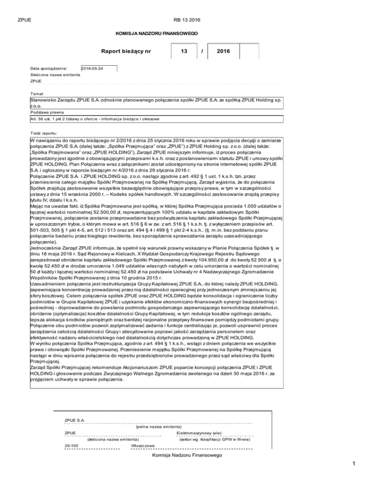 ZPUE RB 13 2016 KOMISJA NADZORU FINANSOWEGO Raport bieżący nr Data sporządzenia: 13 / 2016 2016-05-24 Skróc ona nazwa emitenta ZPUE Temat Stanowisko Zarządu ZPUE S.A. odnośnie planowanego połączenia spółki ZPUE S.A. ze spółką ZPUE Holding sp. z o.o. Podstawa prawna Art. 56 ust. 1 pkt 2 Ustawy o oferc ie - informac je bieżąc e i okresowe Treść raportu: W nawiązaniu do raportu bieżącego nr 2/2016 z dnia 25 stycznia 2016 roku w sprawie podjęcia decyzji o zamiarze połączenia ZPUE S.A. (dalej także: „Spółka Przejmująca” oraz „ZPUE”) z ZPUE Holding sp. z o.o. (dalej także: „Spółka Przejmowana” oraz „ZPUE HOLDING”), Zarząd ZPUE niniejszym informuje, iż proces połączenia prowadzony jest zgodnie z obowiązującymi przepisami k.s.h. oraz z postanowieniami statutu ZPUE i umowy spółki ZPUE HOLDING. Plan Połączenia wraz z załącznikami został udostępniony na stronie internetowej spółki ZPUE S.A. i ogłoszony w raporcie bieżącym nr 4/2016 z dnia 29 stycznia 2016 r. Połączenie ZPUE S.A. i ZPUE HOLDING sp. z o.o. nastąpi zgodnie z art. 492 § 1 ust. 1 k.s.h. tzn. przez przeniesienie całego majątku Spółki Przejmowanej na Spółkę Przejmującą. Zarząd wyjaśnia, że do połączenia Spółek znajdują zastosowanie wszystkie bezwzględnie obowiązujące przepisy prawa, w tym w szczególności ustawy z dnia 15 września 2000 r. – Kodeks spółek handlowych. W szczególności zastosowanie znajdą przepisy tytułu IV, działu I k.s.h. Mając na uwadze fakt, iż Spółka Przejmowana jest spółką, w której Spółka Przejmująca posiada 1.050 udziałów o łącznej wartości nominalnej 52.500,00 zł, reprezentujących 100% udziału w kapitale zakładowym Spółki Przejmowanej, połączenie zostanie przeprowadzone bez podwyższenia kapitału zakładowego Spółki Przejmującej w uproszczonym trybie, o którym mowa w art. 516 § 6 w zw. z art. 516 § 1 k.s.h. tj. z wyłączeniem przepisów art. 501-503, 505 § 1 pkt 4-5, art. 512 i 513 oraz art. 494 § 4 i 499 § 1 pkt 2-4 k.s.h.. (tj. m.in. bez poddaniu planu połączenia badaniu przez biegłego rewidenta, bez sporządzenia sprawozdania zarządu uzasadniającego połączenie). Jednocześnie Zarząd ZPUE informuje, że spełnił się warunek prawny wskazany w Planie Połączenia Spółek tj. w dniu 18 maja 2016 r. Sąd Rejonowy w Kielcach, X Wydział Gospodarczy Krajowego Rejestru Sądowego zarejestrował obniżenie kapitału zakładowego Spółki Przejmowanej z kwoty 104.950,00 zł do kwoty 52.500 zł tj. o kwotę 52.450 zł w drodze umorzenia 1.049 udziałów własnych nabytych w celu umorzenia o wartości nominalnej 50 zł każdy i łącznej wartości nominalnej 52.450 zł na podstawie Uchwały nr 4 Nadzwyczajnego Zgromadzenie Wspólników Spółki Przejmowanej z dnia 10 grudnia 2015 r. Uzasadnieniem połączenia jest restrukturyzacja Grupy Kapitałowej ZPUE S.A., do której należy ZPUE HOLDING, zapewniająca koncentrację prowadzonej przez nią działalności operacyjnej przy jednoczesnym zmniejszeniu jej sfery kosztowej. Celem połączenia spółek ZPUE oraz ZPUE HOLDING będzie konsolidacja i ograniczenie liczby podmiotów w Grupie Kapitałowej ZPUE i uzyskanie efektów ekonomiczno-finansowych synergii bezpośredniej i pośredniej - doprowadzenie do powstania podmiotu gospodarczego zapewniającego konsolidację działalności, obniżenie (optymalizacja) kosztów działalności Grupy Kapitałowej, w tym redukcja kosztów ogólnego zarządu, lepsza alokacja środków pieniężnych oraz bardziej racjonalne przepływy finansowe pomiędzy podmiotami grupy. Połączenie obu podmiotów pozwoli zoptymalizować zadania i funkcje centralizując je, pozwoli usprawnić proces zarządzania całością działalności Grupy i zdecydowanie poprawi jakość zarządzania personelem oraz efektywność nadzoru właścicielskiego nad działalnością dotychczas prowadzoną w ZPUE HOLDING. W wyniku połączenia Spółka Przejmująca, zgodnie z art. 494 § 1 k.s.h., wstąpi z dniem połączenia we wszystkie prawa i obowiązki Spółki Przejmowanej. Przeniesienie majątku Spółki Przejmowanej na Spółkę Przejmującą nastąpi w dniu wpisania połączenia do rejestru przedsiębiorców prowadzonego przez sąd właściwy dla Spółki Przejmującej. Zarząd Spółki Przejmującej rekomenduje Akcjonariuszom ZPUE poparcie koncepcji połączenia ZPUE i ZPUE HOLDING i głosowanie podczas Zwyczajnego Walnego Zgromadzenia zwołanego na dzień 30 maja 2016 r. za przyjęciem uchwały w sprawie połączenia. ZPUE S.A. (pełna nazwa emitenta) Elektromaszynowy (ele) ZPUE (skróc ona nazwa emitenta) 29-100 (sektor wg. klasyfikac ji GPW w W-wie) Włoszczowa Komisja Nadzoru Finansowego 1 ZPUE RB 13 2016 (kod poc ztowy) (miejscowość) Jędrzejowska 79c (ulica) (numer) 041 3881000 041 3881001 (telefon) (fax) [email protected] zpue.pl (e-mail) (www) 656-14-94-014 290780734 (NIP) (REGON) PODPISY OSÓB REPREZENTUJĄCYCH SPÓŁKĘ Data Imię i Nazwisko Stanowisko/Funkc ja 2016-05-24 Krzysztof Jamróz Członek Zarządu 2016-05-24 Tomasz Stępień Członek Zarządu Podpis Komisja Nadzoru Finansowego 2
