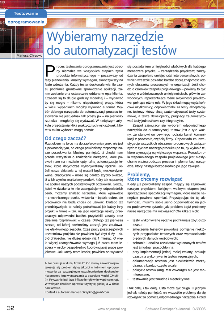 Testowanie oprogramowania Mariusz Chrapko Wybieramy narzędzie do automatyzacji testów P roces testowania oprogramowania jest obecny niemalże we wszystkich etapach życia produktu informatycznego – począwszy od fazy planowania i analizy wymagań, skończywszy na fazie wdrożenia. Każdy tester doskonale wie, ile czasu pochłania gruntowne sprawdzenie aplikacji, zanim zostanie ona ostatecznie oddana w ręce klienta. Czasem są to długie godziny mozolnej i – wydawać by się mogło – nikomu niepotrzebnej pracy, którą w wielu wypadkach mógłby wykonać automat. Wybór dobrego narzędzia do automatyzacji procesu testowania nie jest jednak tak prosty jak – na pierwszy rzut oka – mogło by się wydawać. W niniejszym artykule przedstawię klika praktycznych wskazówek, które w takim wyborze mogą pomóc. Od czego zacząć? Rzut okiem na to co ma do zaoferowania rynek, nie jest z pewnością tym, od czego powinniśmy rozpocząć nasze poszukiwania. Musimy pamiętać, iż chodzi nam przede wszystkim o znalezienie narzędzia, które pozwoli nam na możliwie optymalną automatyzację testów, które dotychczas wykonywaliśmy ręcznie. Jeżeli nasze działania w tej materii będą nieskoordynowane, chaotyczne – może się bardzo szybko okazać, iż w ich wyniku znajdziemy produkt, który tak naprawdę nie spełnia naszych podstawowych oczekiwań. Gorzej, jeżeli w działania te nie zaangażujemy odpowiednich osób, możemy znaleźć narzędzie, które wprawdzie – z technicznego punktu widzenia – będzie dobre, ale pracownicy nie będą chcieli go używać. Dlatego też przedsięwzięcie to należy potraktować jak każdy inny projekt w firmie – tzn. na jego realizację należy przeznaczyć odpowiedni budżet, przydzielić zasoby oraz działania rozplanować w czasie. Dlatego też pierwszą rzeczą, od której powinniśmy zacząć, jest zbudowanie efektywnego zespołu. Czas pracy poszczególnych uczestników projektu nie powinien być zbyt duży – ok. 3-5 dni/osobę, nie dłużej jednak niż 1 miesiąc. O wiele więcej zaangażowania wymaga już praca team leadera – osoby bezpośrednio koordynującej prace projektowe. Jak każdy team leader, powinien on wykazać Autor pracuje w dużej firmie IT. Od strony zawodowej interesuje się problematyką jakości w inżynierii oprogramowania ze szczególnym uwzględnieniem doskonalenia procesu jego wytwarzania w oparciu o Model CMMI(I). Prywatnie lubi jazz i filozofię (głównie współczesną). W wolnych chwilach uprawia turystykę góską, a w zimie narciarstwo. Kontakt z autorem: [email protected] 32 www.sdjournal.org się posiadaniem umiejętności właściwych dla każdego menedżera projektu – zarządzania projektem; zarządzania zespołem; umiejętności interpersonalnych; powinien wreszcie posiadać bardzo dobrą znajomość różnych obszarów procesowych w organizacji. Jeśli chodzi o członków zespołu projektowego – powinny to być osoby o zróżnicowanych umiejętnościach, głównie zawodowych, reprezentujące różne aktywności projektowe, pełniące różne role. W jego skład mogą wejść końcowi użytkownicy, odpowiedzialni za testy akceptacyjne, testerzy którzy chcą zautomatyzować testy systemowe, a także deweloperzy, pragnący zautomatyzować testy jednostkowe czy integracyjne. Zespół zajmujący się wyborem odpowiedniego narzędzia do automatyzacji testów jest o tyle ważny, że stanowi on pewnego rodzaju kanał komunikacji z pozostałą częścią firmy. Odpowiada za inwestygację wszystkich obszarów procesowych związanych z życiem naszego produktu po to, by wyłonić te, które wymagają największego wsparcia. Ponadto rola wspomnianego zespołu projektowego jest niesłychanie ważna podczas procesu implementacji narzędzia, który nastąpi bezpośrednio po jego zakupie. Problemy, które chcemy rozwiązać Kiedy już powołaliśmy zespół, mający się zajmować naszym projektem, kolejnym ważnym etapem jest sporządzenie specyfikacji wymagań, które nasze narzędzie powinno spełniać. Przystępując do tej aktywności, musimy sobie jasno odpowiedzieć na jedno podstawowe pytanie: jaki problem bądź problemy nasze narzędzie ma rozwiązać? Oto kilka z nich: • • • • • • • testy wykonywane ręcznie pochłaniają zbyt dużo czasu; zmęczenie testerów powoduje pomijanie niektórych przypadków testowych oraz wprowadzanie błędnych danych wejściowych; zebranie i analiza rezultatów wykonanych testów jest żmudna i pracochłonna; przy implementacji jednej małej zmiany, brakuje czasu na wykonywanie testów regresyjnych; dokumentacja testowa jest niewłaściwie zarządzana, a bardzo często wcale; pokrycie testów (ang. test coverage) nie jest monitorowane; testowanie jest żmudne i nieefektywne. I tak dalej, i tak dalej. Lista może być długa. O jednym jednak należy pamiętać: nie wszystkie problemy da się rozwiązać za pomocą odpowiedniego narzędzia. Przed Software Developer’s Journal 9/2006 Wybieramy narzędzie do automatyzacji testów zakupami dobrze jest zastanowić się, które z wyszczególnionych problemów jesteśmy w stanie rozwiązać sami, za pomocą dostępnych zasobów w firmie. Na przykład jeżeli nie potrafimy sobie poradzić z właściwym zarządzaniem dokumentacją testową, której jest zbyt dużo, i która jest przechowywana w różnych miejscach na serwerze – może wystarczy delegować do tego jakąś jedną osobę, która po prostu zrobi z tym porządek – wydzieli odpowiednie zasoby dyskowe, utworzy specjalne katalogi, etc. Podobnie w przypadku zapisywania i analizy rezultatów testowych. Niekiedy zwykły arkusz kalkulacyjny może się okazać w zupełności wystarczający. W sytuacji natomiast, gdy wykonywane przez nas testy są mało efektywne, być może należy użyć odpowiednich technik – chociażby takich jak inspekcja, która może być stosowana zarówno w przypadku testowania samego kodu, jak i dokumentacji. Zainteresowanych