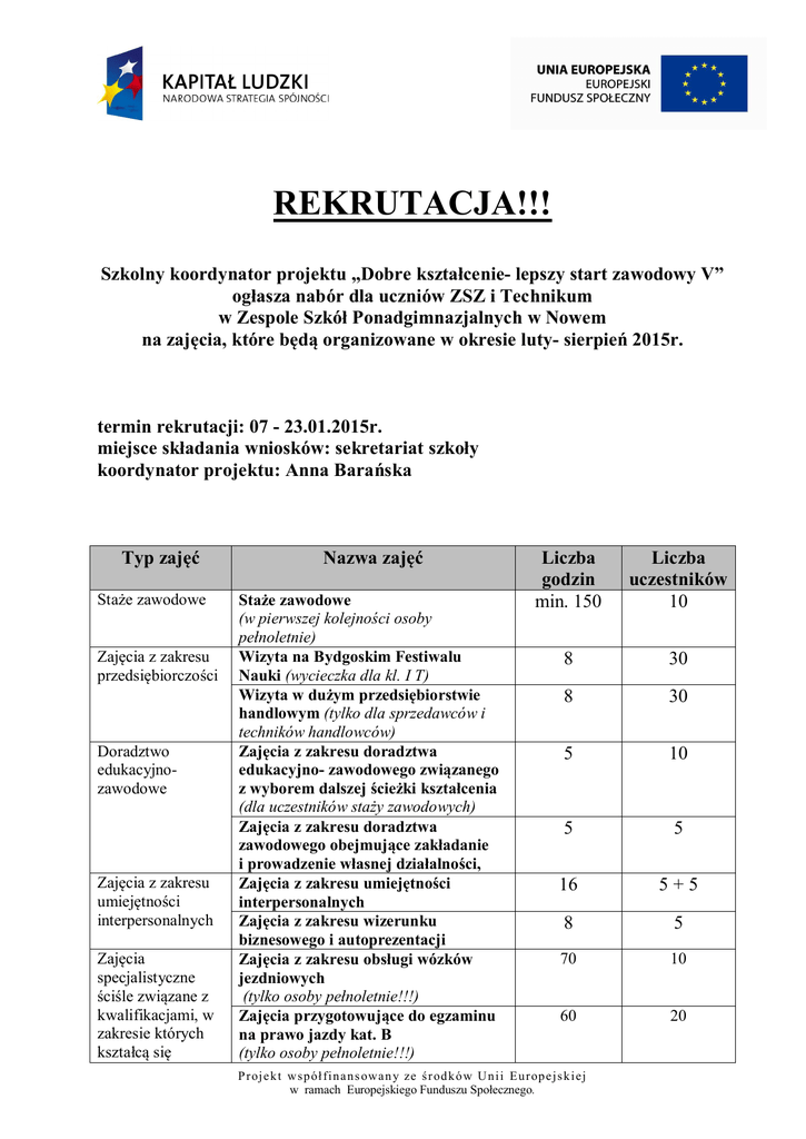 REKRUTACJA!!! Szkolny koordynator projektu „Dobre kszta cenie- lepszy start zawodowy V” og asza nabór dla uczniów ZSZ i Technikum w Zespole Szkó Ponadgimnazjalnych w Nowem na zaj cia, które b organizowane w okresie luty- sierpie 2015r. termin rekrutacji: 07 - 23.01.2015r. miejsce sk adania wniosków: sekretariat szko y koordynator projektu: Anna Bara ska Typ zaj Nazwa zaj Sta e zawodowe Sta e zawodowe (w pierwszej kolejno ci osoby pe noletnie) Wizyta na Bydgoskim Festiwalu Nauki (wycieczka dla kl. I T) Wizyta w du ym przedsi biorstwie handlowym (tylko dla sprzedawców i techników handlowców) Zaj cia z zakresu doradztwa edukacyjno- zawodowego zwi zanego z wyborem dalszej cie ki kszta cenia (dla uczestników sta y zawodowych) Zaj cia z zakresu doradztwa zawodowego obejmuj ce zak adanie i prowadzenie w asnej dzia alno ci, Zaj cia z zakresu umiej tno ci interpersonalnych Zaj cia z zakresu wizerunku biznesowego i autoprezentacji Zaj cia z zakresu obs ugi wózków jezdniowych (tylko osoby pe noletnie!!!) Zaj cia przygotowuj ce do egzaminu na prawo jazdy kat. B (tylko osoby pe noletnie!!!) Zaj cia z zakresu przedsi biorczo ci Doradztwo edukacyjnozawodowe Zaj cia z zakresu umiej tno ci interpersonalnych Zaj cia specjalistyczne ci le zwi zane z kwalifikacjami, w zakresie których kszta si Liczba godzin min. 150 Liczba uczestników 10 8 30 8 30 5 10 5 5 16 5+5 8 5 70 10 60 20 P r oj e k t w s p ó fi n a n s ow a n y ze r od k ó w U n i i E u r op e j s k i e j w ramach Europejskiego Funduszu Spo ecznego. uczniowie Dodatkowe zaj cia ukierunkowane na rozwój kompetencji kluczowych Zaj cia z zakresu pierwszej pomocy przedlekarskiej Zaj cia z zakresu obs ugi kas fiskalnych Zaj cia z zakresu obs ugi technicznych urz dze biurowych z pakietem programów biurowych Zaj cia z zakresu ICT: bezwzrokowa metoda pisania na klawiaturze 8 8 8 5+5 20 5 30 10 szkolny koordynator projektu: Anna Bara ska P r oj e k t w s p ó fi n a n s ow a n y ze r od k ó w U n i i E u r op e j s k i e j w ramach Europejskiego Funduszu Spo ecznego.