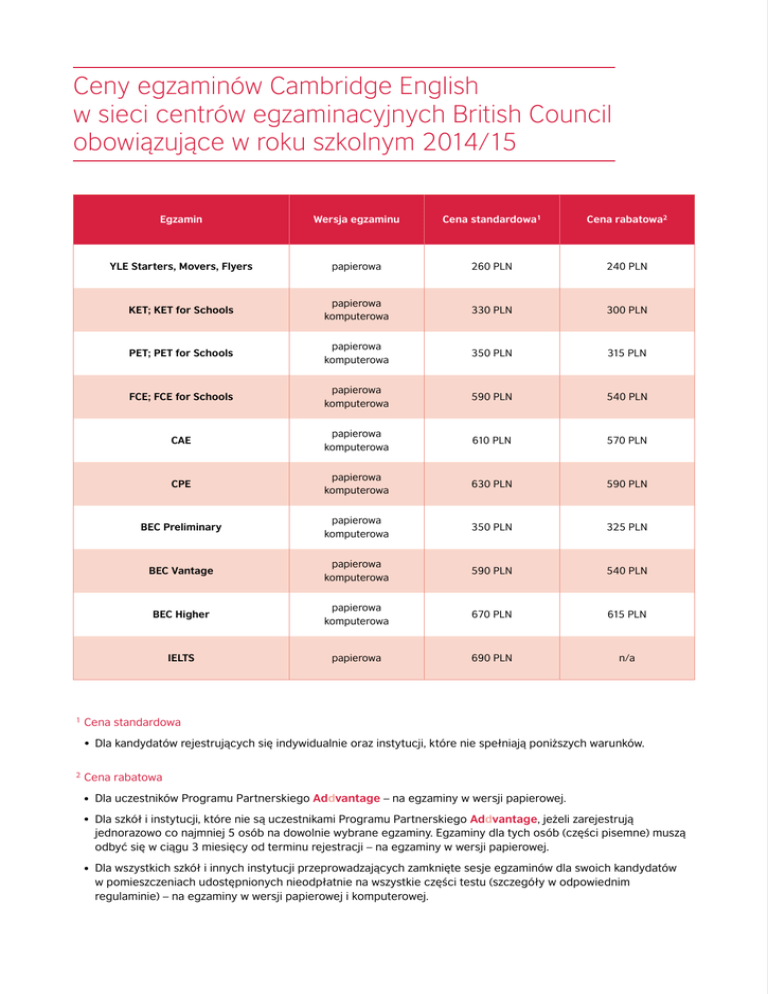 Ceny egzaminów Cambridge English w sieci centrów egzaminacyjnych British Council obowiązujące w roku szkolnym 2014/15 1 Egzamin Wersja egzaminu Cena standardowa1 Cena rabatowa2 YLE Starters, Movers, Flyers papierowa 260 PLN 240 PLN KET; KET for Schools papierowa komputerowa 330 PLN 300 PLN PET; PET for Schools papierowa komputerowa 350 PLN 315 PLN FCE; FCE for Schools papierowa komputerowa 590 PLN 540 PLN CAE papierowa komputerowa 610 PLN 570 PLN CPE papierowa komputerowa 630 PLN 590 PLN BEC Preliminary papierowa komputerowa 350 PLN 325 PLN BEC Vantage papierowa komputerowa 590 PLN 540 PLN BEC Higher papierowa komputerowa 670 PLN 615 PLN IELTS papierowa 690 PLN n/a Cena standardowa • Dla kandydatów rejestrujących się indywidualnie oraz instytucji, które nie spełniają poniższych warunków. 2 Cena rabatowa • Dla uczestników Programu Partnerskiego Addvantage – na egzaminy w wersji papierowej. • Dla szkół i instytucji, które nie są uczestnikami Programu Partnerskiego Addvantage, jeżeli zarejestrują jednorazowo co najmniej 5 osób na dowolnie wybrane egzaminy. Egzaminy dla tych osób (części pisemne) muszą odbyć się w ciągu 3 miesięcy od terminu rejestracji – na egzaminy w wersji papierowej. • Dla wszystkich szkół i innych instytucji przeprowadzających zamknięte sesje egzaminów dla swoich kandydatów w pomieszczeniach udostępnionych nieodpłatnie na wszystkie części testu (szczegóły w odpowiednim regulaminie) – na egzaminy w wersji papierowej i komputerowej. Daty sesji ogólnodostępnych YLE Termin egzaminu* Zakończenie rejestracji 24-05-2015 07-04-2015 YLE Warszawa Starters YLE Warszawa Movers 17-05-2015 30-03-2015 YLE Warszawa Flyers 10-05-2015 23-03-2015 Starters, Movers, Flyers 25-04-2015 09-03-2015 YLE Katowice, Kraków, Szczecin YLE Częstochowa Starters, Movers, Flyers 09-05-2015 23-03-2015 YLE Gdańsk, Lublin Starters, Movers, Flyers 16-05-2015 30-03-2015 YLE Poznań Starters, Movers, Flyers 31-05-2015 13-04-2015 PB 20-06-2015 07-05-2015 KET for Schools PB 07-03-2015 22-01-2015 KET for Schools PB 16-05-2015 30-03-2015 KET for Schools PB 13-06-2015 23-04-2015 PB 20-06-2015 07-05-2015 PET for Schools PB 07-03-2015 22-01-2015 PET for Schools PB 16-05-2015 PET for Schools PB 13-06-2015 KET KET KET for Schools W PET PET PET for Schools W 30-03-2015 23-04-2015 FCE FCE PB 13-03-2015 29-01-2015 FCE PB 16-05-2015W 30-03-2015 FCE PB 09-06-2015 08-04-2015 FCE PB 27-06-2015 23-04-2015 FCE for Schools FCE for Schools PB 21-03-2015 09-02-2015 FCE for Schools PB 13-06-2015 16-04-2015 CAE CAE PB 14-03-2015 22-01-2015 CAE PB 10-06-2015 08-04-2015 CPE PB 07-03-2015W 15-01-2015 CPE PB 11-06-2015 08-04-2015 CPE PB – wersja papierowa CB – wersja komputerowa W wyszukiwarce na stronie https://entrynet.britishcouncil.pl/szkoly.php znajdują się: * daty egzaminów ustnych, które mogą być różne od daty egzaminu pisemnego ** daty sesji zamkniętych W Egzaminy dostępne tylko w wybranych miastach