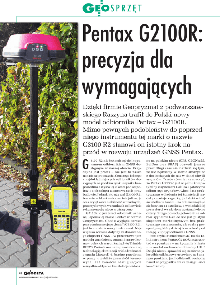 SPRZĘT Pentax G2100R: precyzja dla wymagających Dzięki firmie Geopryzmat z podwarszawskiego Raszyna trafił do Polski nowy model odbiornika Pentax – G2100R. Mimo pewnych podobieństw do poprzedniego instrumentu tej marki o nazwie G3100-R2 stanowi on istotny krok naprzód w rozwoju urządzeń GNSS Pentax. G 3100-R2 nie jest najczęściej kupowanym odbiornikiem GNSS dostępnym w naszej ofercie. Przyczyna jest prosta – nie jest to nasza najtańsza propozycja. Cena tego jednego z najdokładniejszych odbiorników dostępnych na polskim rynku wynika bezpośrednio z wysokiej jakości podzespołów i technologii zastosowanych przy budowie. Jednak kto używał G3100-R2, ten wie – błyskawiczna inicjalizacja oraz wyjątkowa stabilność w trudnych, przemysłowych warunkach całkowicie rekompensują nieco wyższą cenę. G2100R to już trzeci odbiornik uznanej japońskiej marki Pentax w ofercie Geopryzmatu. Choć z wyglądu bardzo przypomina swojego „brata” (G3100-R2), jest to zupełnie nowy instrument. Największa różnica dotyczy zastosowanego chipsetu GNSS – w prezentowanym modelu znajdziemy znaną i sprawdzoną w polskich warunkach płytę Trimble BD970. Posiada ona zaimplementowaną technologię eliminacji wielodrożności sygnału Maxwell 6, bardzo przydatną w pracy w pobliżu przeszkód terenowych. 220 kanałów obsługujących wszystkie aktywne konstelacje widocz- 42 MAGAZYN geoinformacYJNY nr 11 (258) listopad 2016 ne na polskim niebie (GPS, GLONASS, BeiDou oraz SBAS) pozwoli jeszcze przez długi czas nie martwić się tym, że nie będziemy w stanie skorzystać z docierających do nas w danej chwili sygnałów. Trzeba również zaznaczyć, że Pentax G2100R jest w pełni kompatybilny z systemem Galileo i gotowy na odbiór jego sygnałów. Choć data praktycznego wdrożenia tej konstelacji nadal pozostaje zagadką, już dziś widać światełko w tunelu – na orbicie znajduje się bowiem 14 satelitów, a w niedalekiej przyszłości wyniesione zostaną kolejne cztery. Z tego powodu gotowość na odbiór sygnałów Galileo nie jest pustym sloganem marketingowym bez praktycznego zastosowania, ale realną perspektywą, którą dzisiaj trzeba brać pod uwagę, kupując odbiornik GNSS. Poza szybkim modemem 3G marki Telit instrument Pentax G2100R może zos tać wyposażony – na życzenie klienta – w moduł nadawczo-odbiorczy UHF. Dzięki niemu sprawdzi się zarówno jako odbiornik bazowy ustawiony nad znanym punktem, jak i odbiornik ruchomy nawet w przypadku braku zasięgu sieci komórkowej. SPRZĘT ODBIORNIK PENTAX G2100R Rok wprowadzenia na rynek Płyta GNSS Liczba kanałów Śledzone sygnały 2016 Trimble BD970 220 GPS (L1 C/A, L2E, L2C,L5); GLONASS (L1 C/A, L1P, L2 C/A, L2P); Galileo (L1BOC, E5A, E5B, E5AltBOC); BeiDou (B1, B2); SBAS (L1 C/A, L5); QZSS (L1 C/A, L1 SAIF, L2C, L5) do 50 Hz Częstotliwość wyznaczania pozycji Dokł. wyznaczania pozycji/wysokości 2,5 mm + 1 ppm / 5 mm + 1 ppm statyczna 8 mm + 1 ppm / 15 mm + 1 ppm RTK RTCM 2.1, 2.2, 2.3, 3.0, 3.1, 3.2, CMR, Format RTK CMR+, sCMRx UHF nadawczo-odbiorczy (opcjonalnie) Radiomodem UMTS/HSPA+/GSM/GPRS/EDGE Modem GSM/GPRS 2 x bateria Li-Ion 3350 mAh Zasilanie (10 h pracy) 1,4 kg z dwiema bateriami Waga 198,5 mm x 197,5 mm x 99,0 mm Wymiary od -20°C do +65°C Temperatura pracy z2m Odporność na upadek 4 GB Pamięć wewnętrzna IP55 Pyło- i wodoszczelność 2 baterie, ładowarka, antena UHF Wyposażenie standardowe (opcjonalnie), kabel transmisyjny, kontroler, oprogramowanie, tyczka, walizka transportowa 24 miesiące Gwarancja Rejestrator PENTAX P9 Procesor System operacyjny Wyświetlacz Pamięć RAM Pamięć wewnętrzna Klawiatura Komunikacja Aparat fotograficzny Zasilanie Waga Norma odporności Temperatura pracy Pozostałe informacje K olejnym udogodnieniem jest brak konieczności każdorazowego wkręcania anteny GSM (która umożliwia odbiór poprawek RTK) przed wykonaniem pomiaru. Mocna antena ukryta jest w kompaktowej obudowie odbiornika. Znacznie usprawnia to pracę, zwłaszcza w przypadku robót wymagających częstych przejazdów samochodem. Wiemy, że niektórzy geodeci po prostu wkłada- TI Sitara™ AM335x 1GHz Windows Mobile 6.5 3,7” TFT,480×640 VGA, Blanview 512 MB 8 GB (możliwość rozszerzenia do 32 GB) alfanumeryczna, 22 przyciski + programowalny przycisk boczny port USB 5 Mpx bateria Li-Ion 3400 mAh (10 h pracy) 925 g (razem z baterią) IP67, wytrzmałość na upadek z 1,2 m od -30°C do +60°C Bluetooth, WiFi, odbiorniki GPS 72-kanałowy, wbudowany modem 3G, kompas elektroniczny, libela elektroniczna ją odbiornik „luzem” do samochodu, aby uniknąć ciągłego rozkręcania. Należy jednak pamiętać, że znacznie zwiększa to ryzyko uszkodzenia urządzenia w czasie transportu. W przypadku naszego nowego G2100R schowanie i ponowne wyjęcie odbiornika zajmuje tylko chwilę. W modelu G2100R, podobnie jak w G3100-R2, wbudowano dwa sloty na baterię oraz zastosowano technologię hot swap. Polega ona na tym, że po rozładowaniu pierwszego ogniwa źródłem zasilania automatycznie staje się drugie. Dzięki temu nie musimy przerywać pracy na czas wymiany baterii. Ponadto takie rozwiązanie skutecznie eliminuje znaną nam wszystkim przykrą konieczność powrotu do samochodu po zapasową baterię, którą zapomnieliśmy schować do kieszeni. Na dwóch ogniwach odbiornik jest w stanie pracować aż 10 godzin, można zatem być pewnym, że instrument „wytrzyma” nawet intensywne, całodniowe pomiary. Mimo dwóch baterii znajdujących się jednocześnie w odbiorniku praca z Pentaxem G2100R na pewno nikogo nie przyprawi o ból pleców – instrument jest dobrze wyważony i z bateriami waży tylko 1,4 kg. Obudowa odbiornika Pentax G2100R jest nie tylko estetyczna, ale przede wszystkim wytrzymała. Chroni podzespoły instrumentu przed szkodliwym działaniem czynników zewnętrznych (spełnia surową normę wodo- i pyłoszczelności IP55) oraz jest odporna na upadek z 2 m. Posiada 2 przyciski i 
