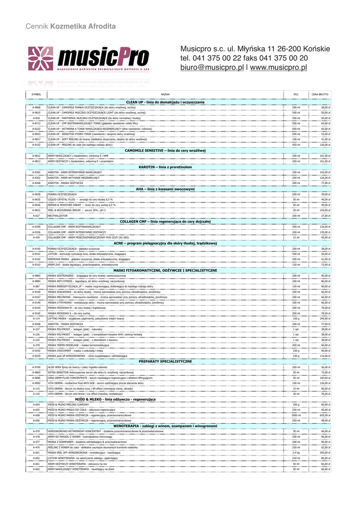 Cennik Kozmetika Afrodita Musicpro s.c. ul. Młyńska 11 26-200 Końskie tel. 041 375 00 22 faks 041 375 00 20 [email protected] | www.musicpro.pl SYMBOL NAZWA POJ. CENA BRUTTO CLEAN UP - linia do demakijażu i oczyszczania A-9808 CLEAN UP - CAMOMILE PIANKA OCZYSZCZAJĄCA (do skóry wrażliwej, suchej) 200 ml 38,00 zł A-9815 CLEAN UP - CAMOMILE MLECZKO OCZYSZCZAJĄCE LIGHT (do skóry wrażliwej, suchej) 500 ml 50,00 zł A-818 CLEAN UP - PANTHENOL MLECZKO OCZYSZCZAJĄCE (do skóry normalnej i tłustej) 500 ml 50,00 zł A-8713 CLEAN UP - CMF EKSTRANAWILŻAJĄCY TONIK (głębokie nawilżenie i efekt liftu) 500 ml 64,00 zł A-9222 CLEAN UP - WITAMINA A TONIK NAWILŻAJĄCO-REGENERUJĄCY (silne nawilżenie i odnowa) 500 ml 65,00 zł A-9810 CLEAN UP - SENSITIVE HYDRO TONIK (nawilżenie i ukojenie skóry wrażliwej) 500 ml 53,00 zł A-9817 CLEAN UP - SOFT PEELING do twarzy (delikatne złuszczanie, idealny do skóry wrażliwej) 100 ml 41,00 zł A-9152 CLEAN UP - PEELING do ciała (do każdego rodzaju skóry) 450 ml 126,00 zł A-9812 KREM NAWILŻAJĄCY z bisabololem, witaminą E i NMF 200 ml 101,00 zł A-9813 KREM ODŻYWCZY z bisabololem, witaminą E i ceramidami 200 ml 101,00 zł CAMOMILE SENSITIVE – linia do cery wrażliwej KAROTIN – linia z proretinolem A-9303 KAROTIN - KREM INTENSYWNIE NAWILŻAJĄCY 200 ml 103,00 zł A-9302 KAROTIN - KREM AKTYWNIE REGENERUJĄCY 200 ml 126,00 zł A-9268 KAROTIN - MASKA ODŻYWCZA 200 ml 77,00 zł AHA – linia z kwasami owocowymi A-9638 PIANKA OCZYSZCZAJĄCA 200 ml 39,00 zł A-9635 LIQUID CRYSTAL FLUID – emulsja do cery tłustej 6,5 % 50 ml 49,00 zł A-9636 REPAIR & MOISTURE CREAM – krem do cery suchej 6,5 % 50 ml 49,00 zł A-9631 PEEL & REJUVENING SERUM – serum 35% , pH 3 30 ml 154,00 zł A-627 NEUTRALIZATOR 200 ml 27,00 zł COLLAGEN CMF – linia regenerująca do cery dojrzałej A-9299 COLLAGEN CMF - KREM EKSTRANAWILŻAJĄCY 200 ml 126,00 zł A-9336 COLLAGEN CMF - KREM INTENSYWNIE ODŻYWCZY 200 ml 135,00 zł A-439 COLLAGEN CMF - KREM PRZECIWZMARSZCZKOWY POD OCZY (KC-005) 15 ml 69,00 zł ACNE – program pielęgnacyjny dla skóry tłustej, trądzikowej A-9160 PIANKA OCZYSZCZAJĄCA - głęboko oczyszcza 200 ml 38,00 zł A-9161 LOTION - stymuluje cyrkulację krwi, działa antyseptycznie, ściągająco 500 ml 50,00 zł A-9162 KREMOWA MASKA - głęboko oczyszcza, działa antyseptycznie, ściągająco 200 ml 61,00 zł A-9163 KREM ZnO - działa łagodząco, przeciwzapalnie, antyseptycznie 150 ml 73,00 zł MASKI FITOAROMATYCZNE, ODŻYWCZE I SPECJALISTYCZNE A-9883 MASKA ADSTRINGENS - ściągająca do cery tłustej i zanieczyszczonej 200 ml 90,00 zł A-9884 MASKA ANTI-STRESS - łagodząca, do skóry wrażliwej, naczynkowej 200 ml 86,00 zł A-887 MASKA ENERGETYZUJĄCA „R” – maska rozgrzewająca, dotleniająca do każdego rodzaju skóry 150 ml 90,00 zł A-9169 MASKA SZAŁWIOWA - do skóry tłustej - można wprowadzać przy pomocy ultradźwięków, jonoforezy 200 ml 66,00 zł A-9167 MASKA MELONOWA - intensywne nawilżanie - można wprowadzać przy pomocy ultradźwięków, jonoforezy 200 ml 66,00 zł A-9149 MASKA CYTRYNOWA - rewitalizacja skóry - można wprowadzać przy pomocy ultradźwięków, jonoforezy 200 ml 66,00 zł A-9164 MASKA MIODOWA M – do cery tłustej i trądzikowej 200 ml 78,00 zł A-9165 MASKA MIODOWA S – do cery suchej 200 ml 78,00 zł A-114 LIFTING MASKA - wyjątkowe ujędrnienie, pobudzenie mięśni twarzy 100 g 249,00 zł A-9268 KAROTIN - MASKA ODŻYWCZA 200 ml 77,00 zł A-227 MASKA POLYMOIST - kolagen (płat) - naturalny 1 szt. 38,00 zł A-226 MASKA POLYMOIST - kolagen (płat) - z kompleksem kwasów AHA i zieloną herbatą 1 szt. 38,00 zł A-225 MASKA POLYMOIST - kolagen (płat) - z ekstraktem z kawioru 1 szt. 38,00 zł A-278 MASKA TERMO MODELAGE – maska termomodelująca 450 ml 60,00 zł A-9242 MASKA CHOCOMINT - maska z czekoladą i miętą 250 g 90,00 zł A-9229 MASKA peel off WINOGRONOWA - silnie wygładzająca i odmładzająca 150 g 116,00 zł A-9709 ALOE VERA Spray do twarzy i ciała/ mgiełka odśwież. 200 ml 36,00 zł A-9803 EXTRA SENSITIVE Anticouperose serum dla skóry b. wrażliwej, naczynkowej 30 ml 73,00 zł A-9685 CERA DERM FLUID CONCENTRATE - serum nawilżająco-regenerujące z efektem liftingującym 30 ml 100,00 zł A-9992 VITA DERMA - multiactive fluid ANTI-AGE - serum opóźniające proces starzenia skóry 100 ml 126,00 zł A-115 VITA DERMA - Serum na okolice oczu / lift effect (zmniejsza cienie, obrzęki) 15 ml 90,00 zł A-116 VITA DERMA - Serum anti-stress / ice effect (nawilża, rewitalizuje) 30 ml 76,00 zł 60,00 zł PREPARATY SPECJALISTYCZNE MIÓD & MLEKO - linia odżywczo - regenerująca A-654 MIÓD & MLEKO PEELING CUKROWY 200 g A-655 MIÓD & MLEKO MASŁO DO CIAŁA - odżywczo-regenerujące 250 ml 95,00 zł A-658 MIÓD & MLEKO MASKA ODŻYWCZA - regenerująca, przeciwzmarszczkowa 2000 ml 655,00 zł A-656 MIÓD & MLEKO MASKA ODŻYWCZA - regenerująca, przeciwzmarszczkowa 250 ml 98,00 zł WINOTERAPIA - zabiegi z winem, szampanem i winogronami A-479 WINOGRONOWO-WITAMINOWY KONCENTRAT - działanie przeciwzmarszczkowe & przeciwstarzeniowe 30 ml 66,00 zł A-478 KREM DO MASAŻU Z WINEM - hydrolipidowa równowaga 200 ml 96,00 zł A-477 MASKA Z SZAMPANEM - działanie odmładzające & przeciwstarzeniowe 200 ml 96,00 zł A-476 PEELING Z WINEM do ciała - delikatne usunięcie obumarłych komórek naskórka 250 ml 62,00 zł A-651 MASKA PEEL OFF WINOGRONOWA - rewitalizująco - nawilżająca 2,4 kg 393,00 zł A-652 LOTION WINOTERAPIA- na zakończenie zabiegu- ujędrniający 250 ml 80,00 zł A-661 KREM ODŻYWCZY WINOTERAPIA - odżywczy na noc 50 ml 66,00 zł A-662 KREM NAWILŻAJĄCY WINOTERAPIA - nawilżający na dzień 50 ml 66,00 zł Cennik Kozmetika Afrodita MASAŻ - twarz i ciało A-608 MIGDAŁOWY OLEJEK – do masażu twarzy i ciała 500 ml 86,00 zł A-9660 LIPO-DRAIN - krem do masażu (lipolit & drainage effect) 450 ml 167,00 zł A-287 KREM DO MASAŻU – do masażu twarzy i ciała w/o 450 ml 71,00 zł A-9304 MIGDAŁOWY 