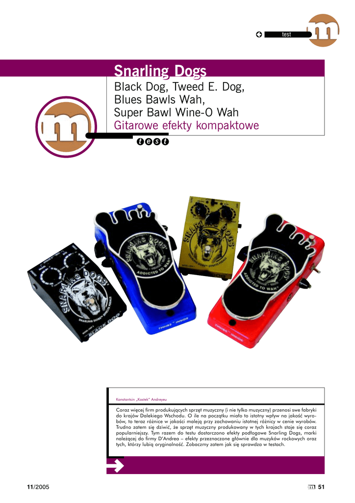 test Snarlingg Dogs g Black Dog, Tweed E. Dog, Blues Bawls Wah, Super Bawl Wine-O Wah Gitarowe efekty kompaktowe t e s t Kanstantsin „Kostek” Andreyeu Coraz więcej firm produkujących sprzęt muzyczny (i nie tylko muzyczny) przenosi swe fabryki do krajów Dalekiego Wschodu. O ile na początku miało to istotny wpływ na jakość wyrobów, to teraz różnice w jakości maleją przy zachowaniu istotnej różnicy w cenie wyrobów. Trudno zatem się dziwić, że sprzęt muzyczny produkowany w tych krajach staje się coraz popularniejszy. Tym razem do testu dostarczono efekty podłogowe Snarling Dogs, marki należącej do firmy D’Andrea – efekty przeznaczone głównie dla muzyków rockowych oraz tych, którzy lubią oryginalność. Zobaczmy zatem jak się sprawdza w testach. 11/2005 51 test efektu następuje za pomocą kolejnego przełącznika, znajdującego się w górnej części obudowy, obok pedału. Poziom przesterowania sygnału możemy płynnie regulować za pomocą potencjometru obrotowego OD/ DIST, znajdującego się w prawej ściance obudowy urządzenia. Zakres regulacji pozwala uzyskiwać zarówno ostre, szkliste, jak i ciepłe, nasycone, niczym przy użyciu lampowego przedwzmacniacza brzmienie. Poziom przesterowanego sygnału regulujemy za pomocą potencjometru BLUE DOO VOL. Blues Bawls Wah W modelu tym zawarto trzy rodzaje efektów typu wah. Urządzenie umieszczono w litej masywnej obudowie. Taki typ konstrukcji jest najlepszy pod względem wytrzymałości w warunkach użytkowania efektu na scenie. W dolnej części obudowy tradycyjnie znajdują się cztery gumowe nóżki. W tejże dolnej części umieszczono metalową płytkę zabezpieczoną gwintem. Usunięcie tej płytki umożliwia dostęp do pojemnika na 9-woltową baterię zasilającą. Sygnał z gitary wprowadzamy poprzez dedykowane niesymetryczne gniazdo wejściowe typu jack 1/4” znajdujące się na prawej bocznej ściance obudowy, na lewej umieszczono niesymetryczne gniazdo wyjściowe typu jack 1/4”, tuż obok niego umieszczono gniazdo służące do podłączenia zasilacza zewnętrznego. W górnej części obudowy umieszczono ruchomy pedał sterujący ustawieniem potencjometru obrotowego regulującego podstawowy parametr efektu. Pod nim, w przedniej części obudowy umieszczono przełącznik, za pomocą którego aktywujemy efekt wah. Płytę pedału wykonano w kształcie nawiązującym do odbicia bosej stopy. Górna jego powierzchnia pokryta jest warstwą gumy, a w centralnej części znajduje się logo producenta z wizerunkiem psa szczerzącego kły. W miejscu oczu psa umieszczono czerwone diody. Jedna z nich sygnalizuje uaktywnienie efektu wah, druga uaktywnienie przesteru Blue Dog. Testowane urządzenie umożliwia korzystanie z trzech typów efektu wah różniących się przede wszystkim zakresem działania efektu oraz ogólną zawartością częstotliwości środkowych w sygnale wyjściowym. Do wyboru trybów pracy efektu wah służy przełącznik obrotowy WAH SELECTOR znajdujący się w lewej ściance obudowy urządzenia. Możliwe ustawienia to: • WHITE ROOM – przy tym ustawieniu testowany efekt brzmi miękko, ciepło w sygnale 52 wyjściowym jest duża zawartość częstotliwości niskiego środka • VOO DOO – to ustawienie pozwala uzyskiwać brzmienie nasycone tonami środkowymi • SHAFT – przy tym ustawieniu testowany efekt pozwala uzyskiwać jaskrawe brzmienie efektu wah często spotykane w partiach rytmicznych wykonywanych na stratocasterach na czystych kanałach wzmacniaczy w muzyce funky. Głośność efektu wah możemy regulować za pomocą dedykowanego potencjometru obrotowego znajdującego się obok przełącznika WAH SELECTOR. Testowany efekt umożliwia również uzyskanie przesterowanego sygnału gitarowego. Uruchomienie tego Super Bawl Whine-O Procesor ten pozwala uzyskać dwanaście rodzajów brzmienia efektu wah. Urządzenie umieszczono w identycznej obudowie jak poprzednio opisywany efekt. Różnica jest oczywiście w kolorze, co widać na zdjęciach oraz w zawartości co słychać po podłączeniu. Typ obudowy, sposób umieszczenia gniazd, przełączników i potencjometrów jest podobny do poprzednio opisywanego modelu zatem skupimy się tylko na elementach różniących go od modelu opisanego powyżej. Super Bawl Whine-O podobnie jak poprzedni model umożliwia korzystanie z trzech podstawowych typów efektu wah: WHITE ROOM, VOO DOO oraz SHAFT . Każdy z nich może pracować w dwóch wersjach różniących się przede wszystkim poziomem sygnału wejściowego i charakterystyką brzmienia. 11/2005 test Głośniejsza i agresywniejsza wersja każdego z tych typów została nazwana przez producentów TESTOSTERONE, natomiast łagodniejsza ESTROGEN. Wyboru wersji dokonujemy za pomocą przełącznika HORMONE CONTROLS umieszczonego w prawej części obudowy urządzenia. Poziom głośności w każdej z tych wersji możemy regulować dedykowanym potencjometrem znajdującym się tuż przy przełączniku HORMONE CONTROLS. Dla każdej z wybranych wersji możemy wybrać jedną z dwóch odmian różniących się sposobem pracy całego urządzenia. w pierwszym z nich brzmienie efektu jest bardziej przezroczyste, a w drugim (załączającym drugi induktor do kreowania barwy) bardziej gęste. Wyboru dokonujemy za pomocą przełącznika przyciskowego umieszczonego w górnej części obudowy. W ten sposób możemy dostosować tryb pracy do sygnału wyjściowego z gitary oraz do rodzaju przetworników w gitarze. Ciekawostką w testowanych urządzeniach jest przełącznik umożliwiający pracę urządzeń w trybie BYPASS. Jest to prawdziwy mechaniczny przełącznik, którego zastosowanie gwarantuje minimalną ingerencją w sygnał gitarowy podczas gdy sygnał omija jedno z testowanych urządzeń. 11/2005 Black Dog Kolejne testowane urządzenie to kompaktowy procesor efektów służący do przesterowania sygnału gitarowego, umieszczone w metalowej obudowie wykończonej w kolorze czarnym. Od spodu obu
