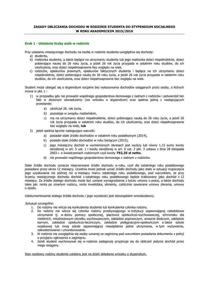 ZASADY OBLICZANIA DOCHODU W RODZINIE STUDENTA DO STYPENDIUM SOCJALNEGO W ROKU AKADEMICKIM 2015/2016 Krok 1 - Ustalenie liczby osób w rodzinie Przy ustalaniu miesięcznego dochodu na osobę w rodzinie studenta uwzględnia się dochody: a) studenta, b) małżonka studenta, a także będące na utrzymaniu studenta lub jego małżonka dzieci niepełnoletnie, dzieci pobierające naukę do 26 roku życia, a jeżeli 26 rok życia przypada w ostatnim roku studiów, do ich ukończenia, oraz dzieci niepełnosprawne bez względu na wiek, c) rodziców, opiekunów prawnych, opiekunów faktycznych studenta i będące na ich utrzymaniu dzieci niepełnoletnie, dzieci pobierające naukę do 26 roku życia, a jeżeli 26 rok życia przypada w ostatnim roku studiów, do ich ukończenia, oraz dzieci niepełnosprawne bez względu na wiek. Student może ubiegać się o stypendium socjalne bez wykazywania dochodów osiąganych przez osoby, o których mowa w pkt. c : 1) 2) w przypadku gdy nie prowadzi wspólnego gospodarstwa domowego z żadnym z rodziców i potwierdził ten fakt w złożonym oświadczeniu (we wniosku o stypendium) oraz spełnia jedną z następujących przesłanek: a) ukończył 26. rok życia, b) pozostaje w związku małżeńskim, c) ma na utrzymaniu dzieci niepełnoletnie, dzieci pobierające naukę do 26 roku życia, a jeżeli 26 rok życia przypada w ostatnim roku studiów, do ich ukończenia, oraz dzieci niepełnosprawne bez względu na wiek, lub jeżeli spełnia łącznie następujące warunki: a) posiadał stałe źródło dochodów w ostatnim roku podatkowym (2014), b) posiada stałe źródło dochodów w roku bieżącym (2015), c) jego miesięczny dochód w wymienionych okresach jest wyższy lub równy 1,15 sumy kwoty określonej w art. 5 ust. 1 i kwoty określonej w art. 6 ust. 2 pkt. 3 ustawy z dnia 28 listopada 2003 r. o świadczeniach rodzinnych czyli kwoty 792,35 zł netto. d) nie prowadzi wspólnego gospodarstwa domowego z żadnym z rodziców. Stałe źródło dochodu oznacza nieprzerwane źródło dochodu w roku, czyli dla ostatniego roku podatkowego posiadane przez okres 12 miesięcy. Uczelnia może jednak uznać źródło dochodu jako stałe w sytuacji rozpoczęcia jego uzyskiwania nie później niż w miesiącu marcu ostatniego roku podatkowego, pod warunkiem, że przy liczeniu miesięcznego dochodu dochód z ostatniego roku podatkowego będzie traktowany jako dochód z 12 miesięcy. Za źródło stałego dochodu może być uznane wynagrodzenie z tytułu umowy o pracę, a także dochody takie jak: renta po zmarłym rodzicu, renta inwalidzka, alimenty, cyklicznie zawierane umowy zlecenia, umowy o dzieło. Udokumentowanie stałego źródła dochodu i jego wysokości jest obowiązkiem wnioskodawcy. Sytuacje szczególne: 1. 2. 3. 4. Do rodziny nie wlicza się konkubenta studenta lub konkubenta członka rodziny. Do rodziny nie wlicza się członka rodziny przebywającego w instytucji zapewniającej całodobowe utrzymanie tj. w domu pomocy społecznej, placówce opiekuńczo-wychowawczej, schronisku dla nieletnich, młodzieżowym ośrodku wychowawczym, zakładzie poprawczym, areszcie śledczym, zakładzie karnym, zakładzie opiekuńczo-leczniczym, zakładzie pielęgnacyjno-opiekuńczym a także szkole wojskowej lub innej szkole zapewniającej nieodpłatnie pełne utrzymanie, w tym wyżywienie, zakwaterowanie i umundurowanie. W rodzinie nie uwzględnia się osoby uznanej za zaginioną pod warunkiem posiadania dokumentu z policji o przyjęciu zgłoszenia o zaginięciu. Jeżeli student wychowywał się w rodzinie zastępczej przyjmuje się do obliczeń jedynie dochód przez niego osiągany. Stan osobowy rodziny studenta ustalany jest na dzień składania wniosku o stypendium. Krok 2 - Ustalenie dochodu (zasady) W celu obliczenia wysokości dochodu w rodzinie sumuje się wszystkie dochody podlegające i niepodlegające opodatkowaniu uzyskane przez studenta i jego rodzinę w roku 2014. W przypadku dochodów podlegających opodatkowaniu do obliczeń przyjmuje się dochody w wysokościach netto. 1) Dochody opodatkowane podatkiem dochodowym od osób fizycznych Dochodem tym są przychody podlegające opodatkowaniu na zasadach określonych w art. 27 (podatek według skali podatkowej), art. 30b (podatek od dochodu m. in. z odpłatnego zbycia papierów wartościowych lub pochodnych instrumentów), art. 30c (podatek liniowy od dochodu z działalności gospodarczej) i art. 30e (podatek od dochodu z odpłatnego zbycia nieruchomości) ustawy z dnia 26 lipca 1991 r. o podatku dochodowym od osób fizycznych (Dz. U. z 2010 r. Nr 51, poz. 307, z późn. zm.), pomniejszone o koszty uzyskania przychodu, należny podatek dochodowy od osób fizycznych, składki na ubezpieczenia społeczne niezaliczone do kosztów uzyskania przychodu oraz składki na ubezpieczenie zdrowotne. Student ma obowiązek wykazania dochodu każdego członka rodziny, także swojego oraz rodzeństwa i dzieci jeśli w roku 2014 osiągnęły pełnoletność. 2) Dochody opodatkowane na podstawie przepisów o zryczałtowanym podatku dochodowym Wysokość dochodów opodatkowanych na podstawie przepisów o zryczałtowanym podatku dochodowym przyjmuje się w wysokości zadeklarowanej przez osobę, która taki dochód w roku 2014 osiągnęła. W przypadku prowadzenia działalności gospodarczej dochód deklarowany przyjęty do obliczeń powinien uwzględniać poniesione koszty działalności w tym również wysokość zryczałtowanego podatku dochodowego i zapłaconych składek na ubezpieczenie społeczne i zdrowotne. W przypadku uzyskiwania dochodów z tytułu najmu lub dzierżawy dochód zadeklarowany powinien uwzględniać zapłacony zryczałtowany podatek dochodowy. 3) Inne dochody niepodlegające opodatkowaniu Inne dochody, które nie podlegają obowiązkowi opodatkowania wykazujesz również w dochodzie rodziny. Do dochodów niepodlegających opodatkowaniu należą: • Dochody z gospodarstwa rolnego Za gospodarstwo rolne uważa się o