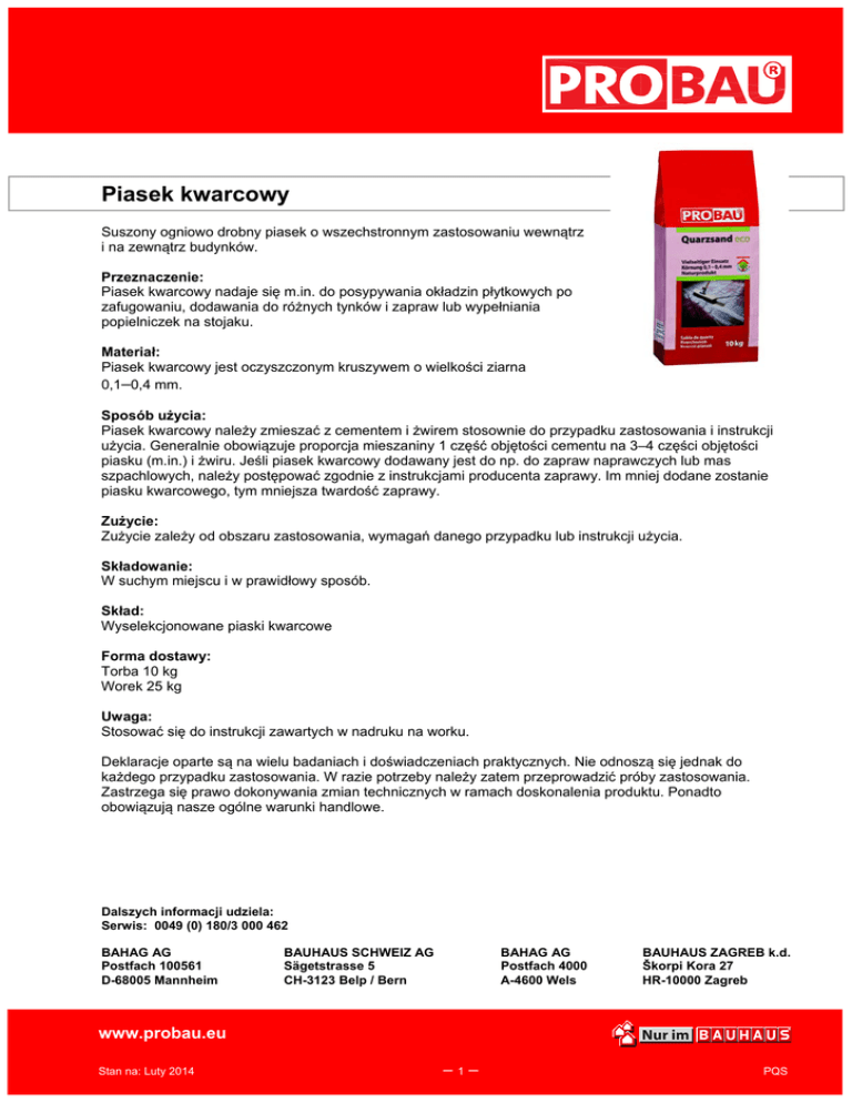 Piasek kwarcowy Suszony ogniowo drobny piasek o wszechstronnym zastosowaniu wewnątrz i na zewnątrz budynków. Przeznaczenie: Piasek kwarcowy nadaje się m.in. do posypywania okładzin płytkowych po zafugowaniu, dodawania do różnych tynków i zapraw lub wypełniania popielniczek na stojaku. Materiał: Piasek kwarcowy jest oczyszczonym kruszywem o wielkości ziarna 0,1–0,4 mm. Sposób użycia: Piasek kwarcowy należy zmieszać z cementem i żwirem stosownie do przypadku zastosowania i instrukcji użycia. Generalnie obowiązuje proporcja mieszaniny 1 część objętości cementu na 3–4 części objętości piasku (m.in.) i żwiru. Jeśli piasek kwarcowy dodawany jest do np. do zapraw naprawczych lub mas szpachlowych, należy postępować zgodnie z instrukcjami producenta zaprawy. Im mniej dodane zostanie piasku kwarcowego, tym mniejsza twardość zaprawy. Zużycie: Zużycie zależy od obszaru zastosowania, wymagań danego przypadku lub instrukcji użycia. Składowanie: W suchym miejscu i w prawidłowy sposób. Skład: Wyselekcjonowane piaski kwarcowe Forma dostawy: Torba 10 kg Worek 25 kg Uwaga: Stosować się do instrukcji zawartych w nadruku na worku. Deklaracje oparte są na wielu badaniach i doświadczeniach praktycznych. Nie odnoszą się jednak do każdego przypadku zastosowania. W razie potrzeby należy zatem przeprowadzić próby zastosowania. Zastrzega się prawo dokonywania zmian technicznych w ramach doskonalenia produktu. Ponadto obowiązują nasze ogólne warunki handlowe. Dalszych informacji udziela: Serwis: 0049 (0) 180/3 000 462 BAHAG AG Postfach 100561 D-68005 Mannheim BAUHAUS SCHWEIZ AG Sägetstrasse 5 CH-3123 Belp / Bern BAHAG AG Postfach 4000 A-4600 Wels BAUHAUS ZAGREB k.d. Škorpi Kora 27 HR-10000 Zagreb www.probau.eu Stan na: Luty 2014 –1– PQS